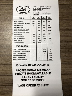这家也是好评比较多的连锁按摩 价格和Health Land相比会平价一些 我去的这家店就在Siam Square 他们家一进去就有很好闻的味道 像是青草药膏又像柠檬草 强烈推荐肩颈背按摩!!! 会先按摩+精油+草药热敷 做完整个人立刻恢复元气! 去的是Chong Nonsi站附近的门店,泰式按摩很舒服能缓解一天下来的肌肉酸疼(按摩小妹按得很卖力就是偶尔聊聊天),足部按摩只能算一般,(泰式+足部=700珠,套餐优惠了50珠)对比价格下来是值得推荐的门店。 PS:想去服务体验好,按摩舒服,环境又舒适的话可以去四面佛隔壁的CentralWorld商场4楼的Thann按摩门店,那才是享受的体验(14000珠 脸部+全身去角质+全身按摩 2人套餐),一分钱一分货。 图片附上Lek的价目小单。End