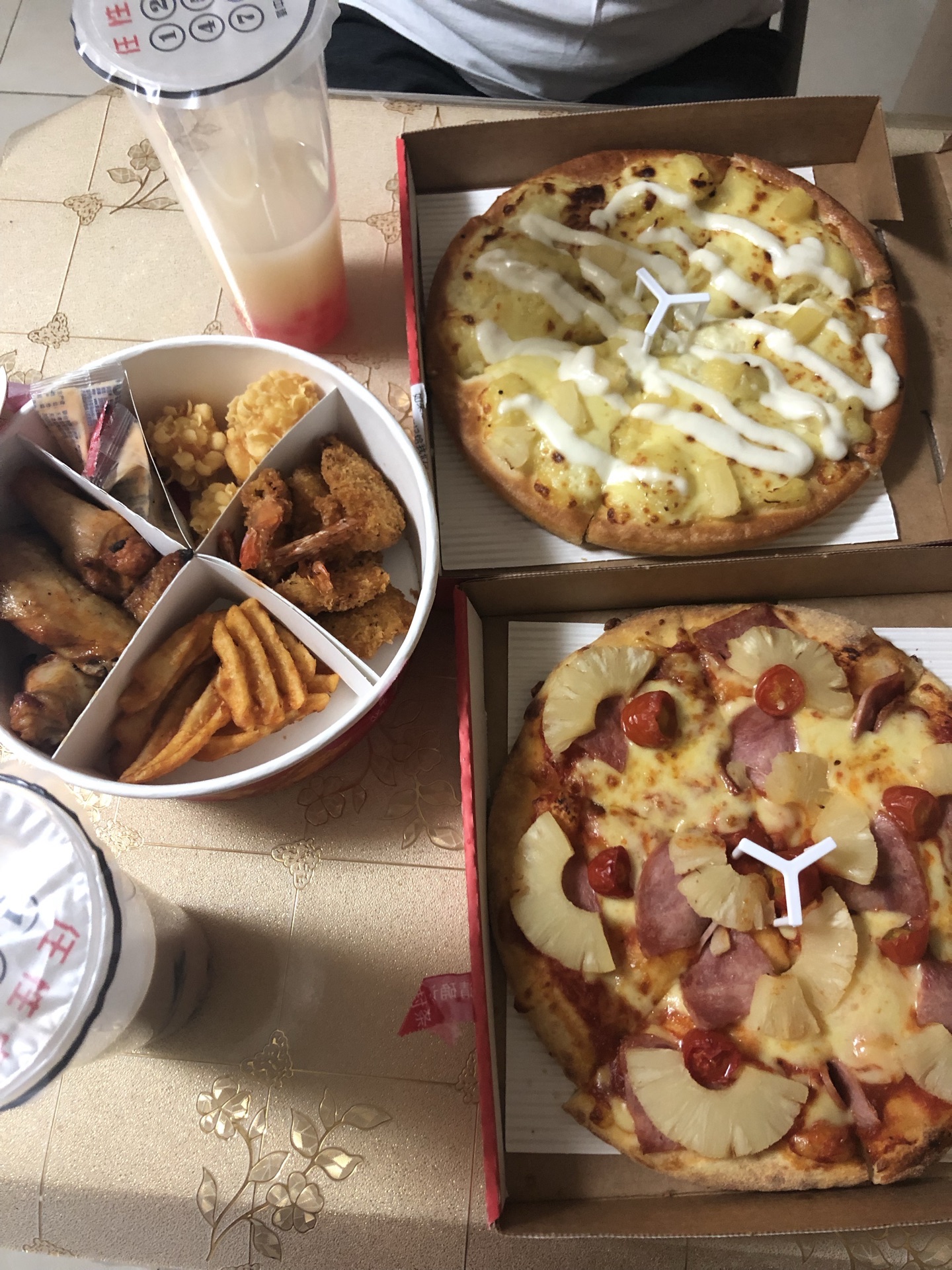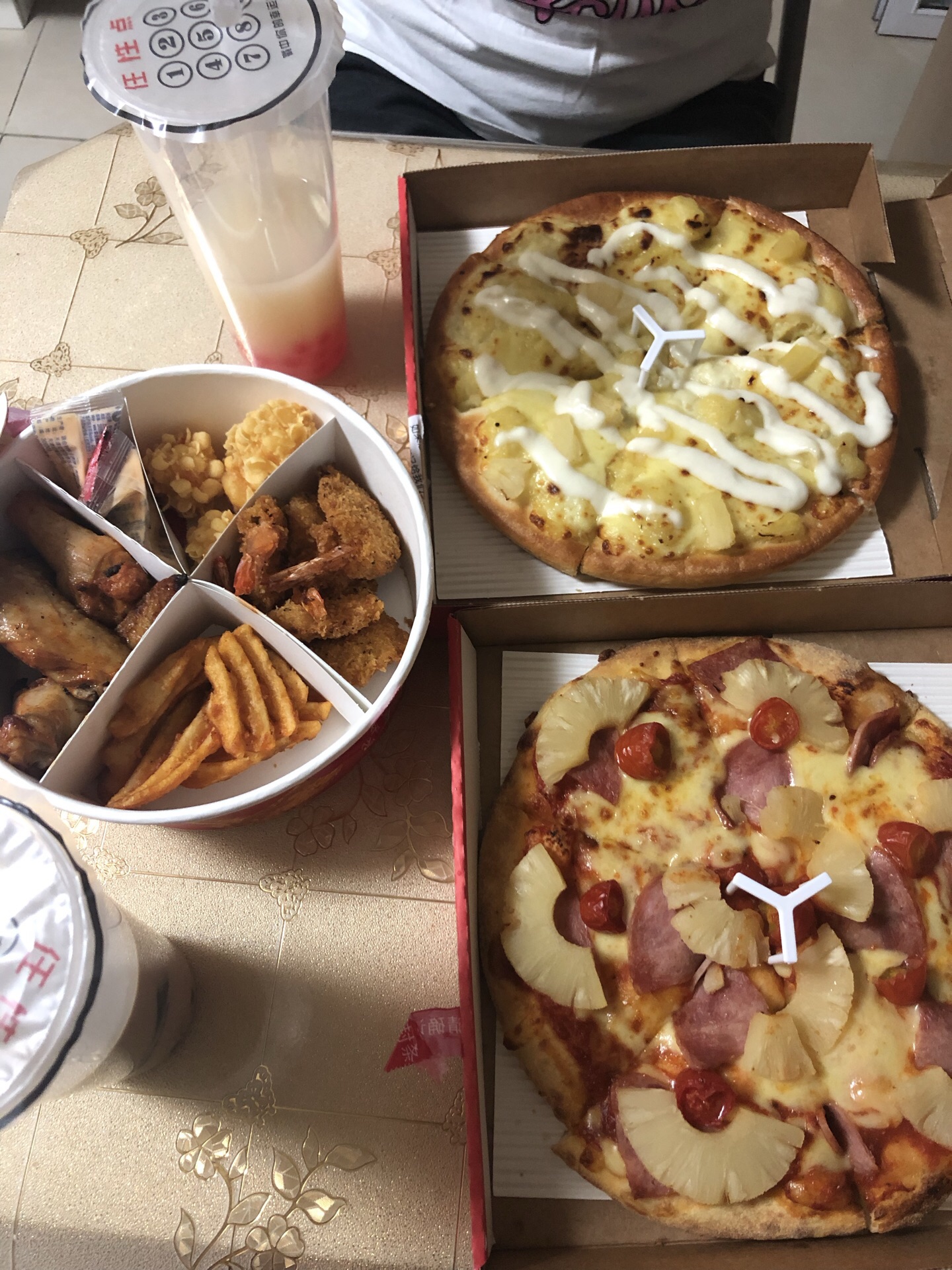 点的外卖,奶茶是别家的。用必胜客app点了外卖,618活动送披萨、送烤翅,还有满减,很划算,第一次用app点餐,送餐速度也很快,快递小哥贴心负责。榴莲披萨很不错,虾球也很好吃。榴莲披萨和夏威夷披萨都有菠萝,有些重复了。