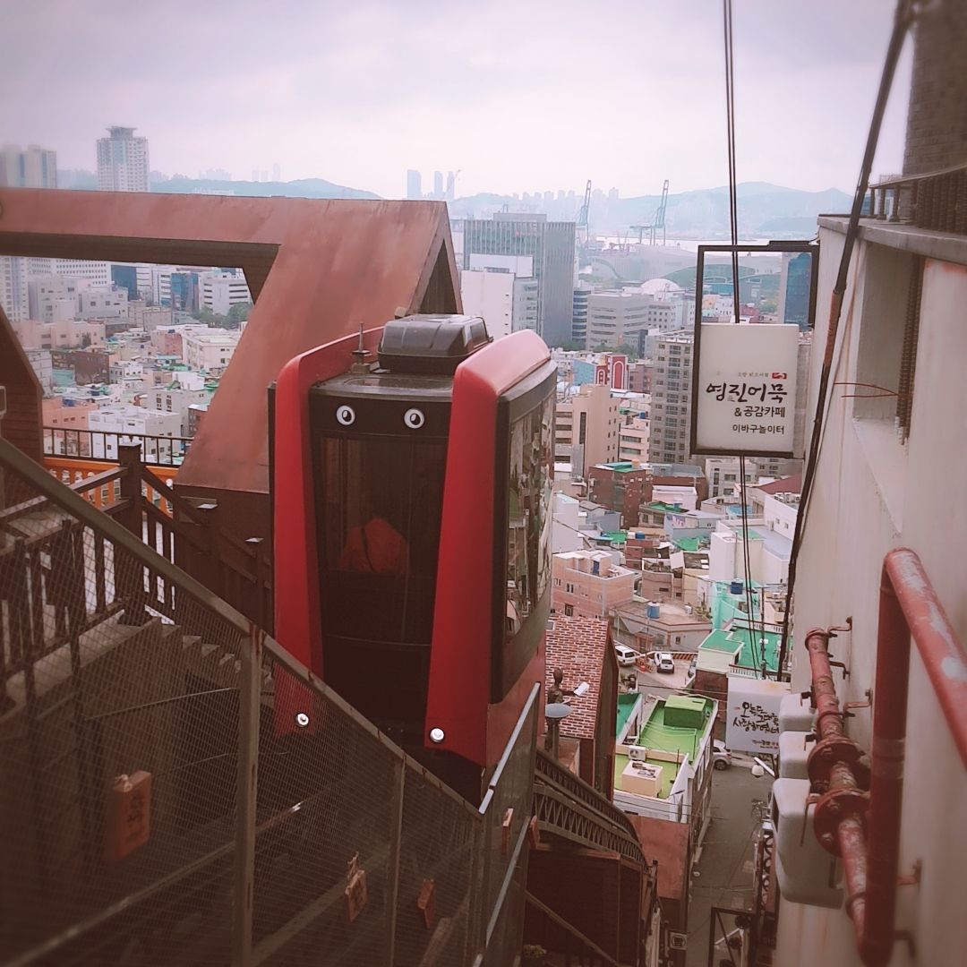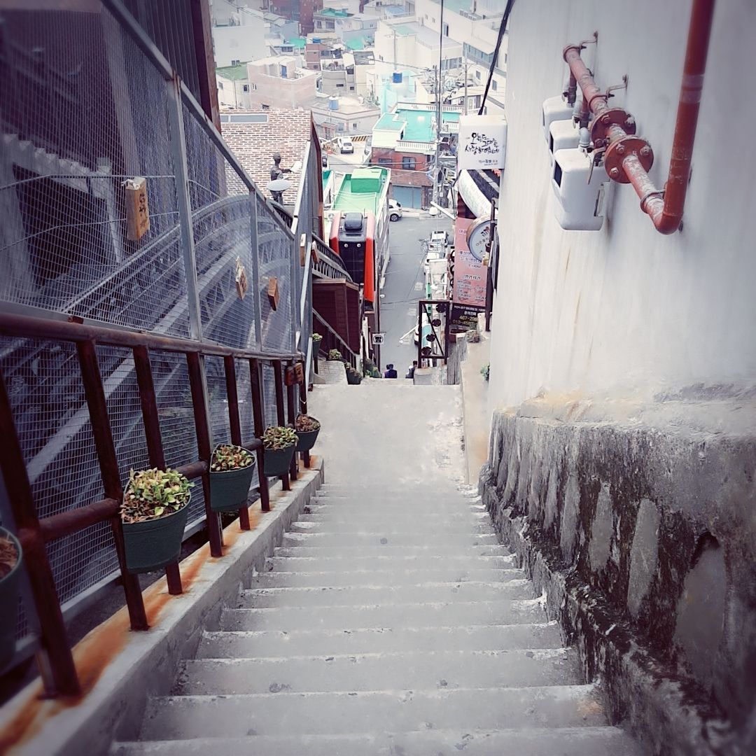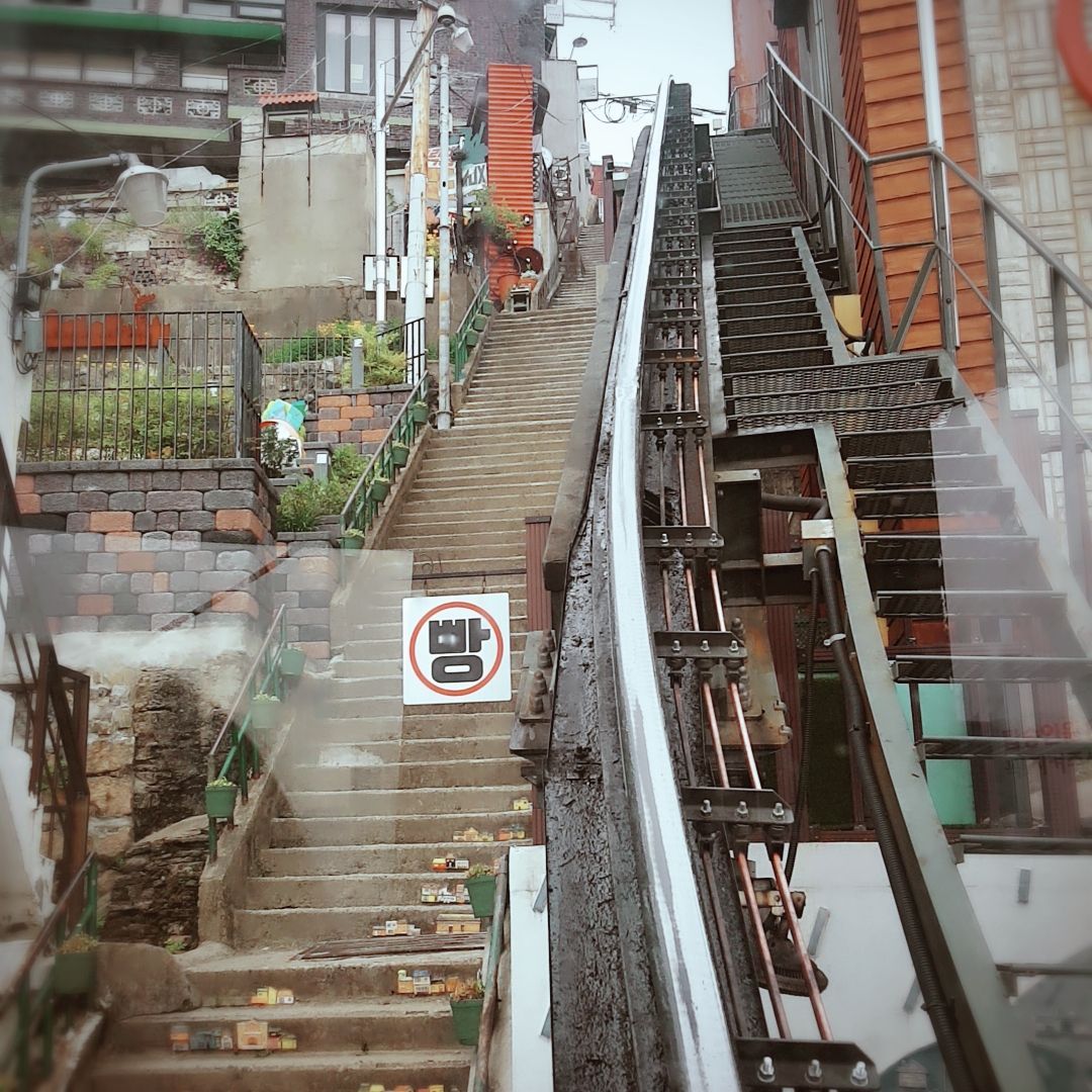 168台阶,位于釜山站对面,那条街区的,标识不是很清楚,但是你可以将图片给这些附近居民看一看他们就会指路。168台阶的起点是在一个教堂附近,从那里开始,有一些壁画雕塑等装饰,你就知道到了景点,这个小景点实际上就是一个特别陡居民生活区,为了方便居民在这里安装了一个单轨小电车,当然是免费的,有一个老爷爷在那里维护,爬上去以后可以看到,釜山的城市景色,这个景点人很少,还蛮好拍照的,我觉得,还满不错,时间宽裕的话可以来走走。