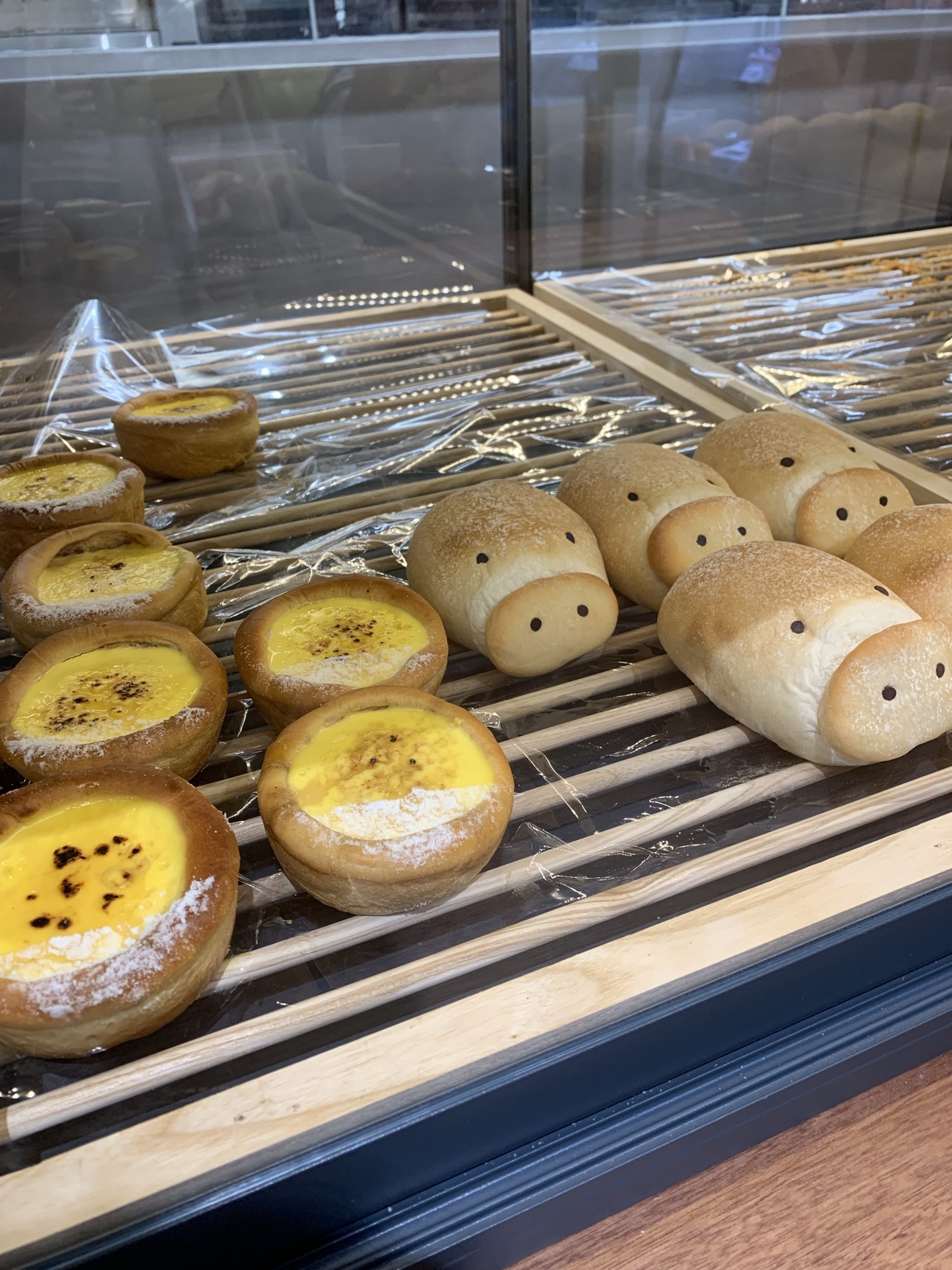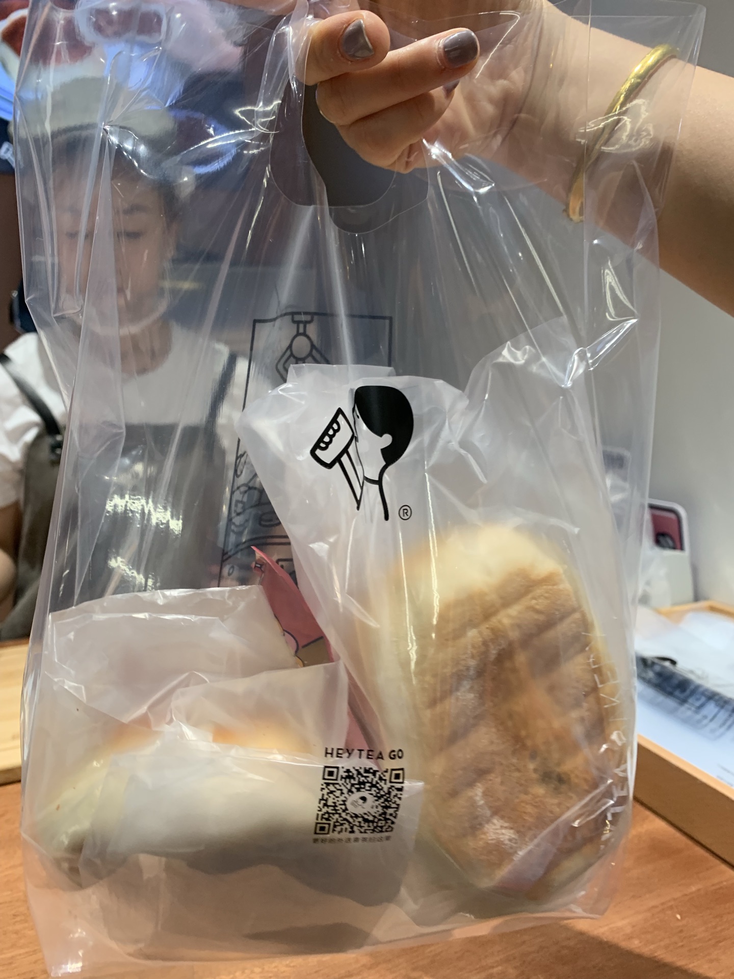 这家喜茶是新开的,而且是我第一次在喜茶店里面看到有面包卖,而且面包的造型都非常可爱,有小猪的,还有小龙虾的,觉得小猪的样子更可爱一点,就买了一个尝尝,总的来说口感还是不错的,还买了一款推荐的人很多的一款,两款的味道都挺好的。