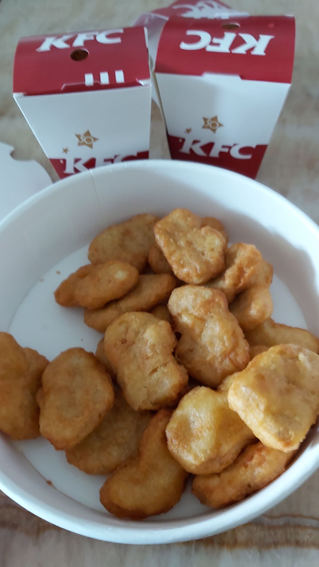 今天小孩特别说了一句,想吃肯德基,于是买了一些美食回来今天小孩特别说了一句,想吃肯德基,于是买了一些美食回来。一份特价黄金鸡块,19.9可以买20个,太划算了。两个大份鸡米花,也是特价,买一赠一,两杯桃子味咖啡,也是特价,今天应该说非常实惠,希望肯德基多做优惠活动。