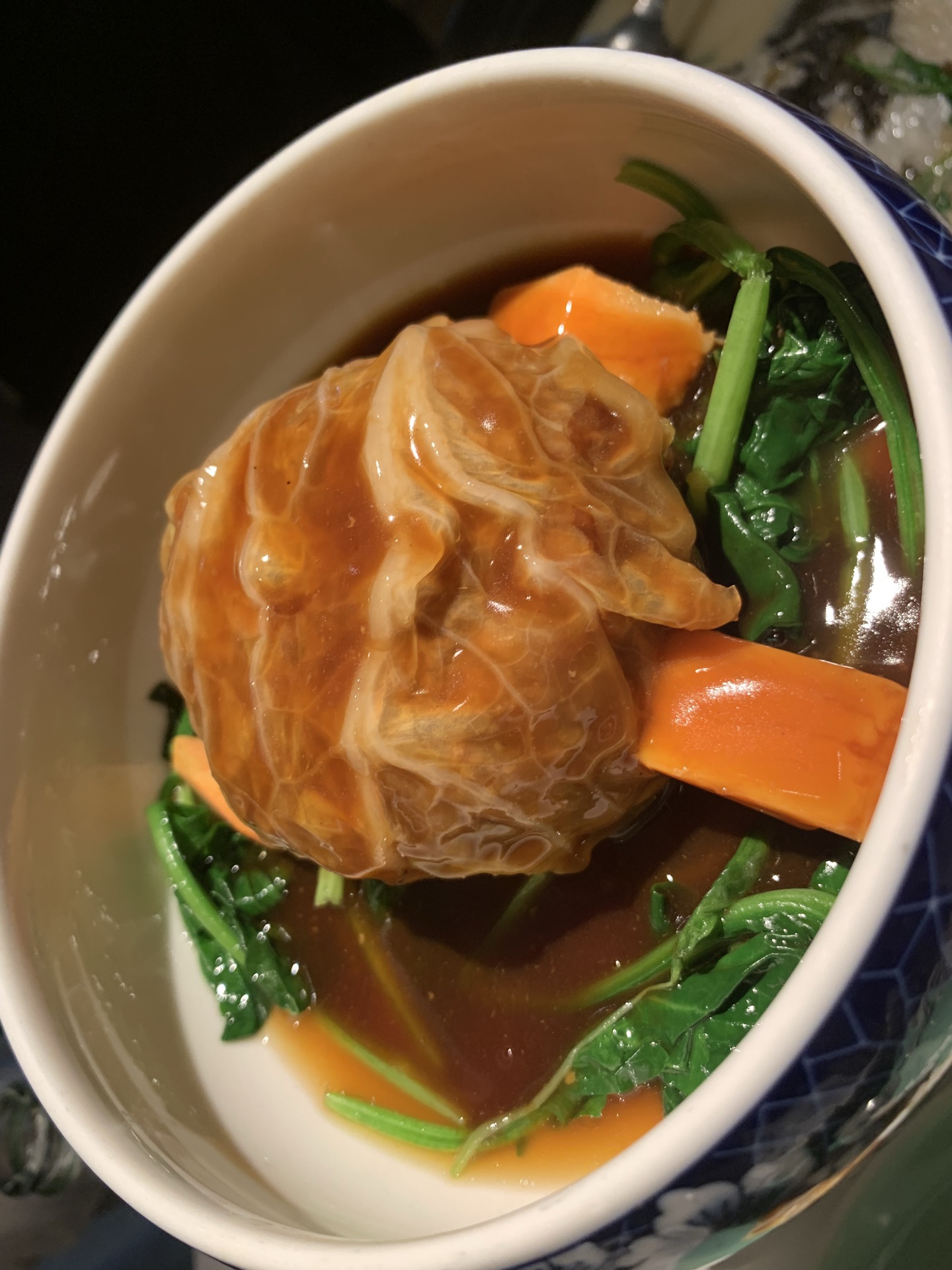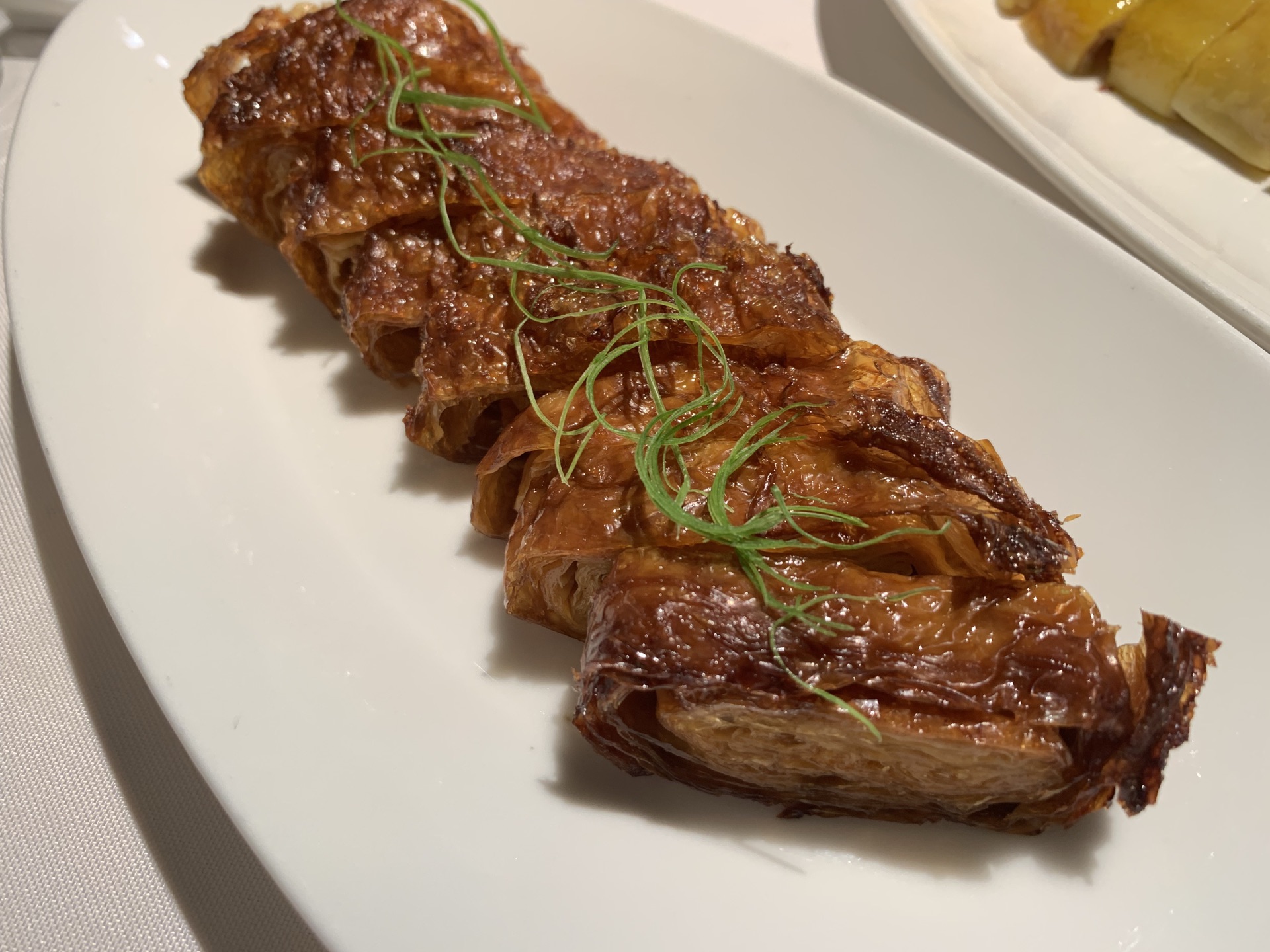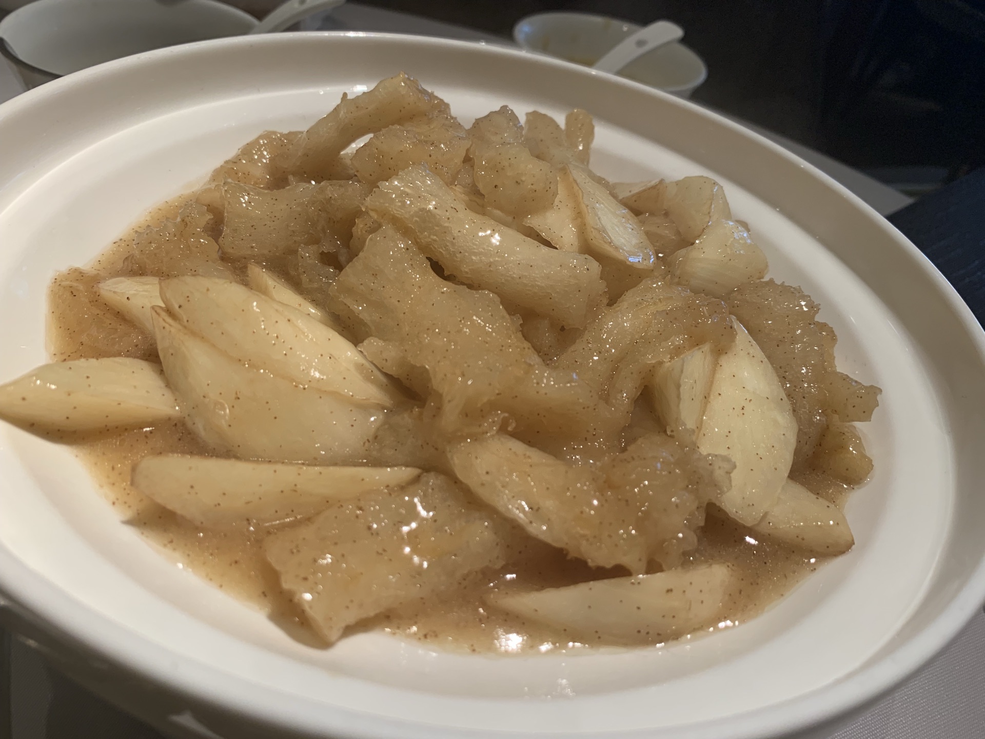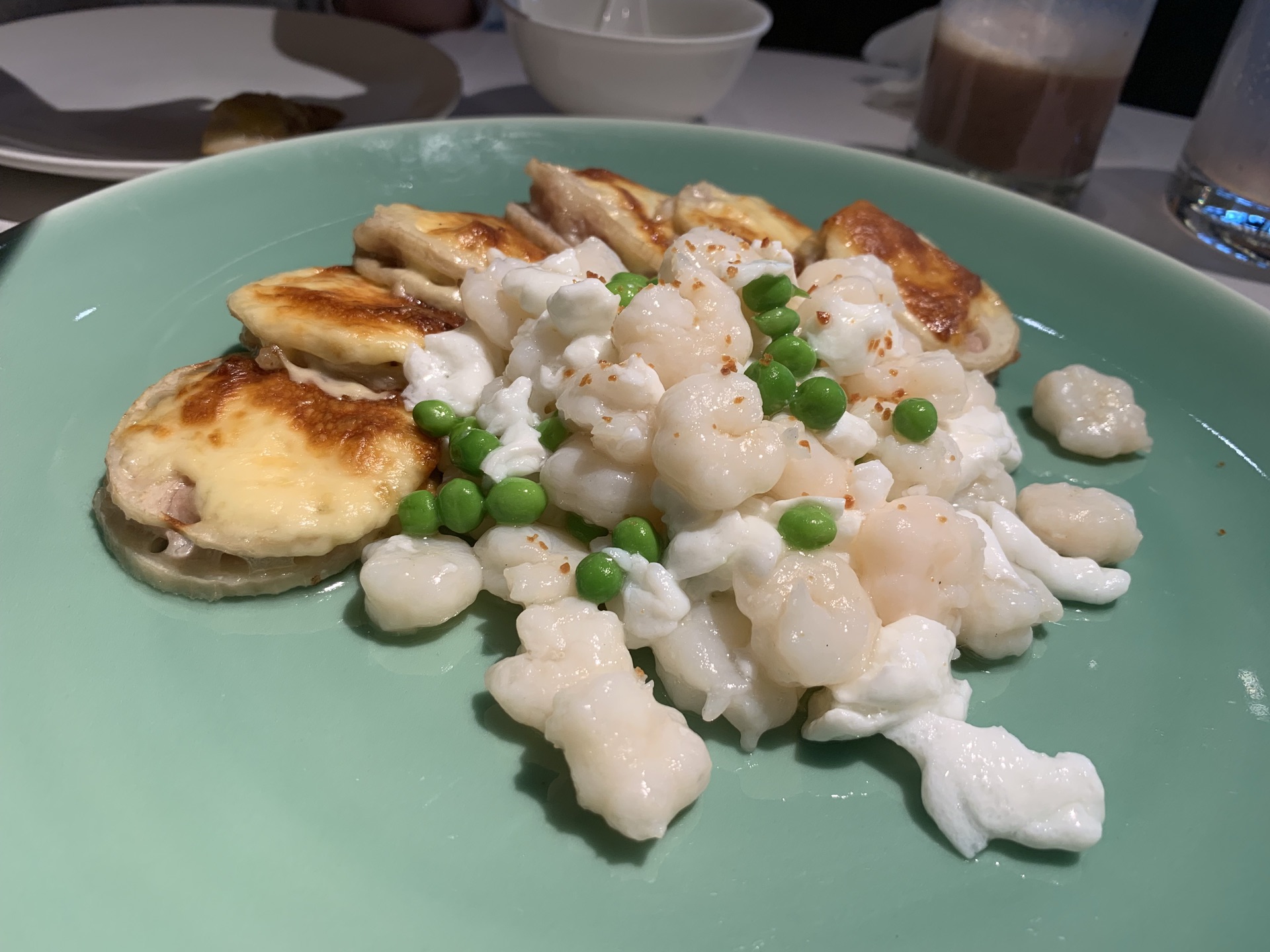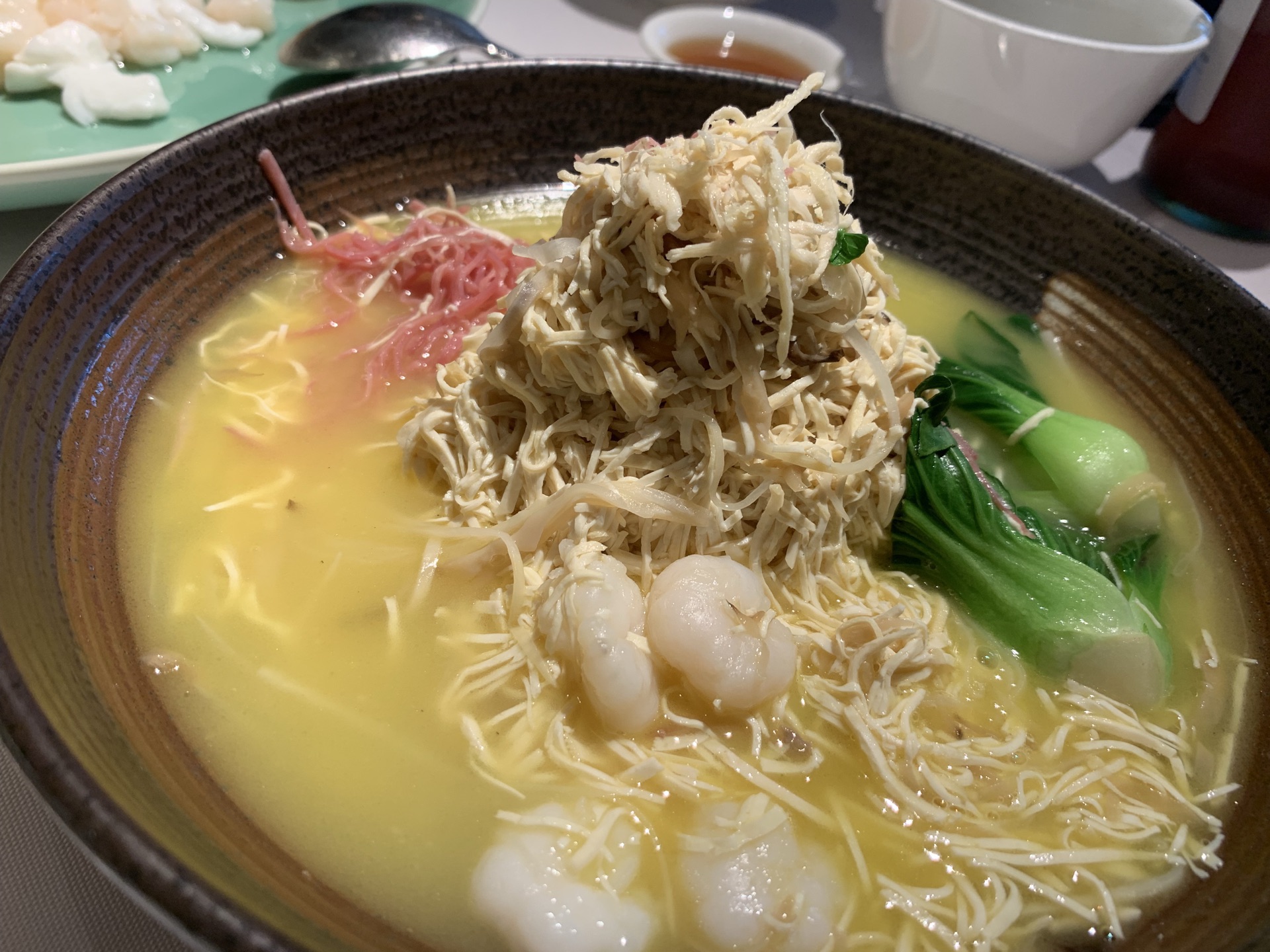 中午,没有预约,还好不需要排队,有座位。 虽然在大堂,基本满席,但是相对安静,大家都专注在美食中。 他家口味很符合江浙沪一带的朋友,摆盘也很好看,服务也很不错。 我们4个人点了午市的4人经典套餐,根本吃不完。 推荐: #温泉蛋白芦笋,口味清蛋; #芙蓉河虾仁拼芝士藕饼,芝士藕饼香,虾仁鲜嫩; #佛门素鸭,有点酱甜口味; #豆汁鱼头煲,鱼头炖的不错,汤也很好喝,不过略有点油,加点胡椒粉喝。 #鲳鱼焖饭,很香,可惜实在吃不下啦,强吃了2-3口。