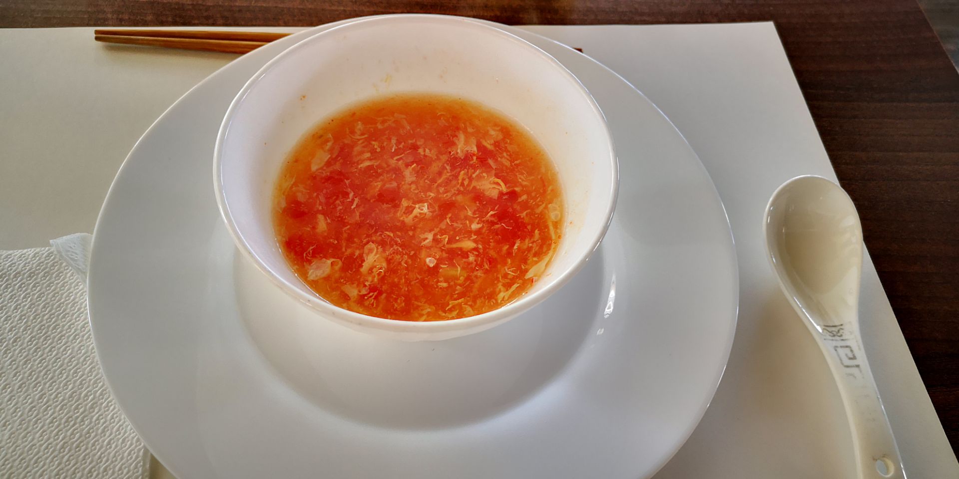 好不容易找到一个,赶紧慰劳一下自己的中国胃,上菜还是按照西餐的顺序先上汤,这个番茄蛋花汤有点西...