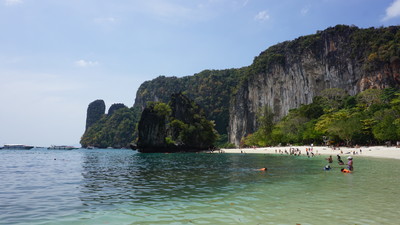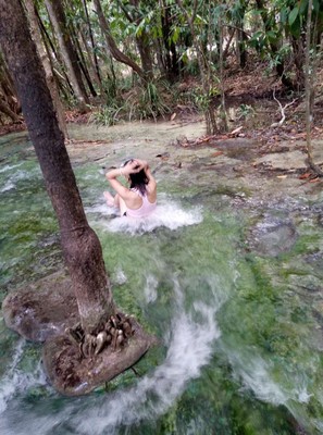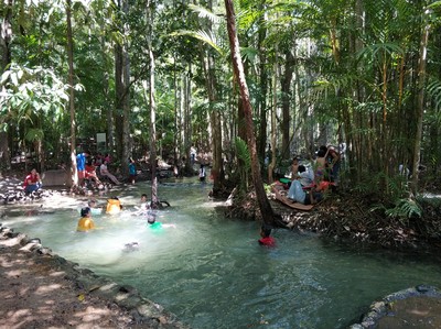 上次跟团没有玩够翡翠池,所以这次再来一次甲米,就为了玩这个翡翠池。 说实在此行有点失望,除了那个翡翠池还有一个蓝湖,但是进去看也就是一个类似九寨沟水的感觉,那个池子非常小,而且有点脏,没有九寨沟那么漂亮,其实翡翠湖也就是一个天然游泳池没有什么好玩的,但是他旁边流过树根的地方躺着玩水非常好玩,整个国家森林公园其实也没有什么特别的,只是空气比较新鲜,这样的风景在我们中国比比皆是。感觉大老远包车来有点浪费。泰国人来游玩的很多,因为他们的门票只是我们的十分之一才10块钱。小孩两块。包车从甲米镇来2000b 除了水和水果,不许带食物进去,出来饥肠辘辘,建议自带食物,门口的鸡腿肉串不卫生,特别是出来右手边第二家,见后面两张图,态度很差,没有买时笑嘻嘻,买了吃到鸡腿里面是生的,让她重烤,很不耐烦,我没有说她,她还骂骂咧咧的,才烤一下就给我,让她烤久一点,她猛的把鸡腿摔到桌子上都脏了。还骂人。 肉仔细闻是臭的,估计是有问题的鸡。丢给狗,狗都不吃。