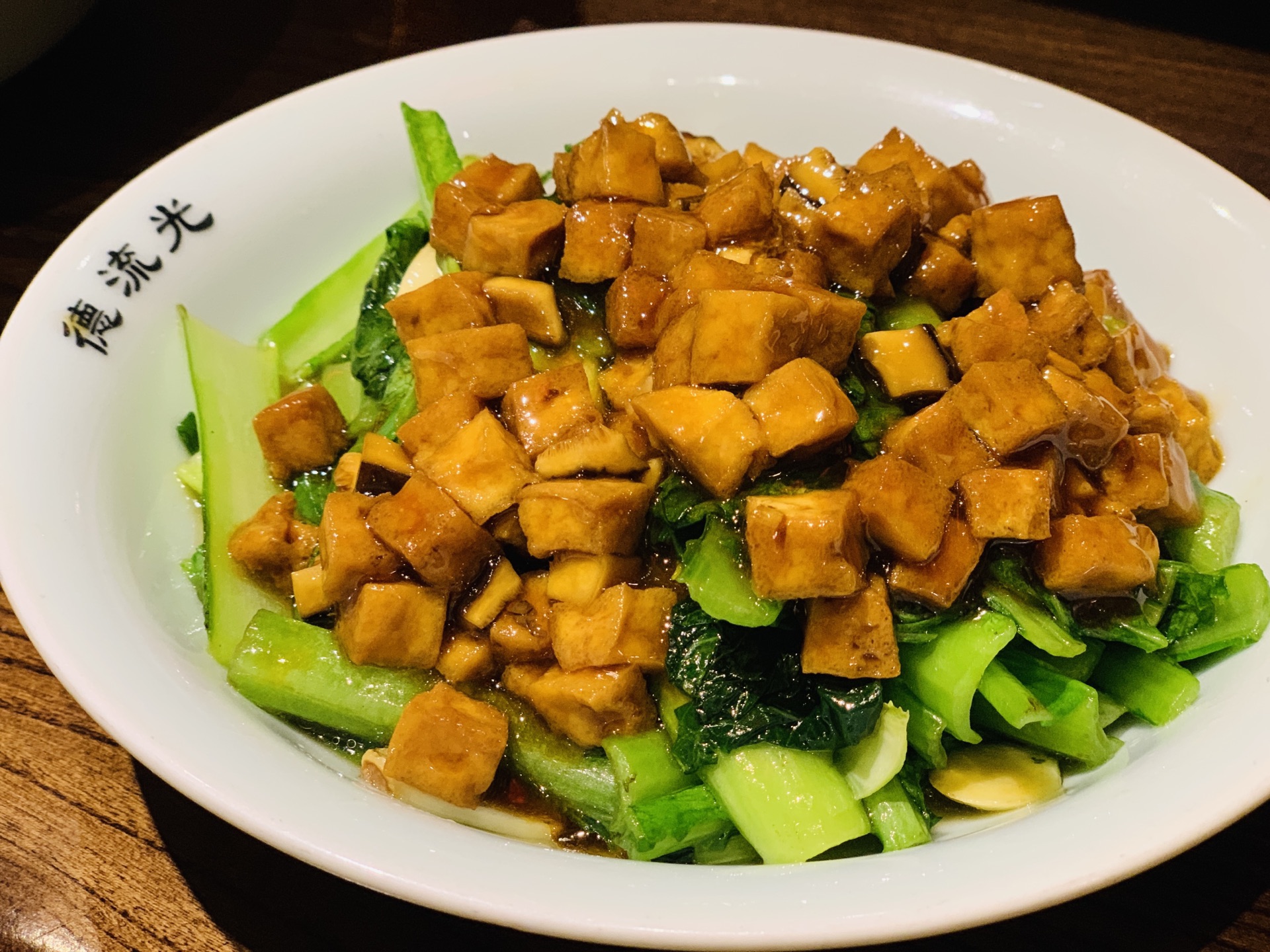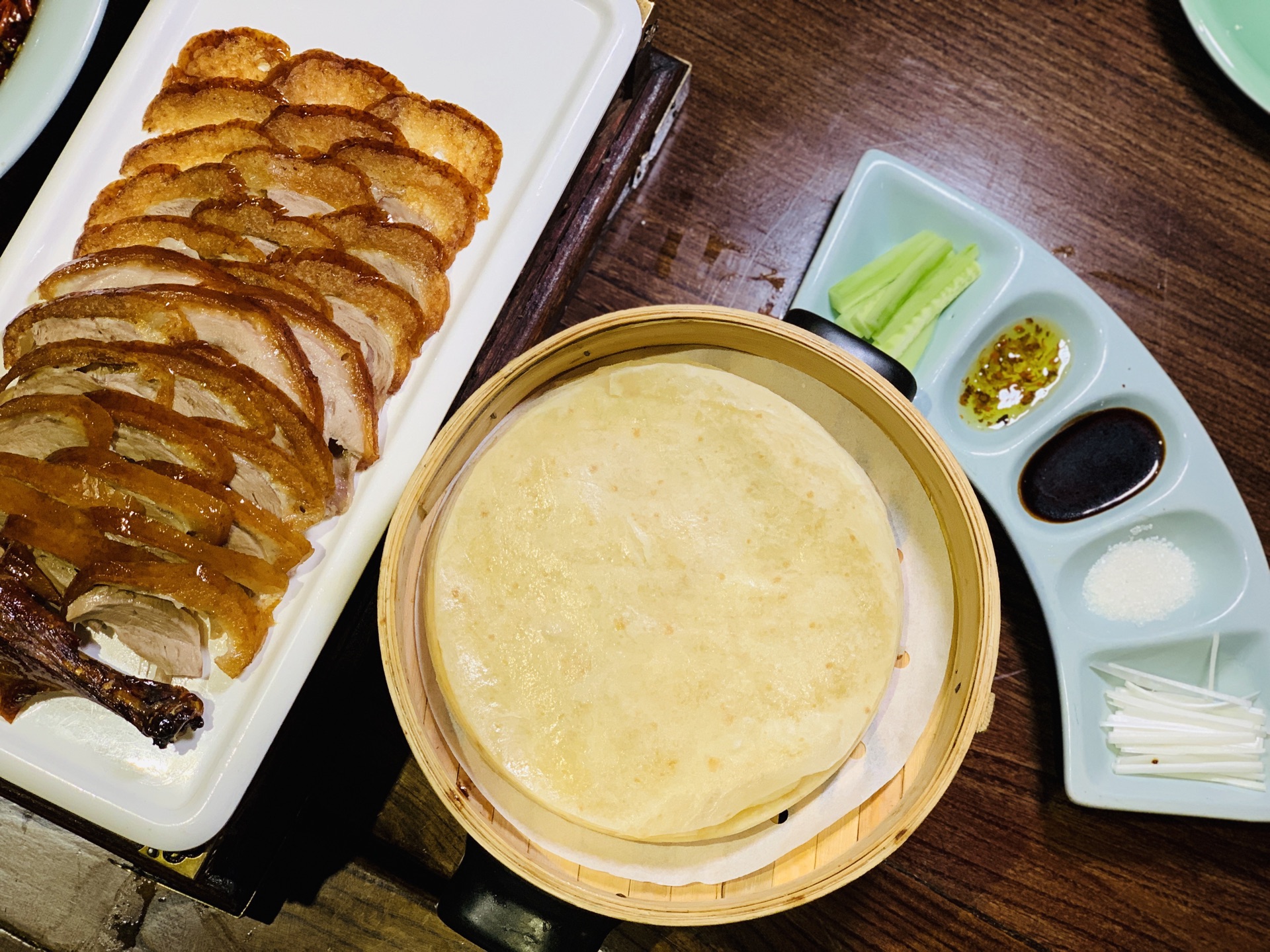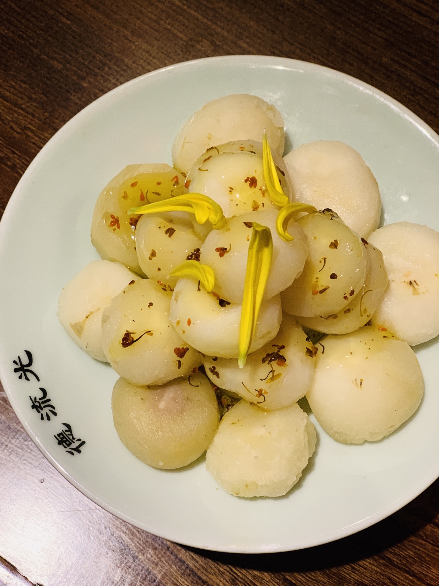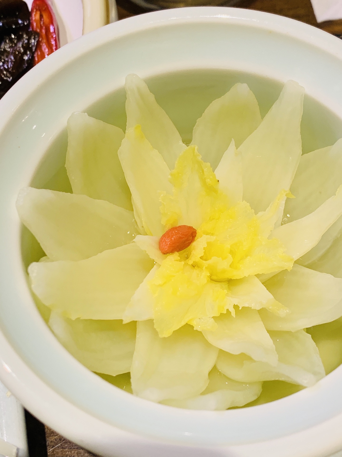 许久没有来地安门了,人潮依旧汹涌,雨后的古建别有一番韵味。 穿过沿街叫卖的人群,找到了烟袋斜街斜对面的德流光。古色古香的门脸儿和装饰透着一股子亲切感。排队时候发现门口的小胖鱼,嘟嘟嘴,蠢萌可爱,一问才知道居然是叫福猫鱼,猫和鱼的合并体么? 居然许多还是宫廷菜的做法和改良,味道也是颇有讲究。 最创意的是百日夫妻,名字很莫名,但吃过后就会顿悟出道理:似海深(参)葱烧海参的技法,海参换做了猪蹄。软滑的肉皮葱香浓郁,咸鲜美味。 居然还在这里遇到久违的一道名菜:开水白菜。开水、清汤在当今都默认是无色无味的白开水。其实在讲究吃喝的古代,完全是一个高级的吃法,这就要提到提清术。由猪鸡牛海鲜等等肉泥慢火熬制,再用鸡胸等肉白扫慢煮,清浊分离。最后加上细雕的白菜芯,看似平凡,却低调奢华有内涵