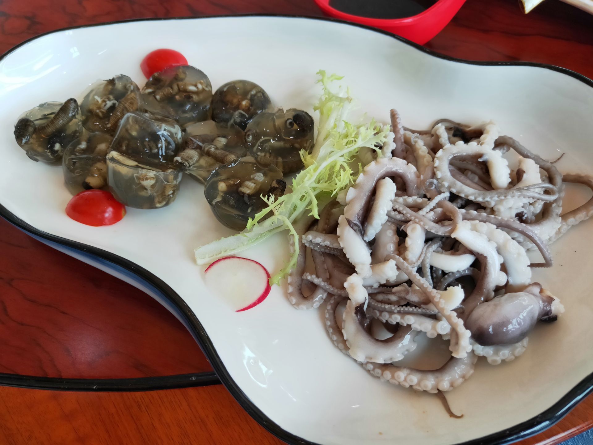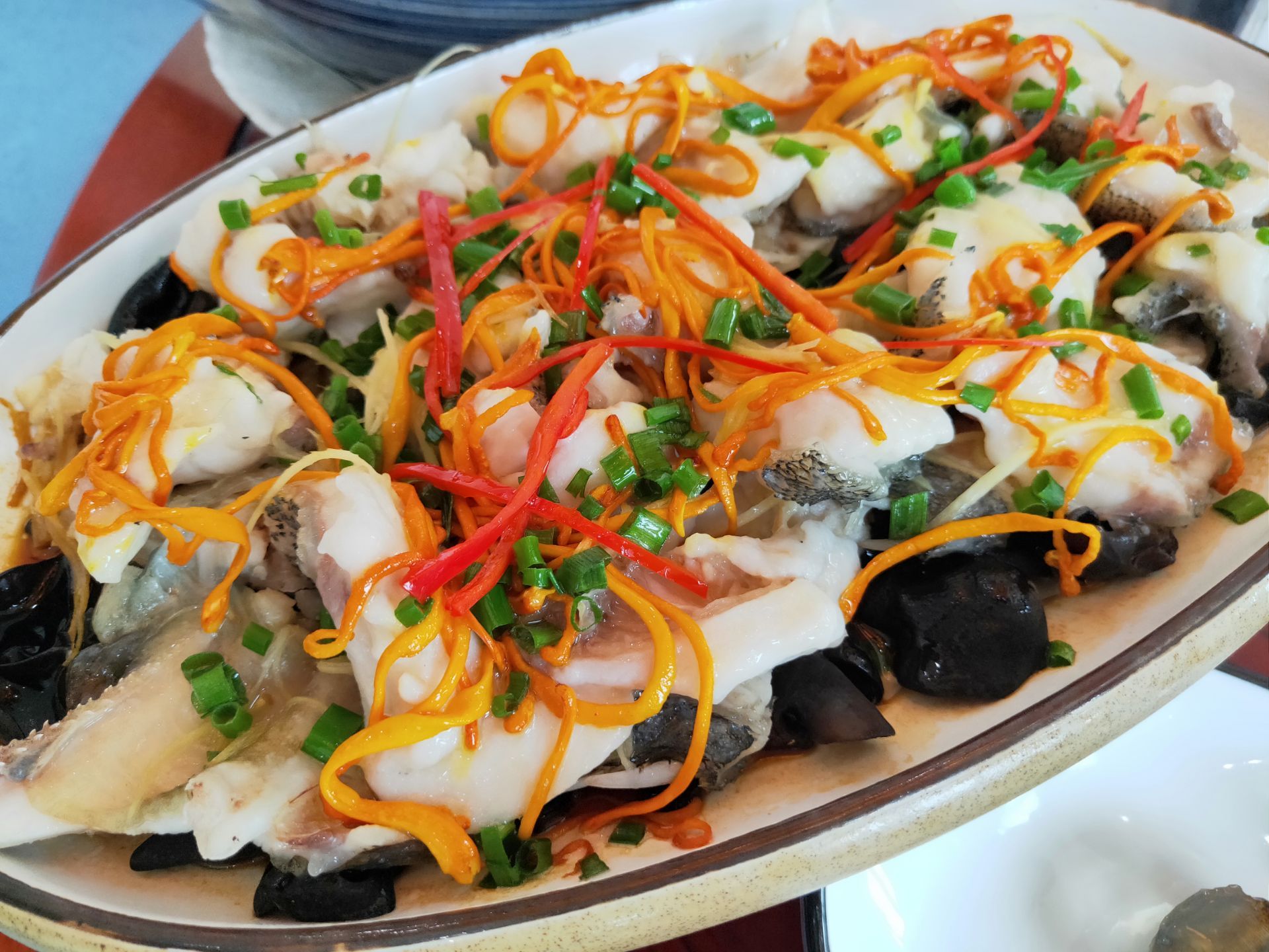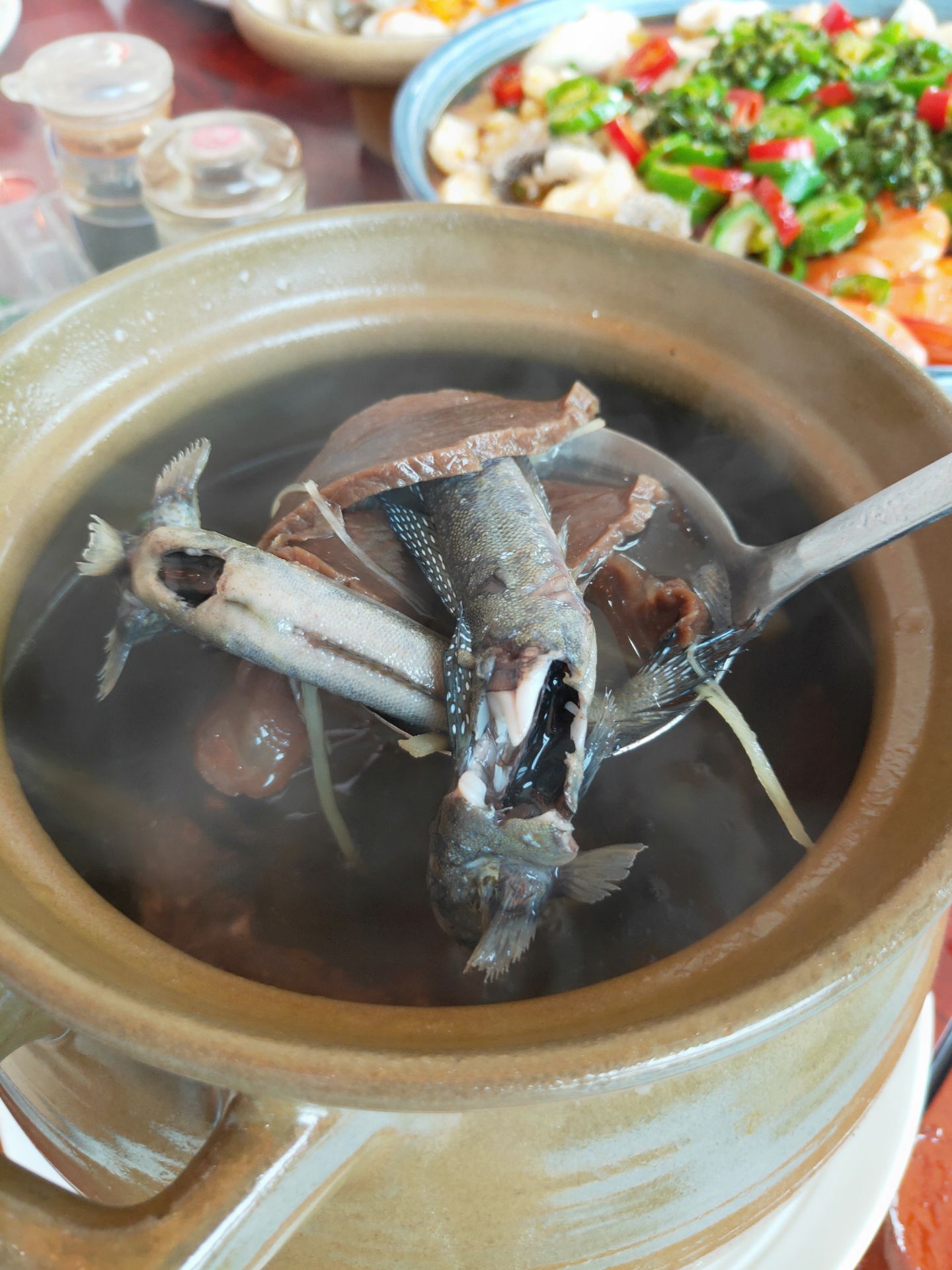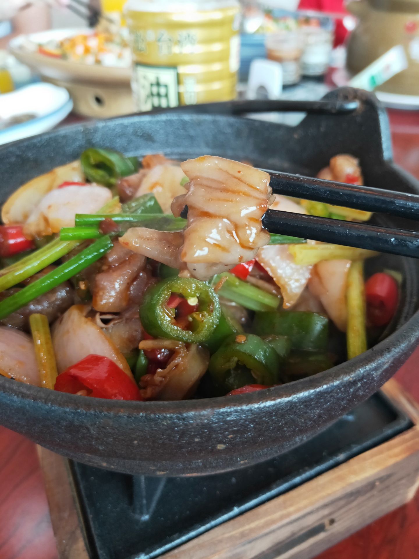 说到渔人码头许多人都知道这家是海沧最大生意最好的餐厅,得天独厚的地理位置,在海沧大桥下面可观海景,看船只从海面行驶,桥上汽车穿梭左右,时不时地有飞机从空中飞过,以前来过是傍晚时分坐在室外的露天吃饭,可欣赏海陆空大景观,印象深刻。不过,我们这次是坐在室内可以观海景的包厢,环境非常好。 海沧渔人码头的土笋冻很出名,来一份土笋冻和白灼章鱼当开胃菜特别的清爽。 最喜欢烤羊排,羊排烤的看似比较干,但是吃起来却香脆美味,口感特别好,和一般的烤羊排截然不同。 黑椒小牛肉:牛肉小块与青椒、红椒、大葱、藤椒爆炒,味道好,牛肉特别细嫩,吃起来甚是雪花牛肉的口感。 渔人码头的招牌菜群英会,汇集了鲜大虾、鱿鱼、鱼片和各种蔬菜,分量超大,食材很给力,一份群英会汇把主要海鲜的各种美味汇集在一起,荤素搭配,香辣鲜美。 主食海鲜炒饭也是看得到食材很给力,虾仁、鱿鱼、香菇等,好吃看得见,米饭粒粒分明、口感扎实,炒得香喷喷的,非常赞。