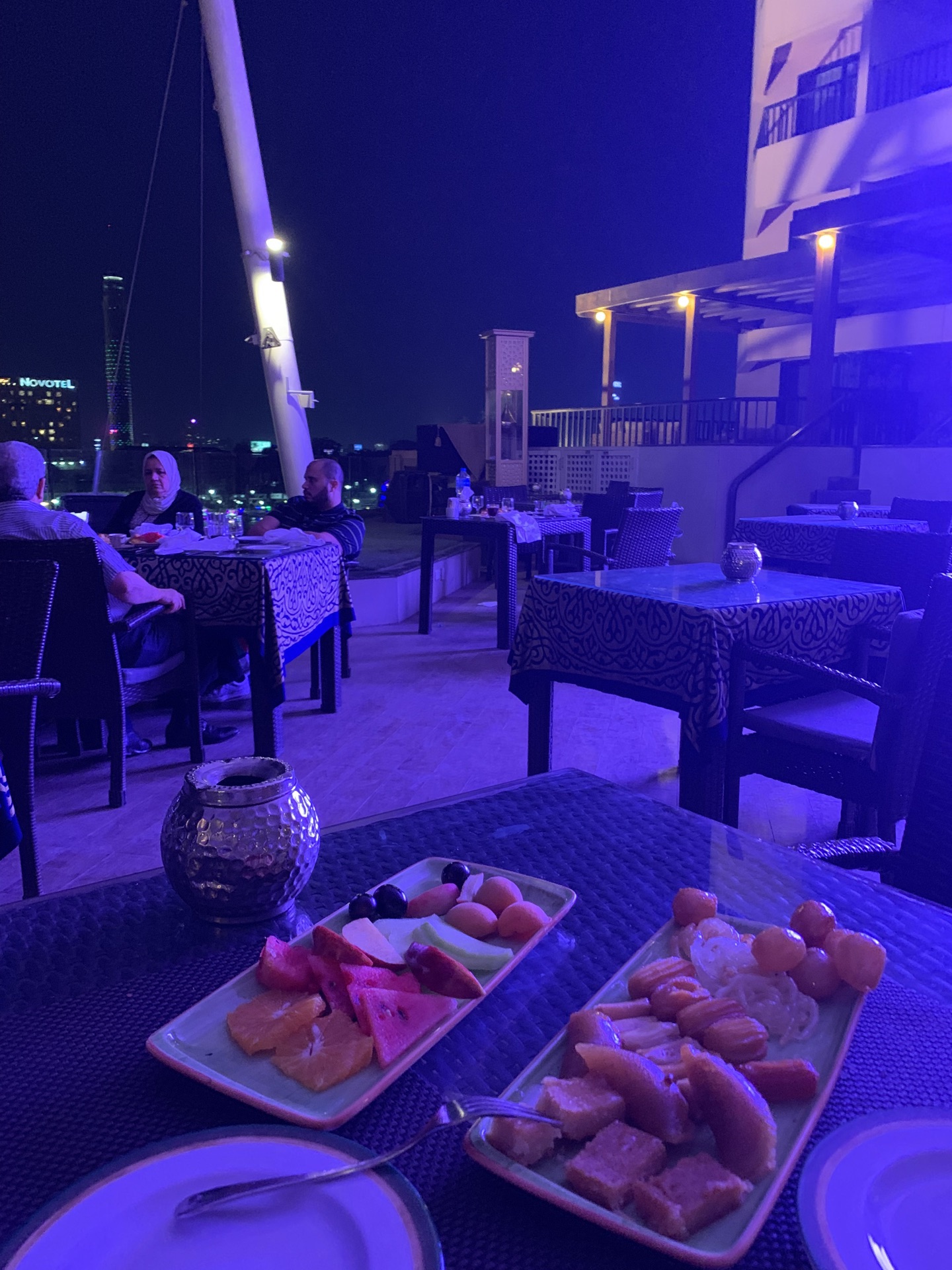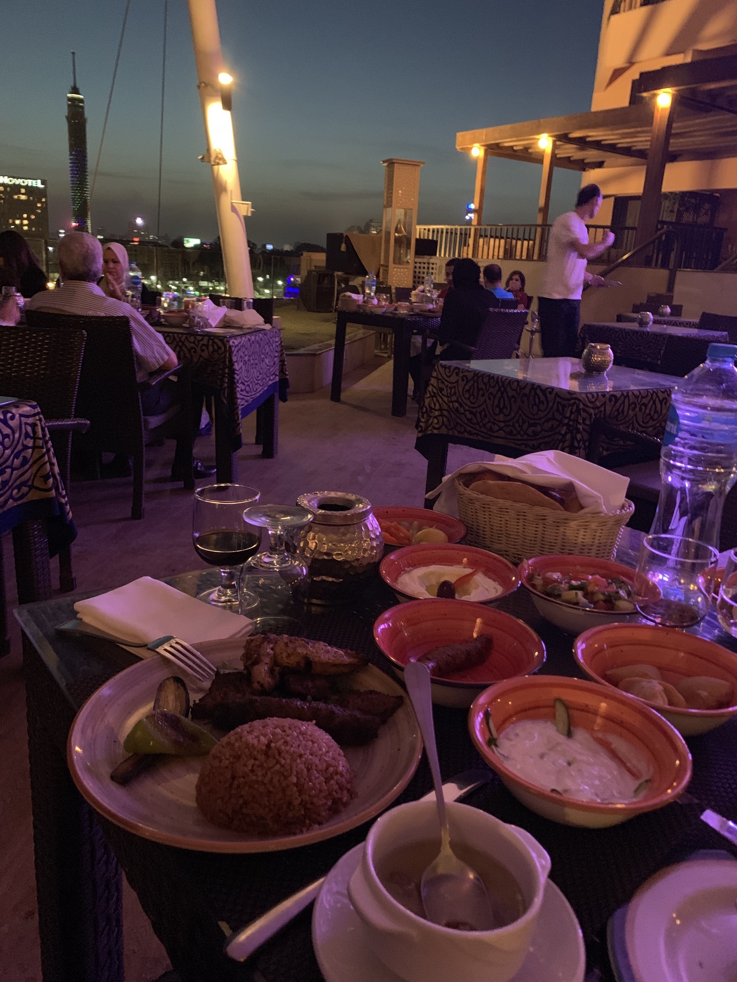 位于洲际酒店室外游泳池旁边的餐厅是我们在开罗吃的最贵的一顿饭了 晚上独有的套餐感觉分量很大 虽然各式各样的肉并不好吃 不过感觉还是很新鲜的 整个店室外的空间直接面向看得到开罗塔的尼罗河 夕阳的时候还是很漂亮的 晚上有些游船点缀在河流上 吹着风喝着酒感觉也不错