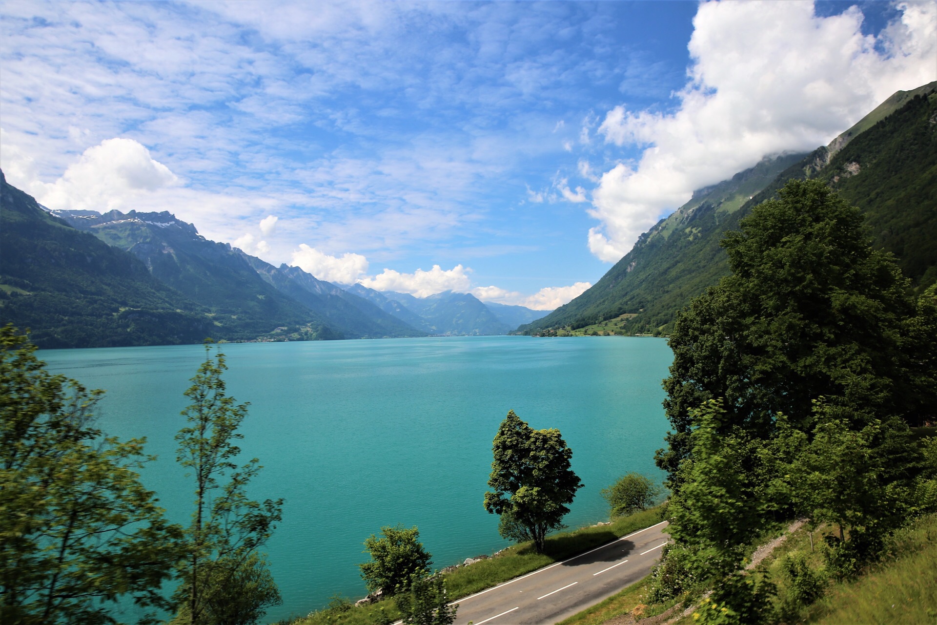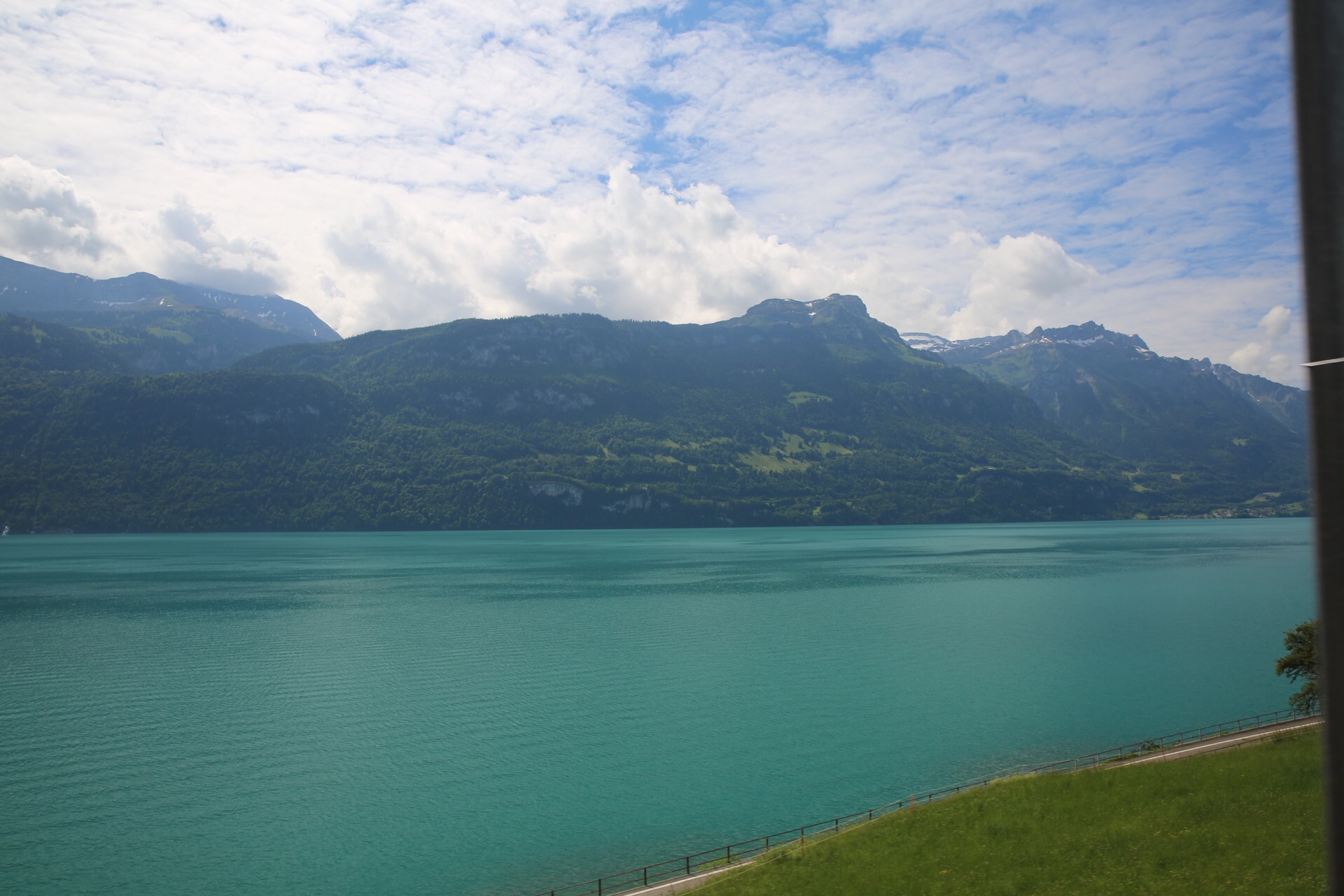 因特拉肯位于号称“欧洲屋脊”的少女峰山脚下,成为豋少女峰的必经门户。 因特拉肯又处于图恩湖和布里恩茨湖之间,故又被称为“湖间镇”。 金色列车途经图恩湖,摄下碧绿的湖水和湖边的村庄、农舍、牧场和远处的群山,就像一幅幅人间仙境。