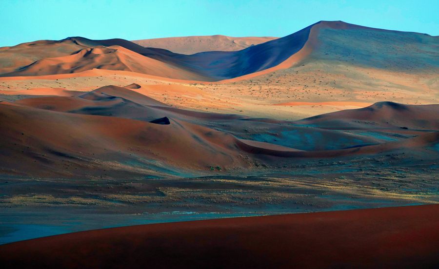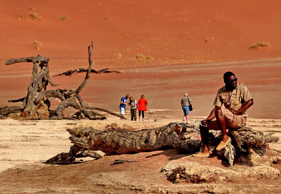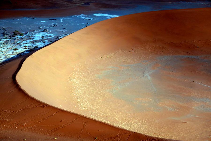 在苏丝斯黎红沙漠里,最动人的景观便是“死亡谷”,不寒而栗的名称,让人不禁个打个激灵。其实是有铁红色的沙丘和银白色的盐沼地组成,造就出了死亡谷的名称,因为在红色的沙海里,不知何年何月曾经有过的流水,在沙丘下汇聚成水溏,但是流水终究抵挡不过沙漠的严酷,河流消失了,留下来一片片盐沼地,在阳光下白花花的耀眼,许多树木因此干枯而死,千百年来矗立在白色的盐沼地中,黑色的躯干,红色的沙丘,特别醒目,形成了令人惊叹的独特绝美自然景观。 随缘看世界