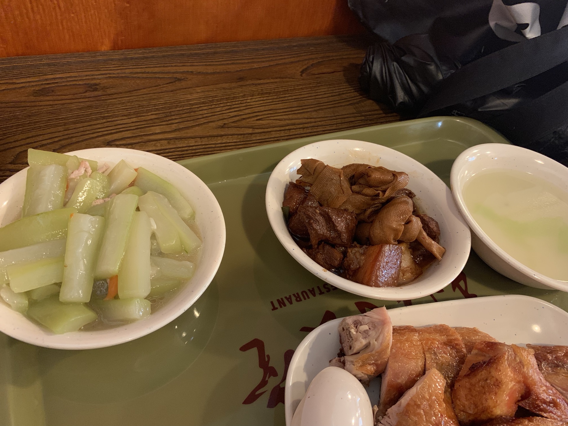 红烧肉味道真不错,肉是肥瘦相间的,不腻,豆腐皮特别入味,下饭。西葫芦有点咸,烤鸡味道也不错,很嫩