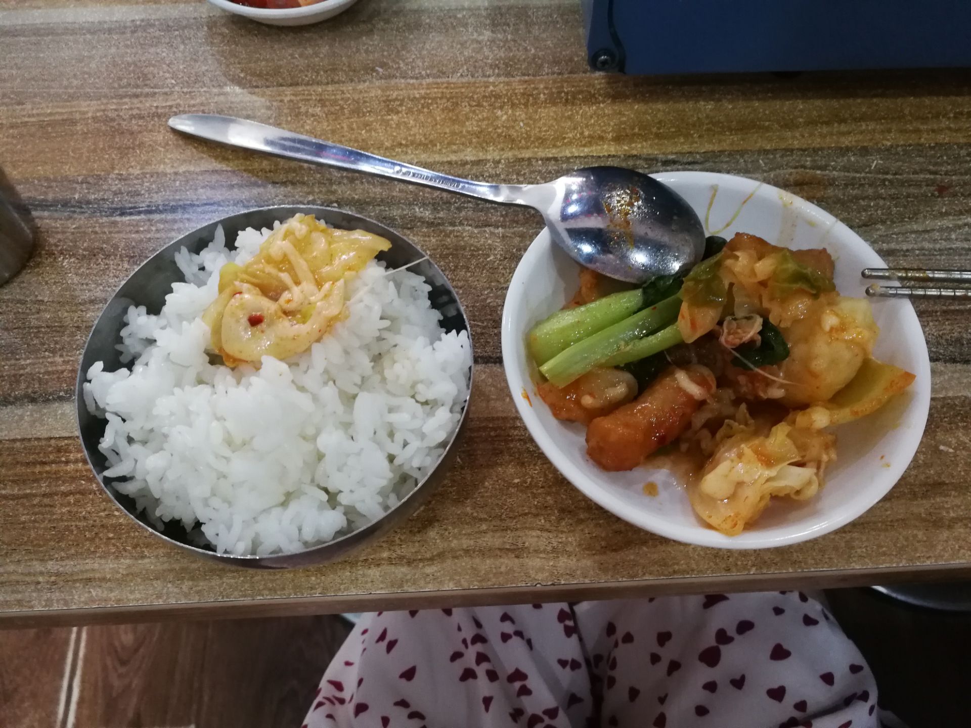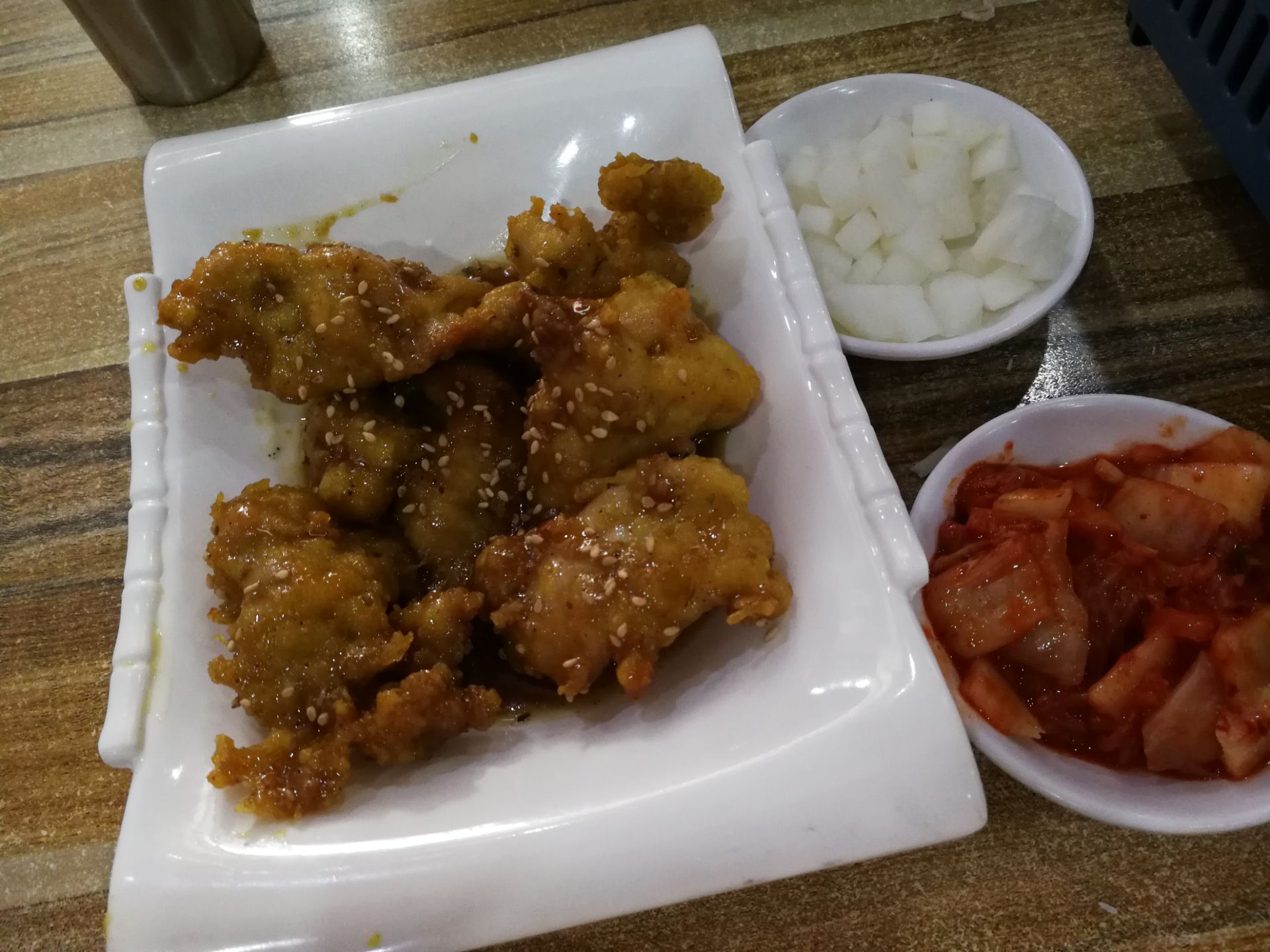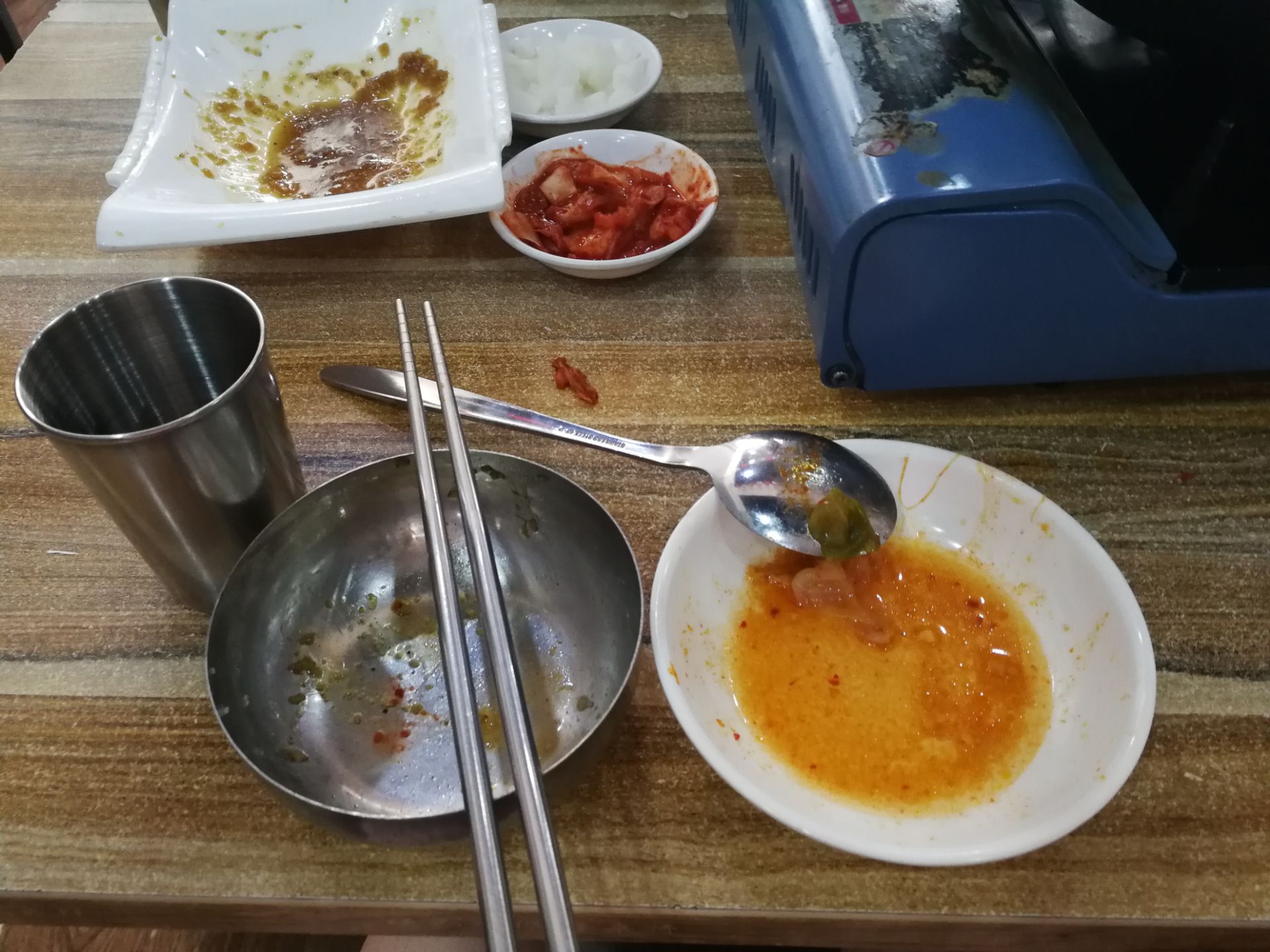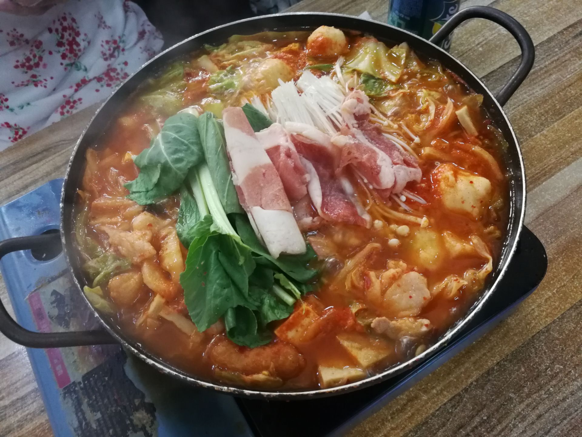 吃的部队火锅两人份,很实惠,很好吃。主食有拉面和米饭。还要了一份蒜香炸鸡,这个很不错,炸的鸡肉非常软嫩多汁,下次还想再来吃。