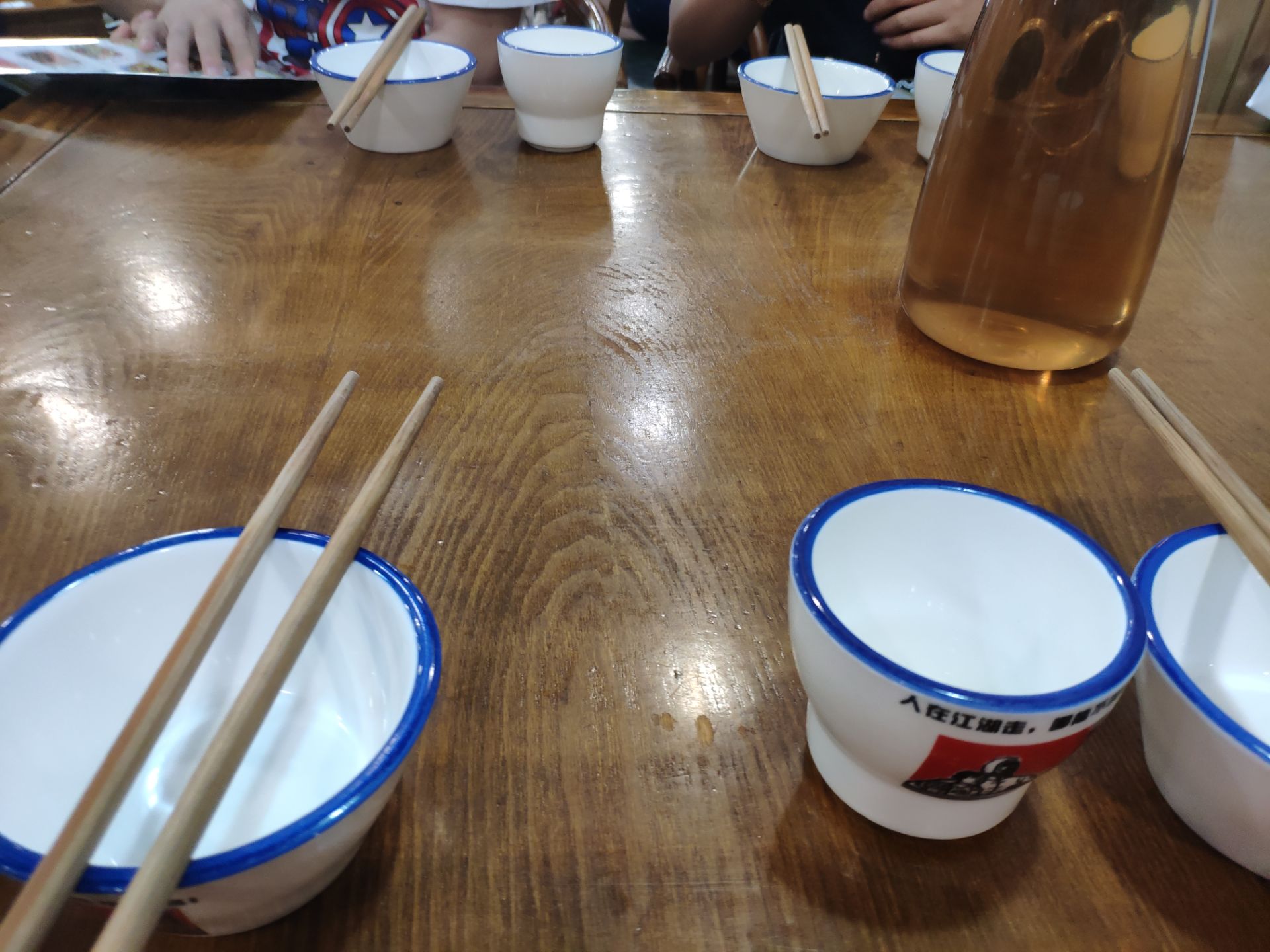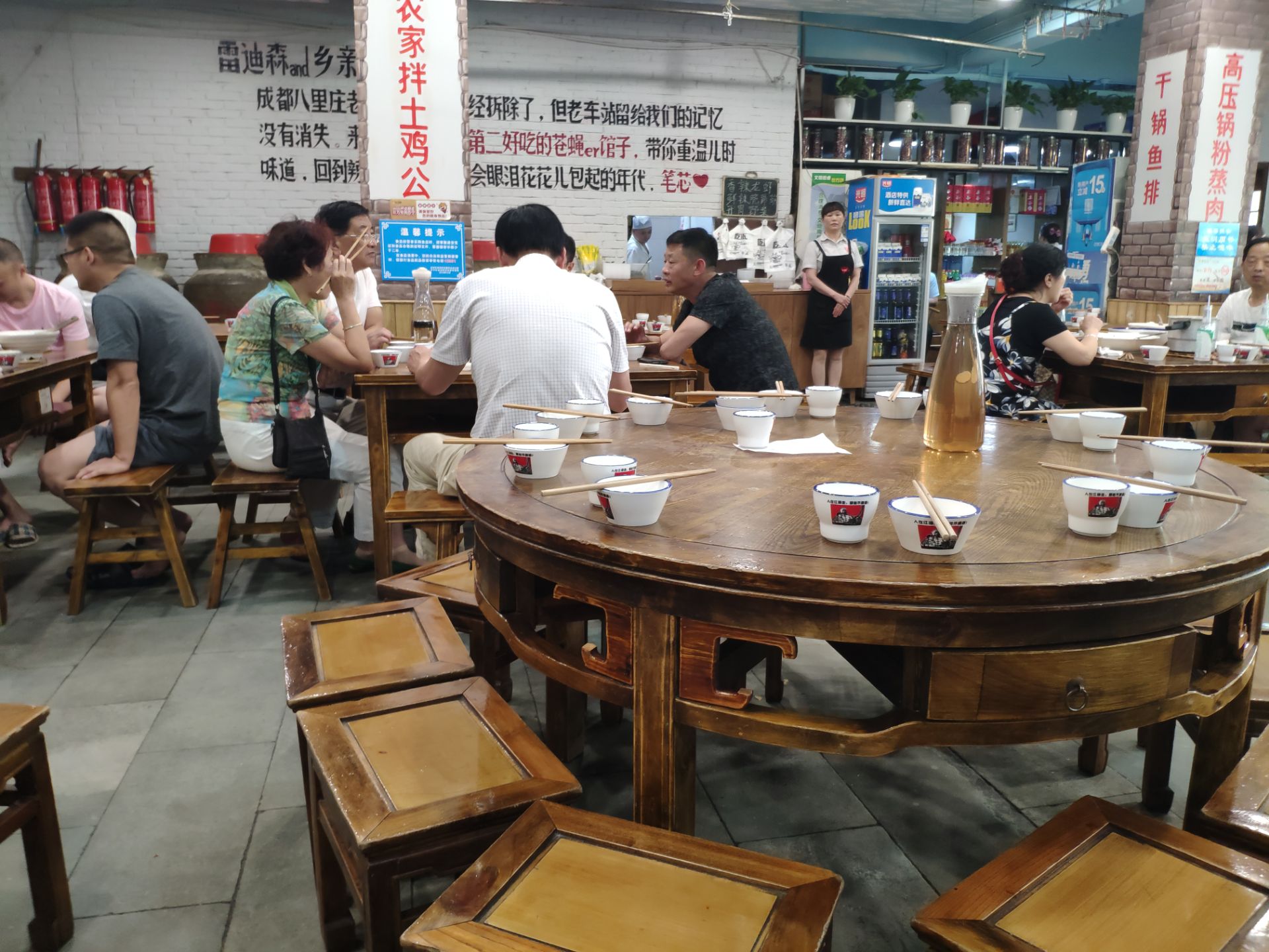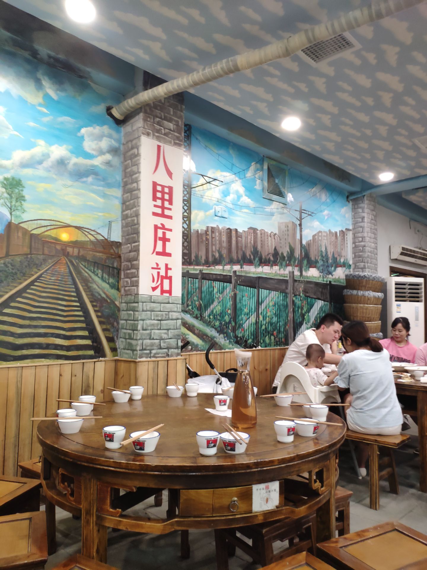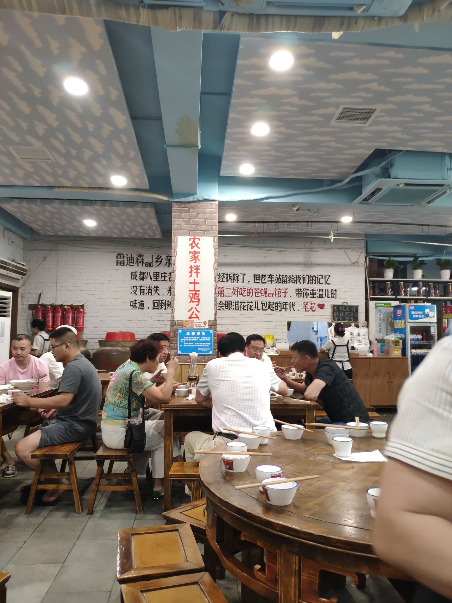 周末和朋友聚会,晚上朋友带我们来八里庄这家餐厅来吃饭。门口停车位比较紧张,停里面一个空坝上收费10元。 [环境]营造的是七十年代的氛围,墙上写满了标语。碗和杯子都是仿搪瓷感,有点像倒退了30年。 [服务]还可以,点菜上菜很积极。 |水晶粉^这个挺好吃的,粉丝吸满了肉香味和酱油味。 |大牌凉拌鸡^麻辣适中,鸡肉紧实,值得来一份。 |牙祭回锅肉^成色差一点,味道能打65分。 |鼎上烧鸭^没有特色,基本没有动,大家都不吃。 四个人消费100多,性价比高。不过厨房有点脏,路过之后不再想光顾此店。