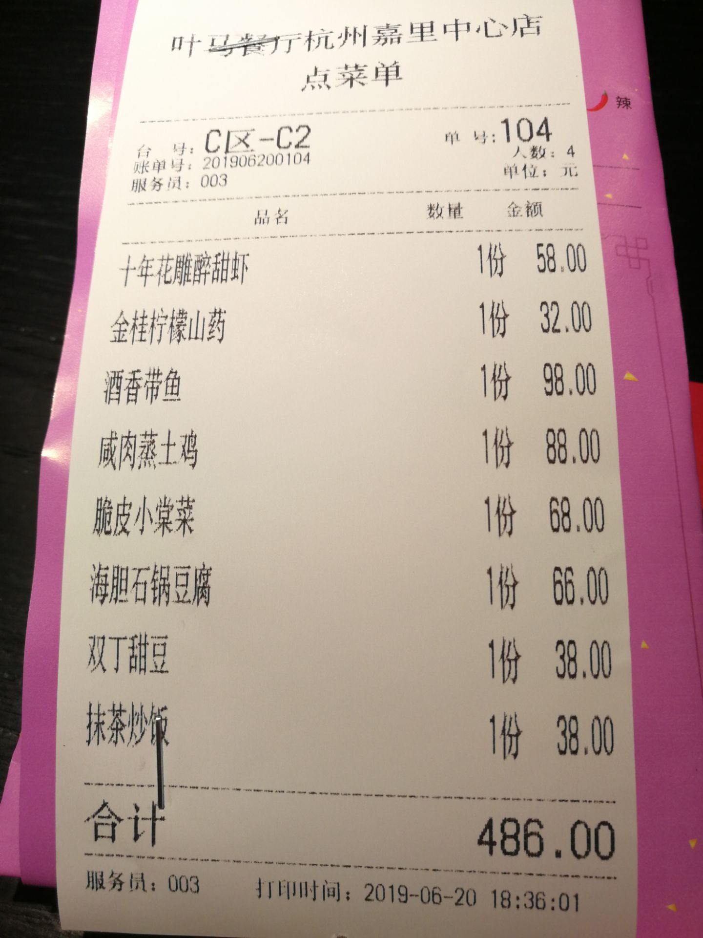 和小姐妹的例行聚会,难得这次选择餐厅没有争议,上次未能成形的叶马,这次一定要拿下! 下班早的先去拿号,工作日晚5点半到店依旧等了近1个小时,生意真的很好~~~~~~~一行人陆陆续续到齐,很默契的先看菜单,选好后再开始闲话家常。 参考了推荐榜和自己的口味偏好,选了几道他们家的“当家招牌菜”,入座后直接下单,一分钟都没有耽搁。 金桂柠檬山药(32):山药泥打制成的99[%]神似的柠檬磨具里,唯一小遗憾的就是颜色上不能调整了,不过纯白色的山药泥倒是更能体现出顶部的蜂蜜桂花的色泽,舀一勺山药,蘸上蜂蜜桂花酱,味道正好。 十年花雕醉甜虾(58):一份只有6只,味道不错,甜虾自带的甘甜与花雕的酒香融合,感觉我一个人都能消灭两盘的节奏。 咸肉蒸土鸡(88):意外上榜的一道菜,看着清汤寡水的,不过土鸡和咸肉各自释放着巨大的能量,诠释了1+1>2的裂变! 酒香带鱼(98):一份只有5片,价格真的有点小贵,不接受反驳……不过味道也确实不错,只是……完全没有吃过瘾就没了~~~~~~~ 脆皮小棠菜(68):墨鱼肉打成泥,裹上面浆油炸,不单不油腻,一口咬下去外酥内鲜。讲真,吃前无感,吃后难忘哦! 海胆石锅豆腐(66):海胆的量还蛮多的,豆腐嫩滑,还有青豌豆和金针菇、火腿丁等,可惜这份石锅煲酱油滋的太多了,咸到一度怀疑喝了一碗酱油汤,甚至把海鲜的海腥味都盖过了说…… 双丁甜豆(38):家常蔬菜,很清爽,加了些许肉丁和茭白丁。尤其是喝了上面这份“酱油汤”后,更觉得小清新啦~~~~~~~~~ 抹茶炒饭(38):最后压轴的主食,抹茶控坚定的选择了这份口碑还不错的炒饭。结果自己倒是没吃多少,原本对抹茶无感的小伙伴差点就要吃到“舔盘”了,哈哈。 基本没有雷区,探店拔草很成功哦!