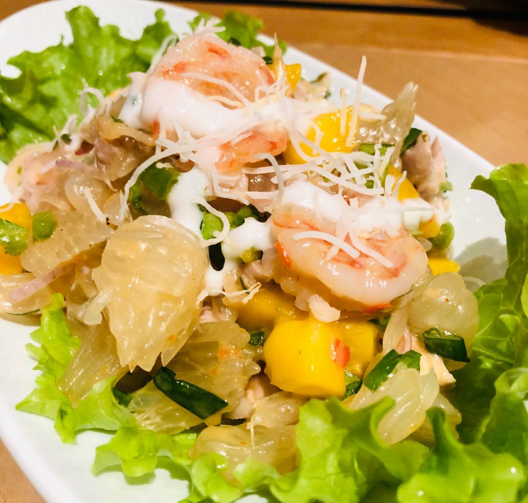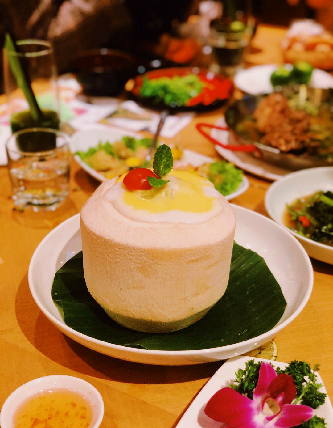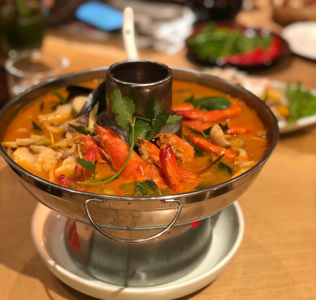 「火山排骨」从样貌上感觉还原度很高,光看排骨就最起码有4斤以上,而且用的还是很大块的那几根,骨头上面肉也很多!服气! 戴上手套就开始毫不顾忌形象地开啃!量还是可以的,我们一人一根就已经有点饱了! 排骨味道是有点酸酸辣辣的,很泰国!上面铺满的青柠就很下血本了吧,底下的汤汁里面也吃得出浓郁的青柠清香! 里面用的辣椒也不太一样,不是那种普通的国内辣椒,估计也是泰国的某种辣椒,很香的!店家走心了! 「红宝石椰汁冰沙」也是很奇妙的口感,石榴红红的,加上马蹄的清香融合在一起,嚼着特别过瘾,软糯+爽脆的双重感受,添加了一些亚达籽在里面增加口感的多样性,再喝一口椰汁!爽! 「冬阴功海鲜锅」是真的值得点!汤底是用一整只龙虾熬出来的,完全是西餐的做法,汤里铺满白虾和青口贝,底下还有龙利鱼,关键是汤真的好喝!点名表扬。 「安达曼手工虾饼」也是百吃不腻,配上店家自己做的梅子酱,酸酸甜甜很开胃! 还要表扬的是这里送的免费龙虾片!是真的好吃!!那个绿绿的香兰叶柠檬汁,也是每次必点!!很解辣!!