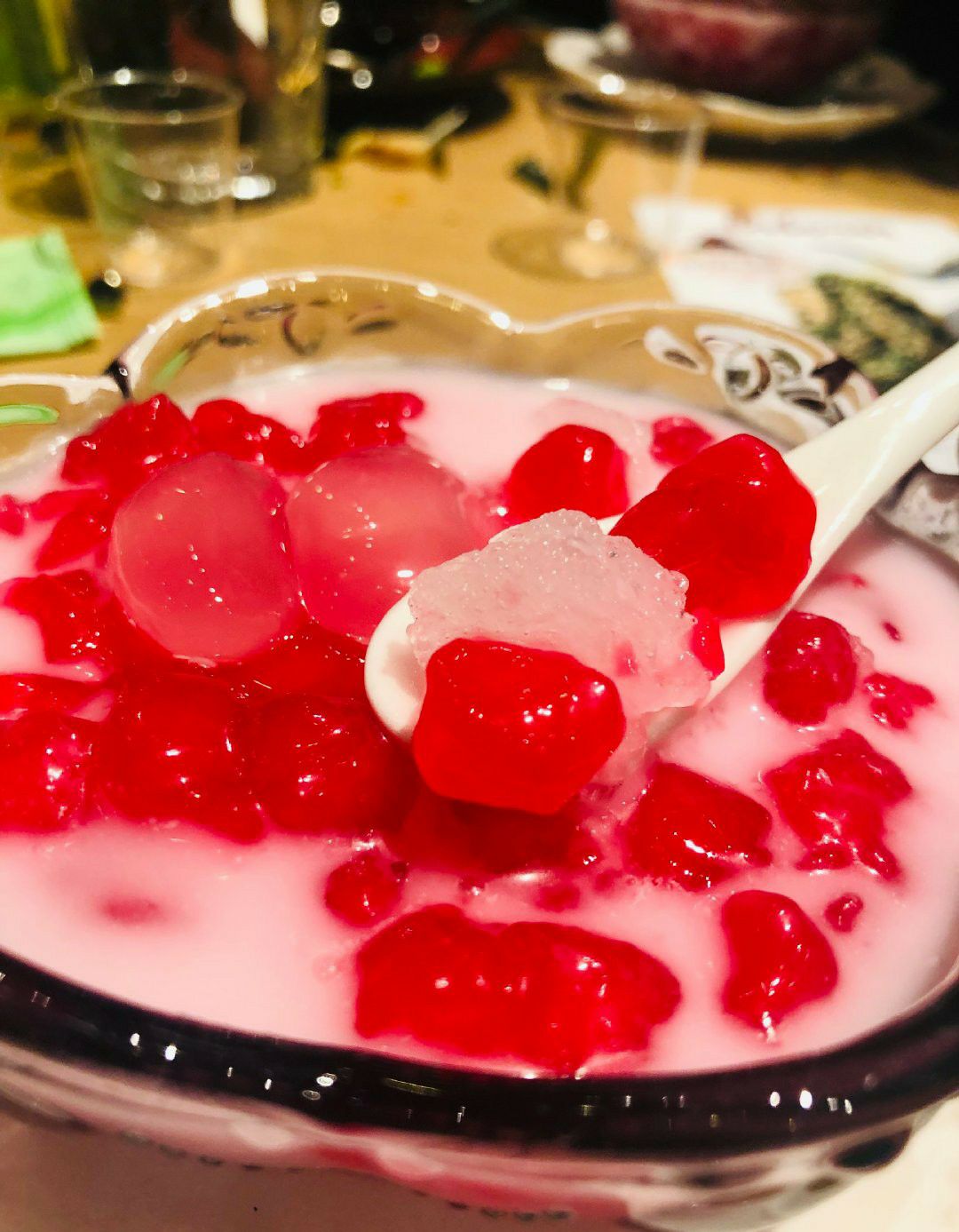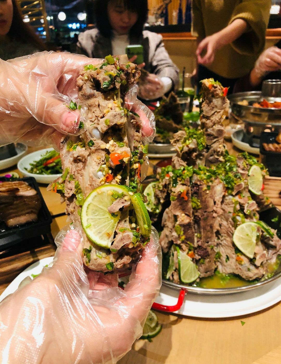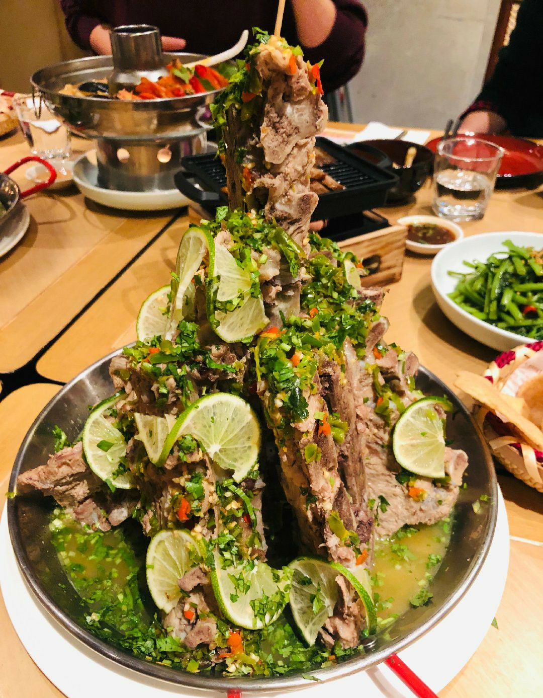 「火山排骨」从样貌上感觉还原度很高,光看排骨就最起码有4斤以上,而且用的还是很大块的那几根,骨头上面肉也很多!服气! 戴上手套就开始毫不顾忌形象地开啃!量还是可以的,我们一人一根就已经有点饱了! 排骨味道是有点酸酸辣辣的,很泰国!上面铺满的青柠就很下血本了吧,底下的汤汁里面也吃得出浓郁的青柠清香! 里面用的辣椒也不太一样,不是那种普通的国内辣椒,估计也是泰国的某种辣椒,很香的!店家走心了! 「红宝石椰汁冰沙」也是很奇妙的口感,石榴红红的,加上马蹄的清香融合在一起,嚼着特别过瘾,软糯+爽脆的双重感受,添加了一些亚达籽在里面增加口感的多样性,再喝一口椰汁!爽! 「冬阴功海鲜锅」是真的值得点!汤底是用一整只龙虾熬出来的,完全是西餐的做法,汤里铺满白虾和青口贝,底下还有龙利鱼,关键是汤真的好喝!点名表扬。 「安达曼手工虾饼」也是百吃不腻,配上店家自己做的梅子酱,酸酸甜甜很开胃! 还要表扬的是这里送的免费龙虾片!是真的好吃!!那个绿绿的香兰叶柠檬汁,也是每次必点!!很解辣!!
