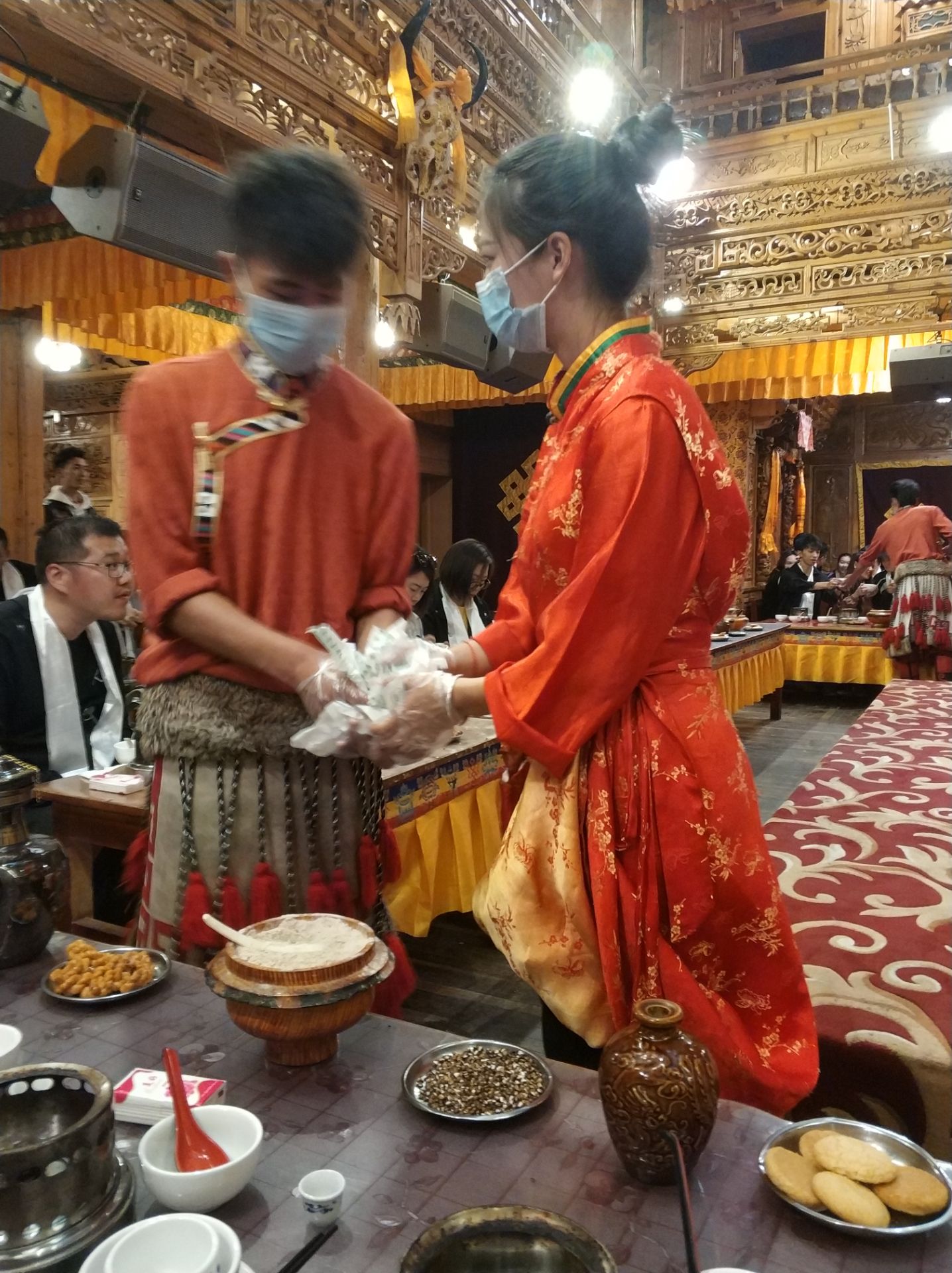 欣赏原生态歌舞,扎西跳起欢快的锅庄,卓玛为客人献上洁白的哈达,祝酒的歌儿唱起来,直到你饮下一碗酥油茶或者马奶酒,歌声才会告一段落。遇到喜欢你的扎西或卓玛,请热情回应这不掺杂物质的情感吧! 进门献完哈达与献哈达的藏民合照留念,这个如果要纸质的照片是要收费20元的,其他还好