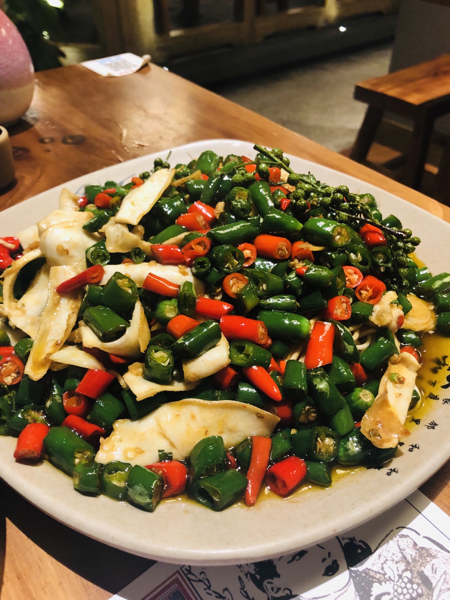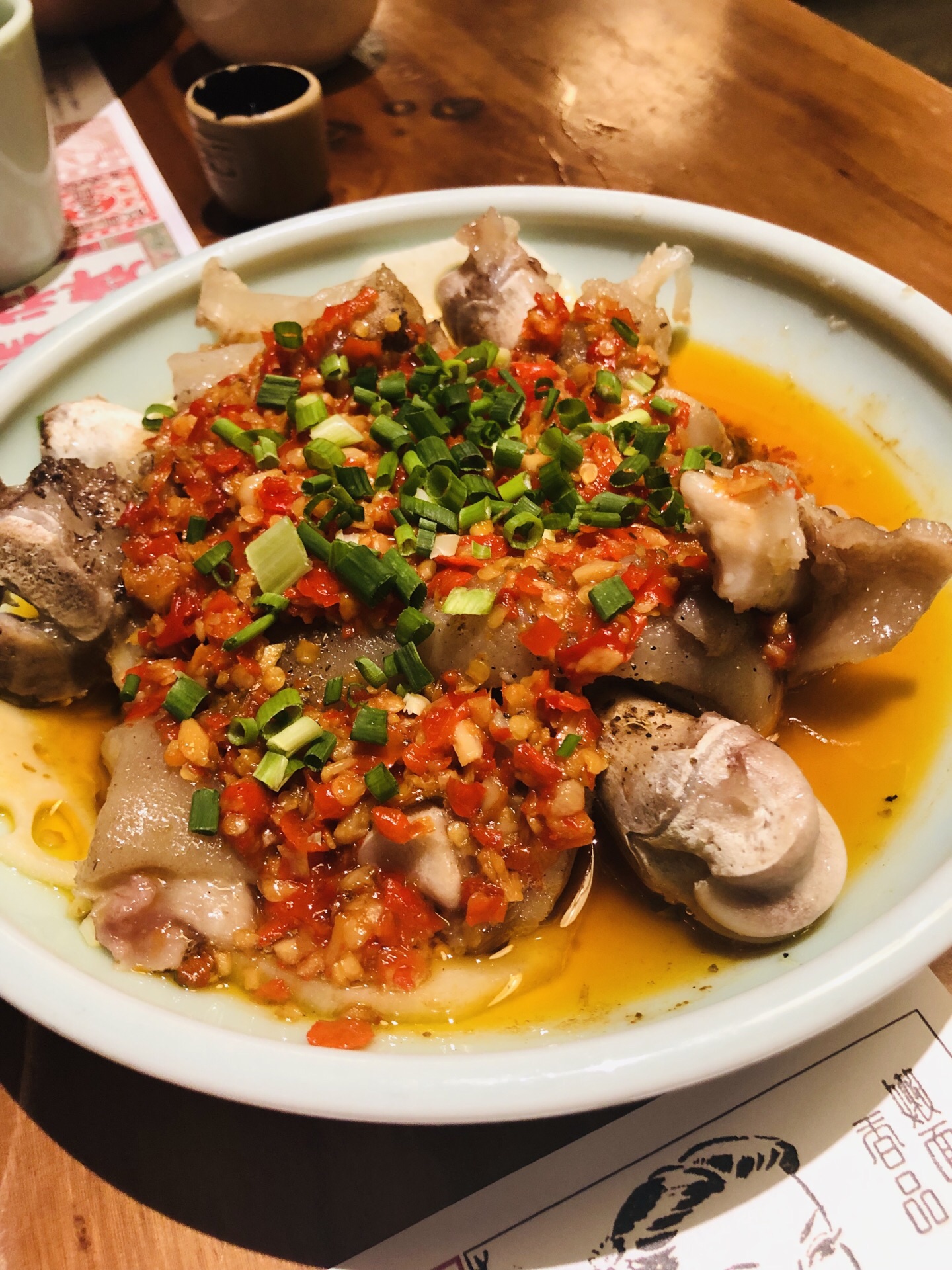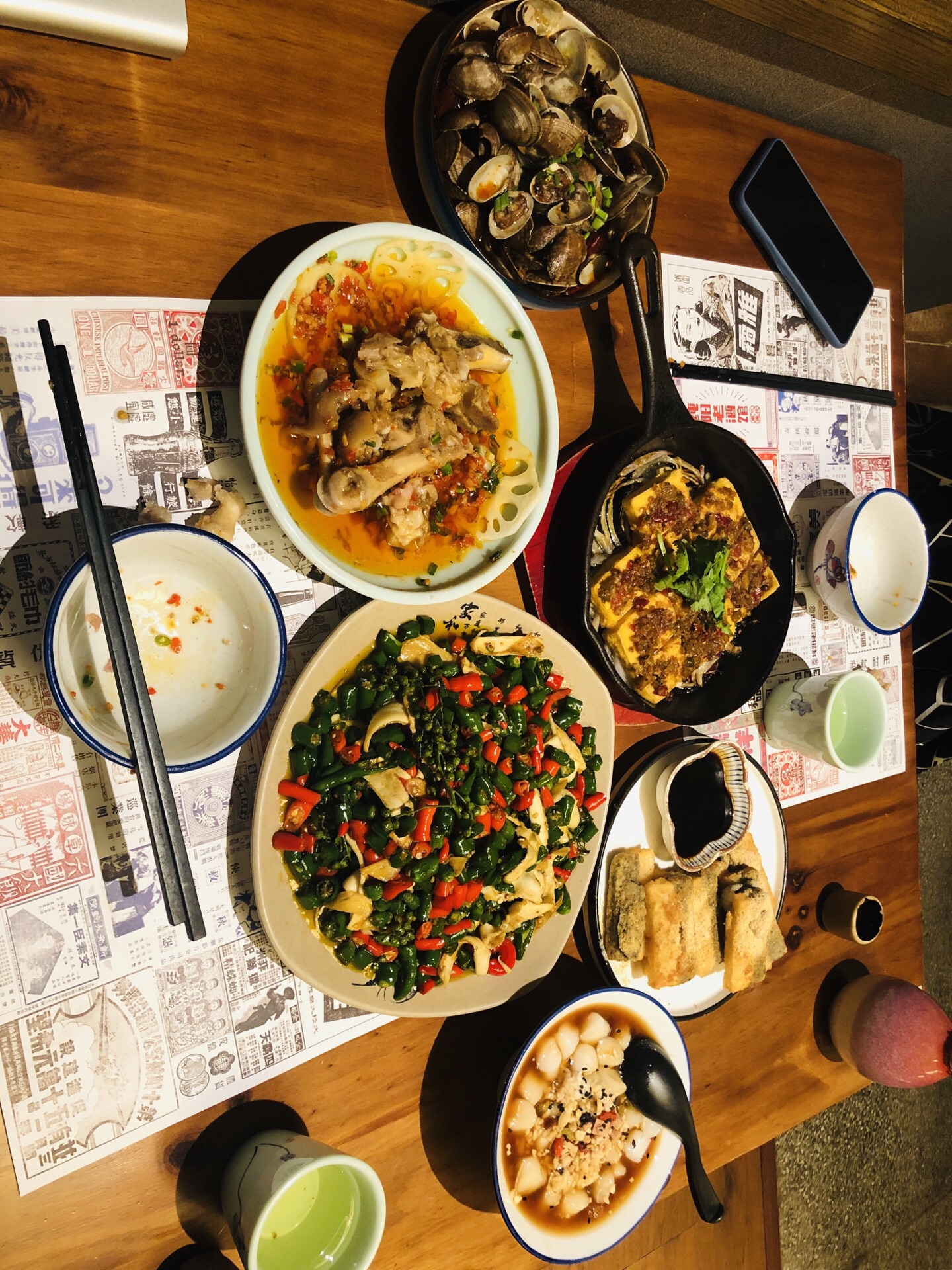 去的太早了,店门刚开,服务员还在备菜,店内空调冻人,会主动提供wifi密码,店内音乐很喜欢,抒情为主,中式装修带有些许江湖气息,环境还算挺别致的。 【桃花酿】带有一点点酒味的饮料吧,味道很香,杯子小小只,适合劈情操,口味的话还真的不能算是酒类。 【冰汤圆】自从前一天吃了冰汤圆之后,变得不可自拔,哪儿哪儿就要点上一份。冰冰甜甜非常解油腻。 【面香新喉】黄喉炒的很入味,虽然满盆子都是配料,底部都是面条,但是味道是真的很好,面条也非常劲道,点了这道菜的人可以不用点主食,就是底部的油了一点。 【鲜椒蹄花】蹄花很糯,微微辣,因为自己去的时间比较早,如果晚些时候去蹄花应该味道更好,更酥烂。 【花蛤】最爱的一道菜,在上海真的吃不到这种口味的花蛤,原材料新鲜,各个几乎都没有沙,肉质爆满,炒的味道也刚刚好。 【淋汁豆腐】重庆的豆腐真的是味好美,豆香味十足,豆腐上面的佐料较多,会有些许的麻,但是完全不影响食用。 【红糖糍粑】糍粑很糯,外表面酥脆,价格非常便宜。 两个人吃这一桌子菜吃到撑,性价比很高,建议来食。