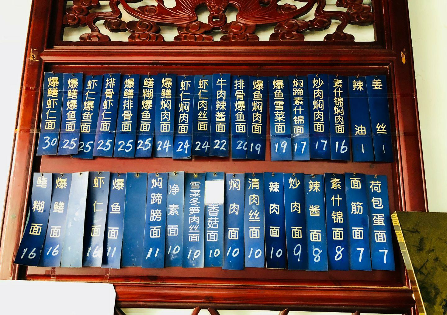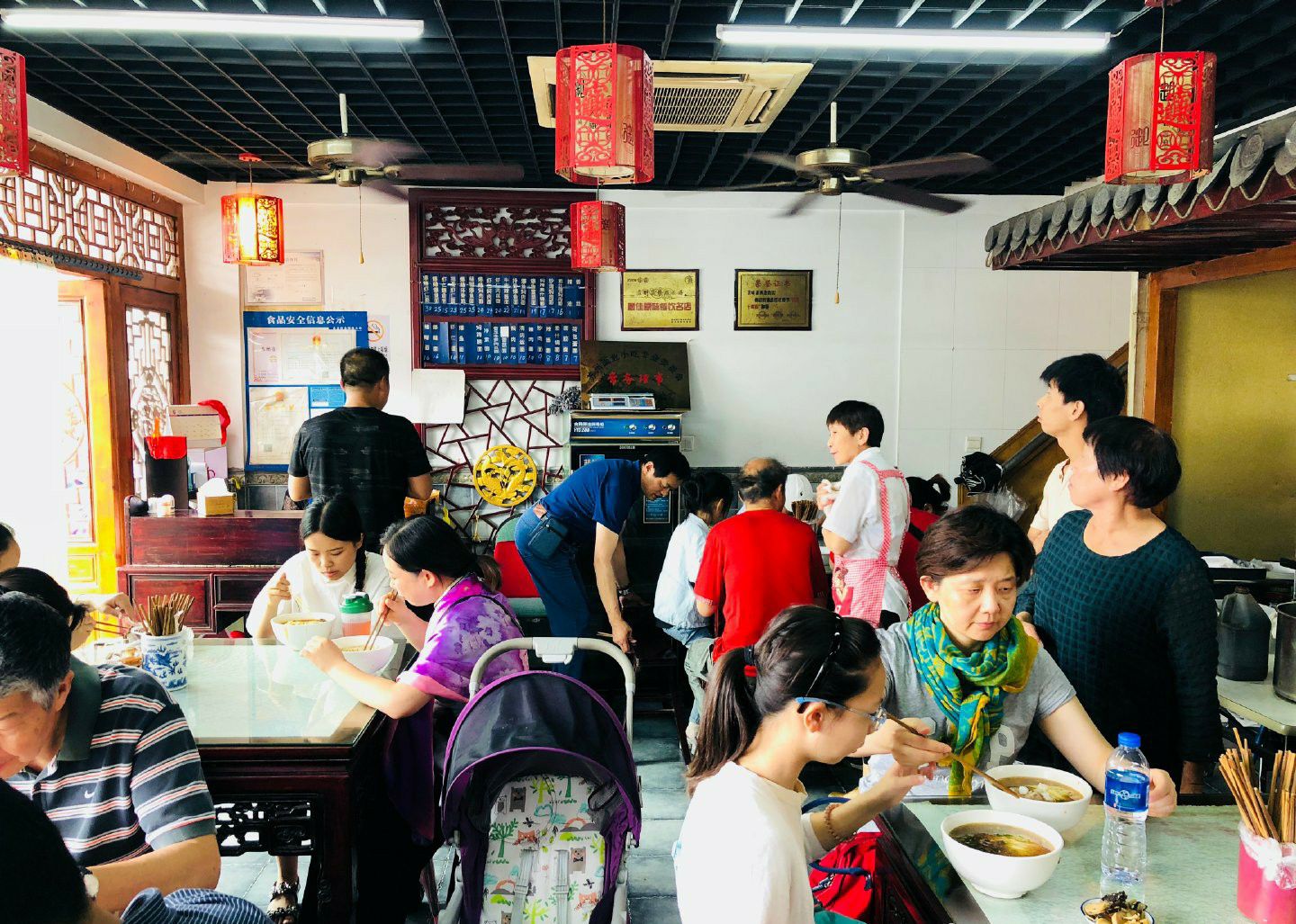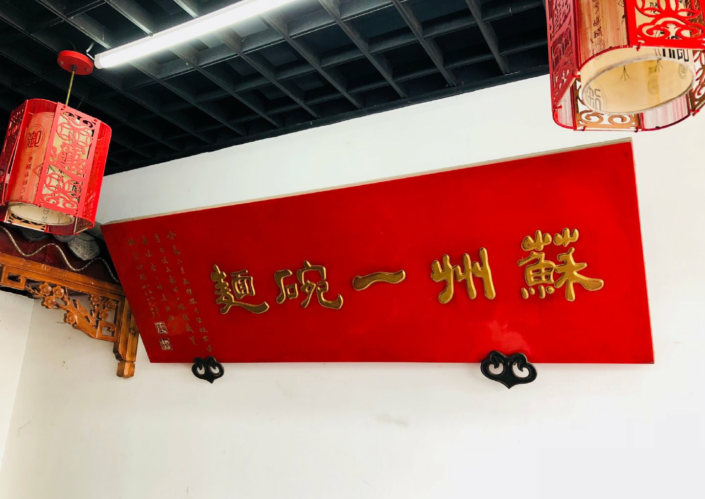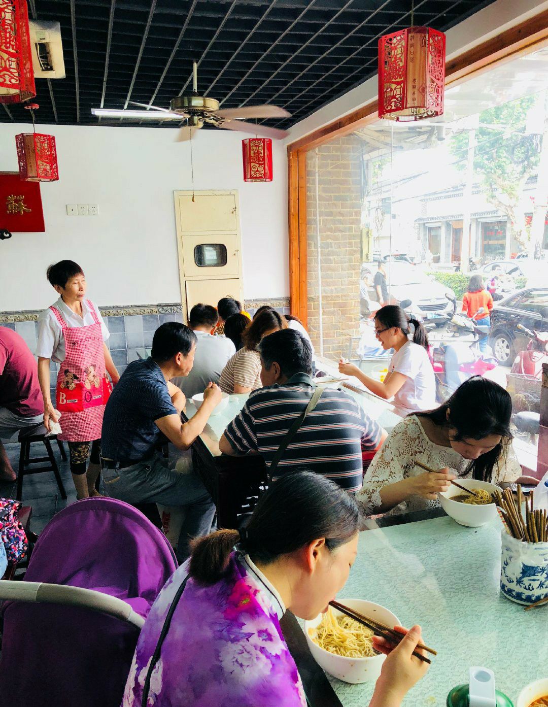 店里虽然好像没开灯黑咕隆咚的。 但是似乎不影响大家吃面的脚步和排队的热情!大家都围坐在八仙桌旁,一个个比谁面声大!热闹非凡~ 招牌上的“苏州第一面”究竟如何呢? 点了一碗招牌“爆鳝虾仁面”和“焖肉面” 猪油香气顺着热气往我的鼻子里钻~ 赶忙抽一双筷子开始吸! 先喝一口汤~汤头都是微甜的酱油红汤,热滚滚的下肚~虾仁并不大,我也并没有点姜丝,毕竟比较相信这里这里虾仁过油的水平,果然不腥! 爆鳝也有其独有的鲜甜与韧劲,炸到刚刚好不焦的颜色放凉浸入酱油,盖在面上被我再放入面汤浸润~呼,美味! 焖肉是一块带皮猪腹肉,酥烂入味,咸香丰满! 面是微硬的精面,也是苏州人偏爱的细面,面骨劲道,挂汤厚落,一口接着一口根本停不下来!