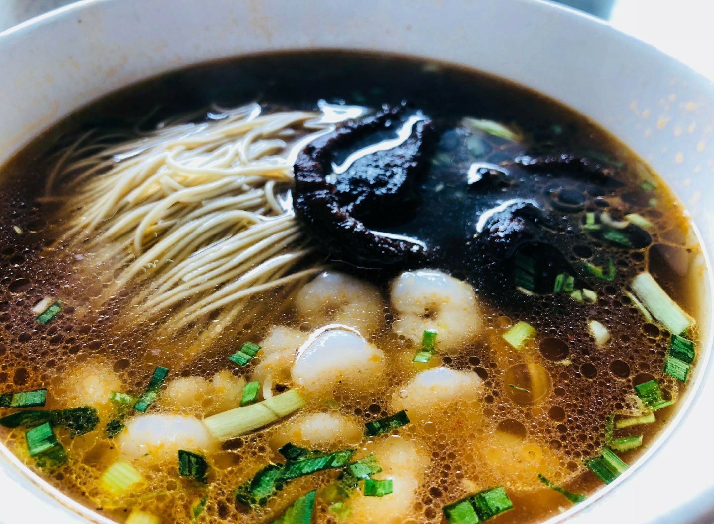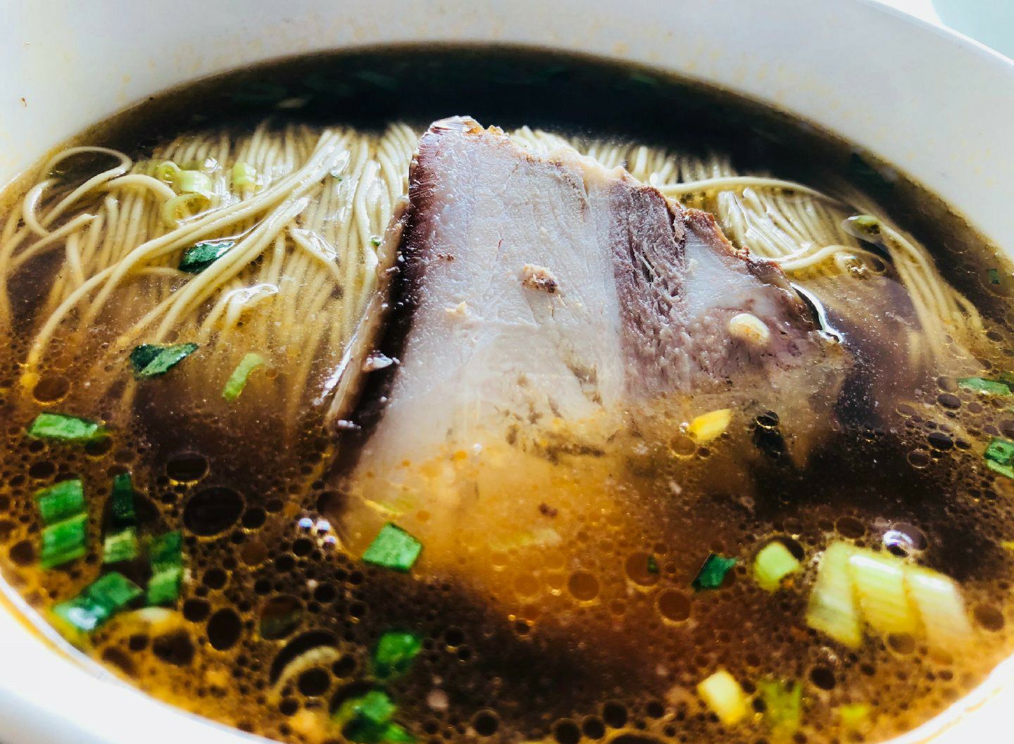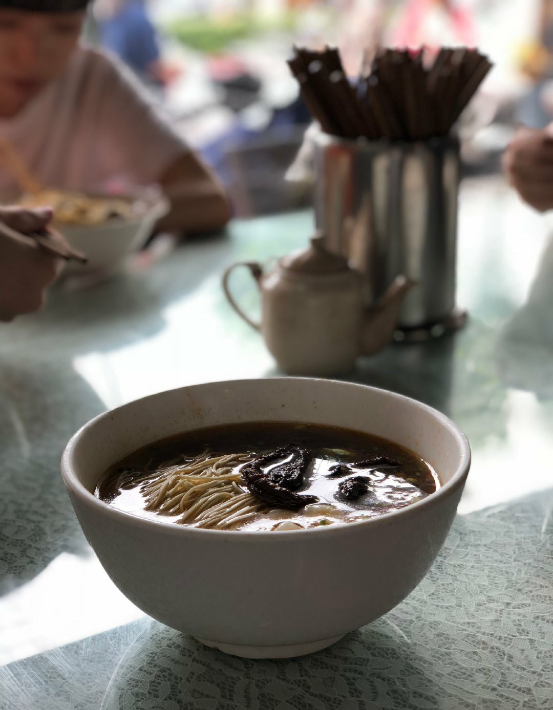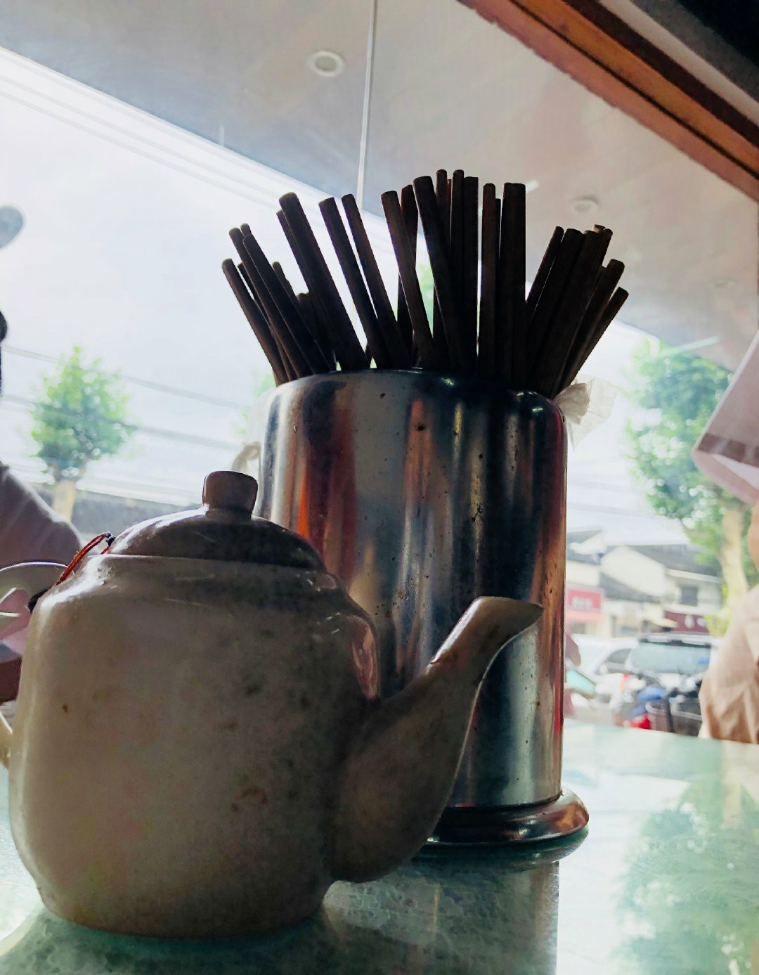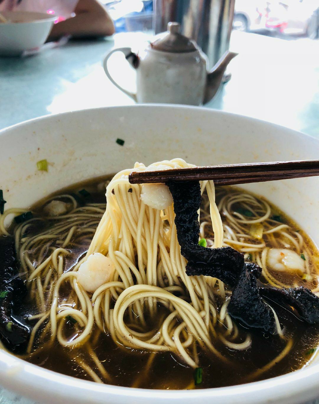 店里虽然好像没开灯黑咕隆咚的。 但是似乎不影响大家吃面的脚步和排队的热情!大家都围坐在八仙桌旁,一个个比谁面声大!热闹非凡~ 招牌上的“苏州第一面”究竟如何呢? 点了一碗招牌“爆鳝虾仁面”和“焖肉面” 猪油香气顺着热气往我的鼻子里钻~ 赶忙抽一双筷子开始吸! 先喝一口汤~汤头都是微甜的酱油红汤,热滚滚的下肚~虾仁并不大,我也并没有点姜丝,毕竟比较相信这里这里虾仁过油的水平,果然不腥! 爆鳝也有其独有的鲜甜与韧劲,炸到刚刚好不焦的颜色放凉浸入酱油,盖在面上被我再放入面汤浸润~呼,美味! 焖肉是一块带皮猪腹肉,酥烂入味,咸香丰满! 面是微硬的精面,也是苏州人偏爱的细面,面骨劲道,挂汤厚落,一口接着一口根本停不下来!