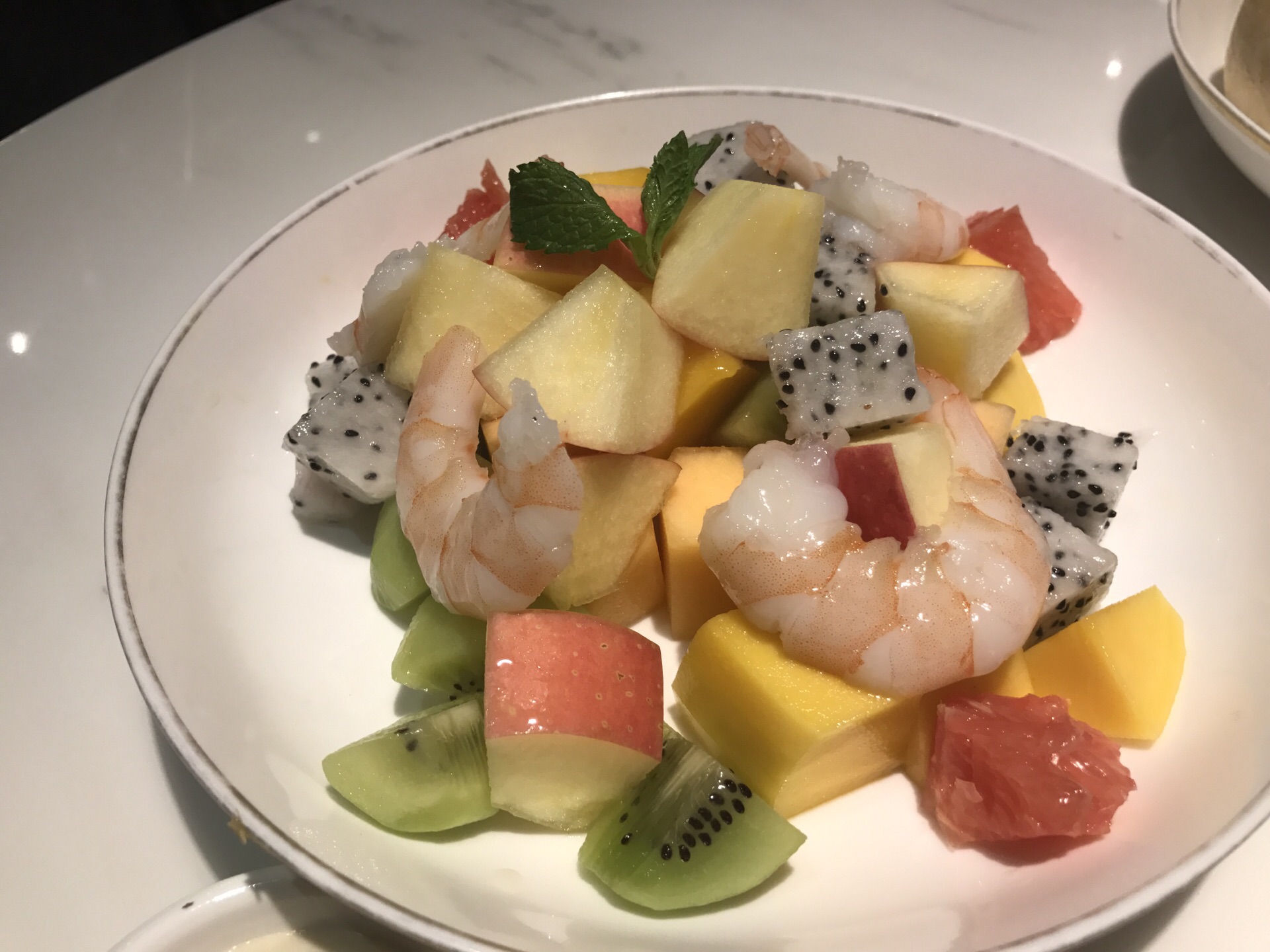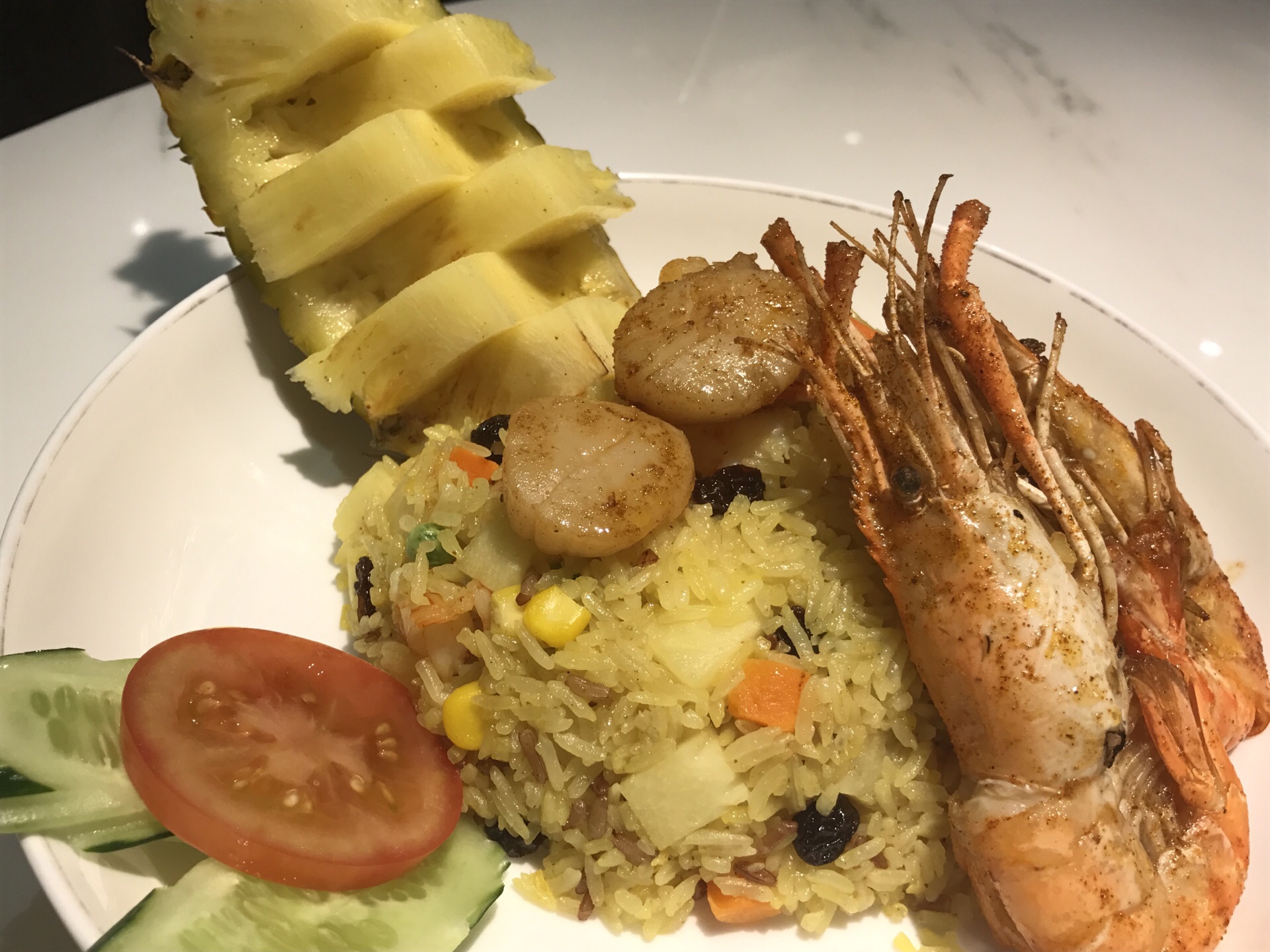 汤浓郁好喝,沙拉里面水果种类多而且新鲜好吃。菠萝炒饭不过不失。点了蟹肉面包,沙拉,还有菠萝炒饭