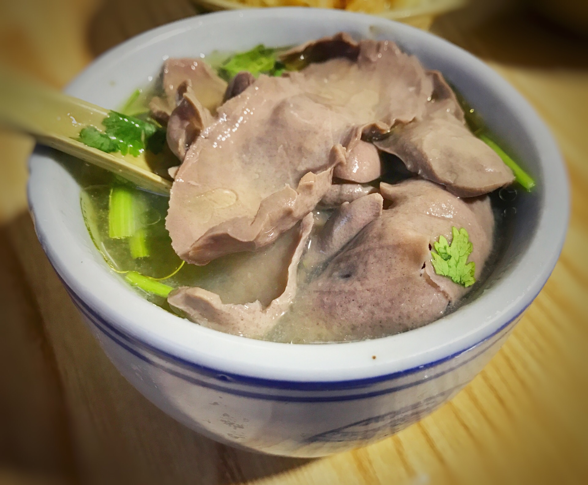 龙岩红色之旅-吃一次就难以忘怀的汀洲泡猪腰。 长汀是龙岩的一个县,那边的泡猪腰早有耳闻,在厦门很多打着“汀洲泡猪腰”牌子的小吃店,每每经过都很好奇是什么味; 这次突发奇想的龙岩游,在问了几个龙岩当地人后,找到一家口碑不错据说当地人也会来吃专卖泡猪腰的餐馆; 按照当地人的习惯点了几样:泡猪腰、豆腐汤、拌面、拌粉和煎蛋,这样丰盛的一餐只要22元。 #泡猪腰# 其实就是猪腰汤,做法比较讲究,猪腰要撕掉外薄膜剔除里面的白筋,切成薄片,越薄越好,在清水中浸泡清洗去血水,泡酒后捞出,拌上地瓜粉勾芡,起锅烧上高汤加姜丝,汤开后下腰片,加少许盐、米酒、茶油、香菜; 喝一口猪腰汤香浓鲜美中带点酒香,一点也不腥;腰片鲜嫩脆滑;人间竟有如此美味,鲜哉美哉! #豆腐汤# 3元一份的豆腐汤实惠而不简单,炸豆腐和白豆腐两种混搭,清清爽爽。 #拌面# #拌粉# 均为3元,份量十足,搭配少许豆芽、葱油和酱油,爽滑筋道; #煎蛋# 龙岩的小吃店的煎蛋都很好吃,蛋边煎的金黄酥脆,蛋黄又恰到好处的嫩,一个一元,太实惠。 汀洲泡猪腰,吃一次就难以忘怀。来龙岩,记得来碗泡猪腰!