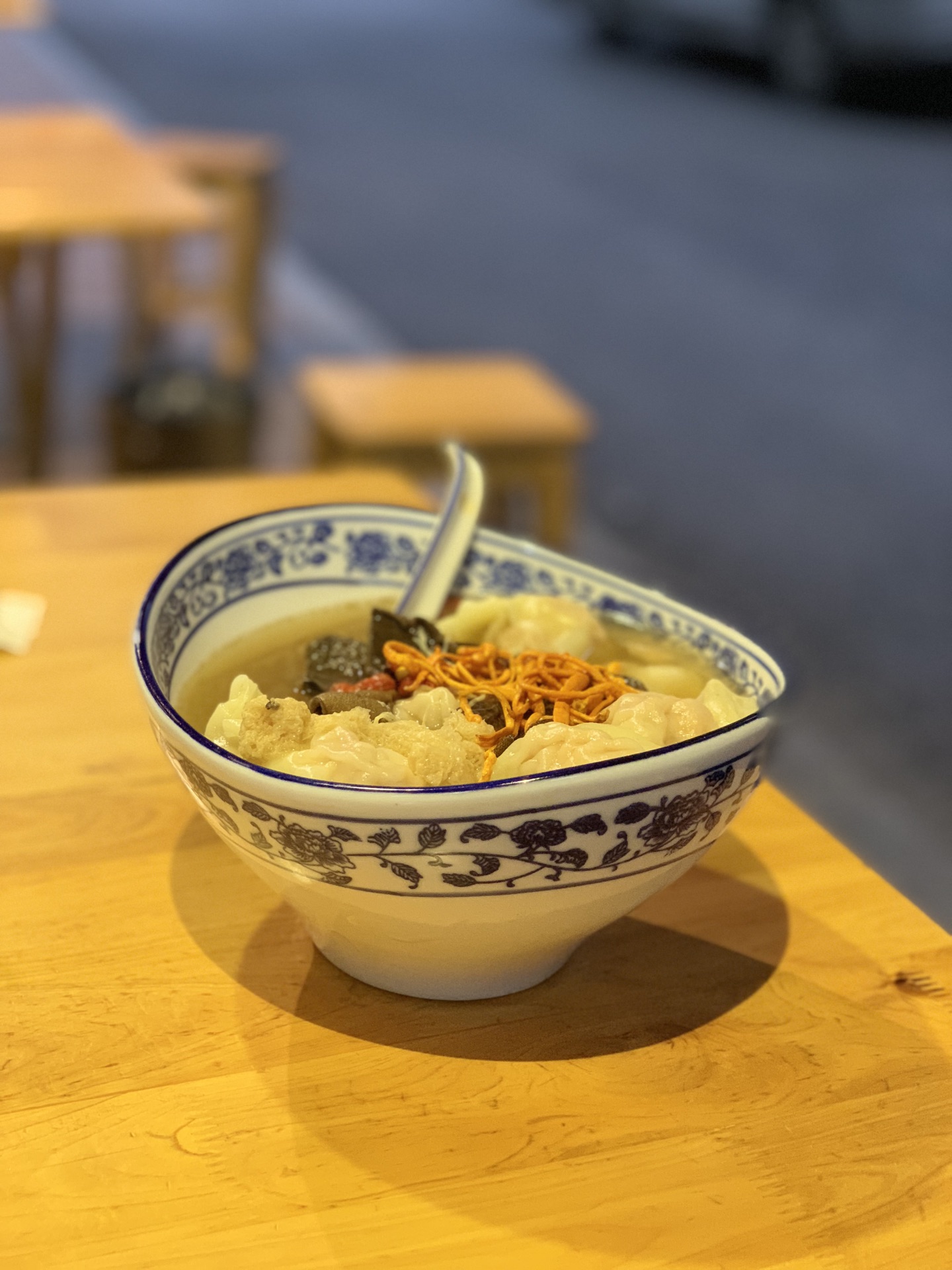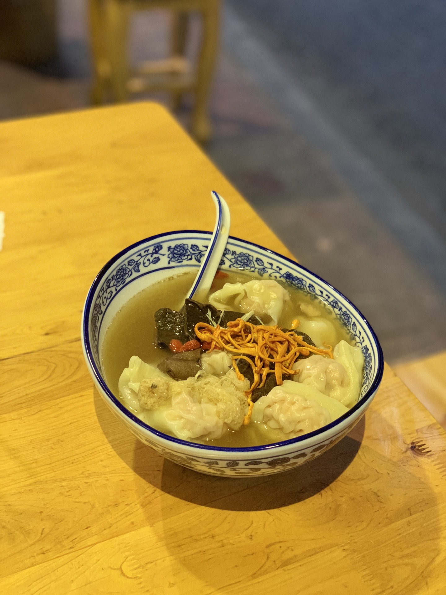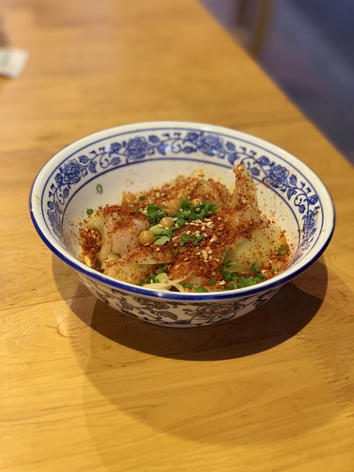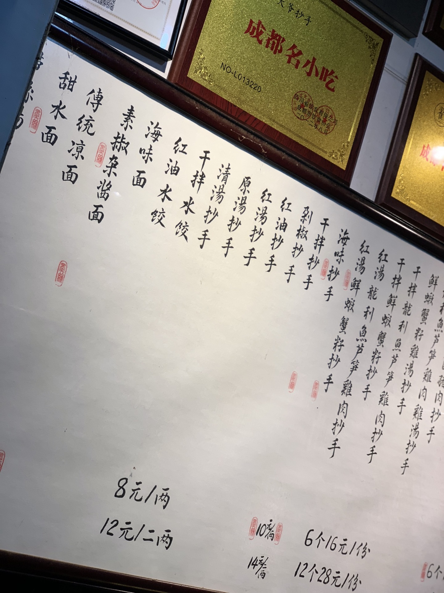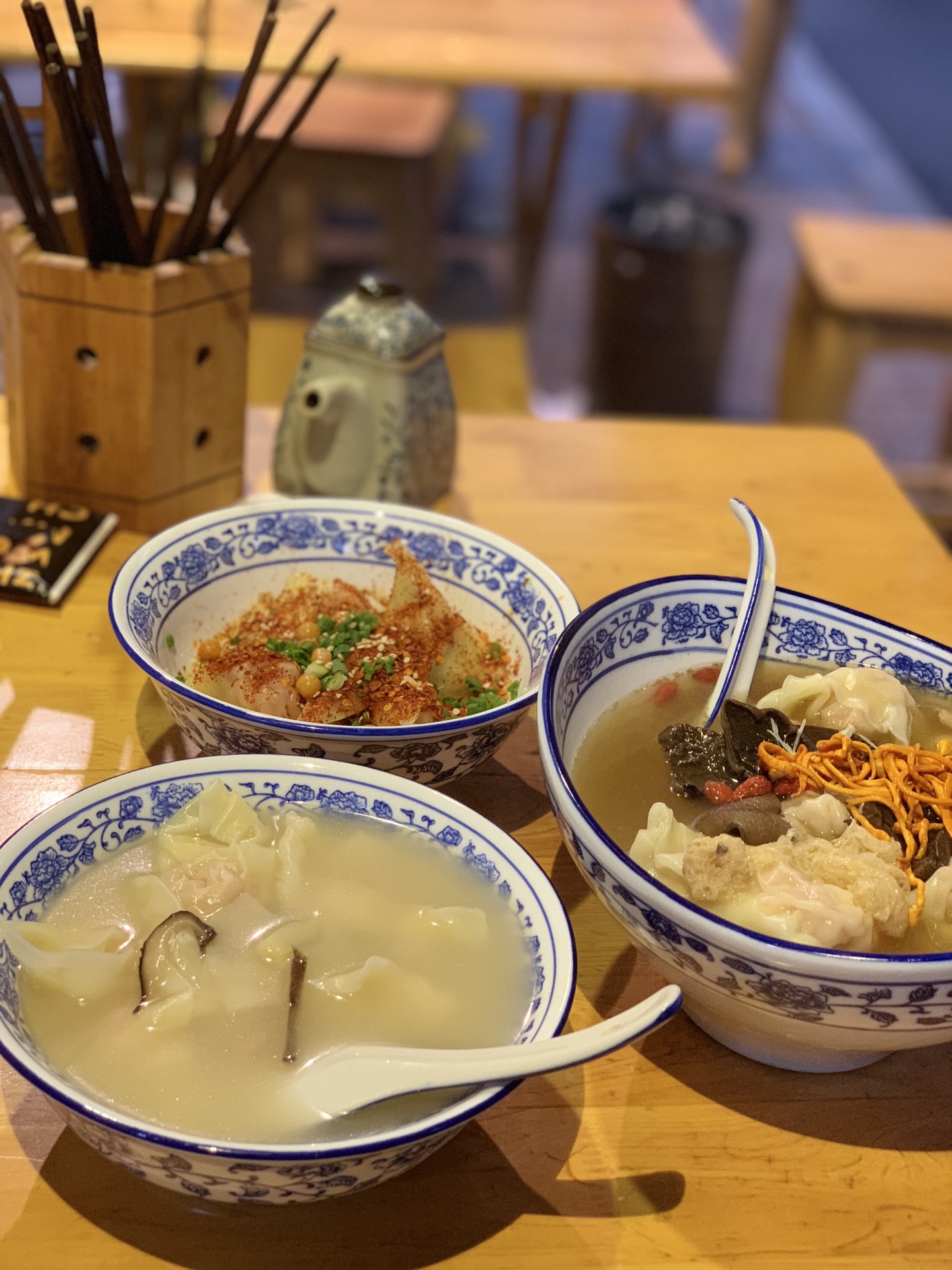 对于抄手,其实我个人还是很喜欢的啦!这家店真的是种草很久了,要不是因为距离原因,早就过来拔草啦!! [环境]小店就在李家沱的附近,不过从地铁站下来还是有一定的距离。骑个自行车,还是很方便的啦!小店很有情调,面积不大,一看就是老字号哦! 「海味抄手」当然要吃点养生的,清淡的啦!个人觉得抄手不错,汤底也很鲜美的哦! 「干拌抄手」这有点超出我的预料,稍微有点辣,哈哈哈哈。不过不得不说口感真的很不错,味道很出色! 「竹笙牛肝菌鲜虾蟹籽抄手」招牌主打的抄手,每一个真的有点大!里面有一个大虾虾哦!肉质很棒,汤的味道也很好喝,值得一试啊!!