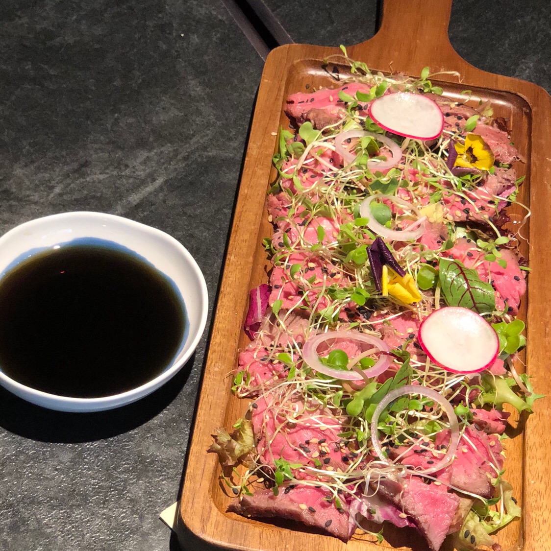 第一条点评给我最爱的日料~ 日料新店[拔草]探店~森空和食。中华城新开业的,就在电影院边上 装修真的是极简风,其他店很难hold住这种风格,而且从餐具的小细节就可以看出真的是很用心 「综合刺身」必点菜,三文鱼和甜虾品质很好,厚切三文鱼真的是实名推荐 「低温慢煮牛肉」牛肉不是全熟的,有一点点生,但是味道也很棒 还有一个「黑松露啤酒炸鸡」别被黑乎乎的外表欺骗,炸鸡味道不比韩国炸鸡口味差 还要推荐「南瓜汤」「海胆水饺」 推荐指数⭐⭐⭐⭐⭐ 值得打卡和拔草的店