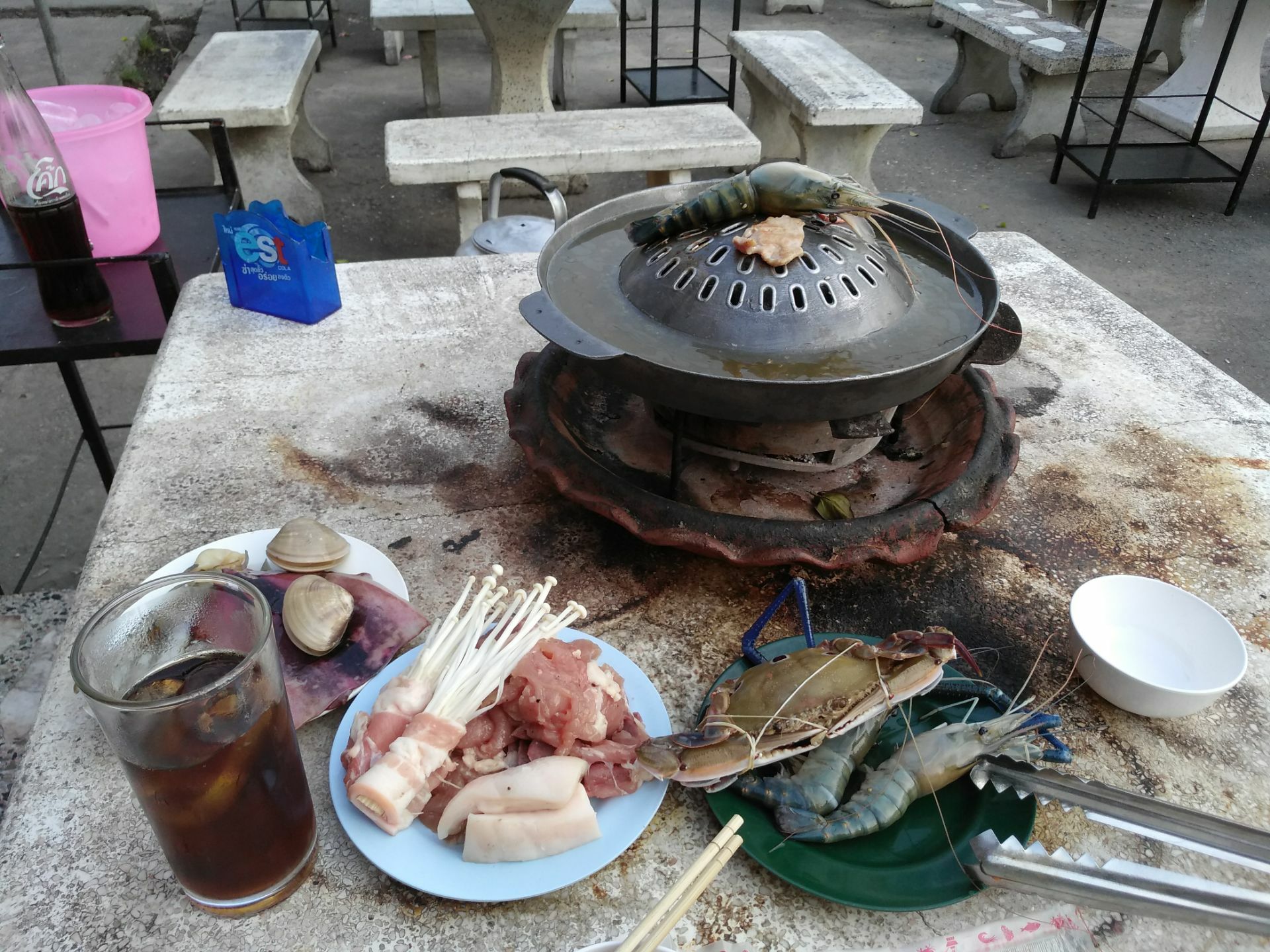 在泰国有一种文化叫做夜市文化,这和他们白天的气温非常热,是有这紧密的联系的。在晚上的时候气温降低,大家都出来活动啊,各个摊位也都出了起来。北碧作为泰国的县城城市,虽然晚上的夜市没有大城市里面的热闹,但是也较为集中。从桂河大桥一路步行到城中心,这一条路上都是零零散散的夜市。最好吃的就是这个海鲜自助了。