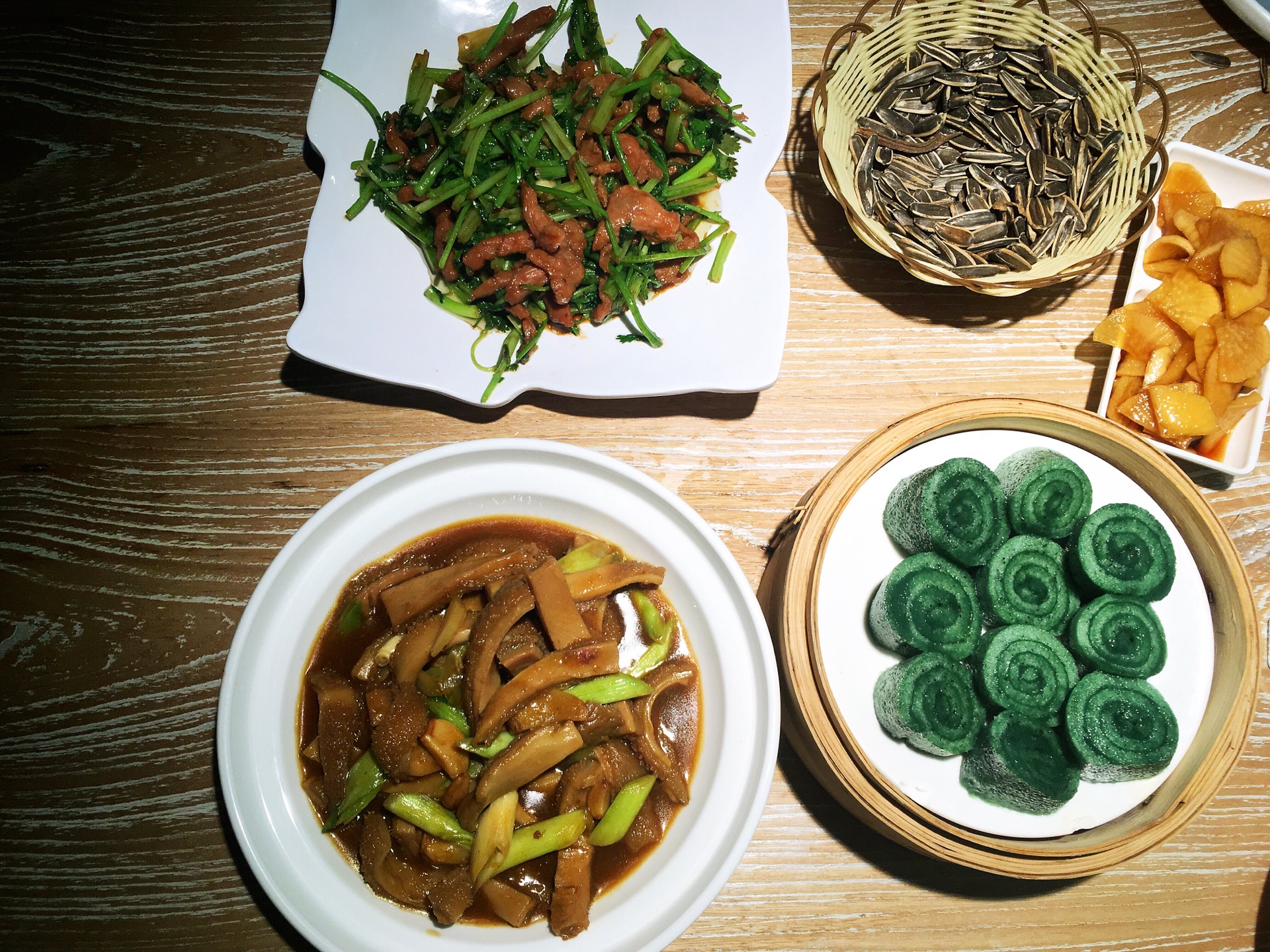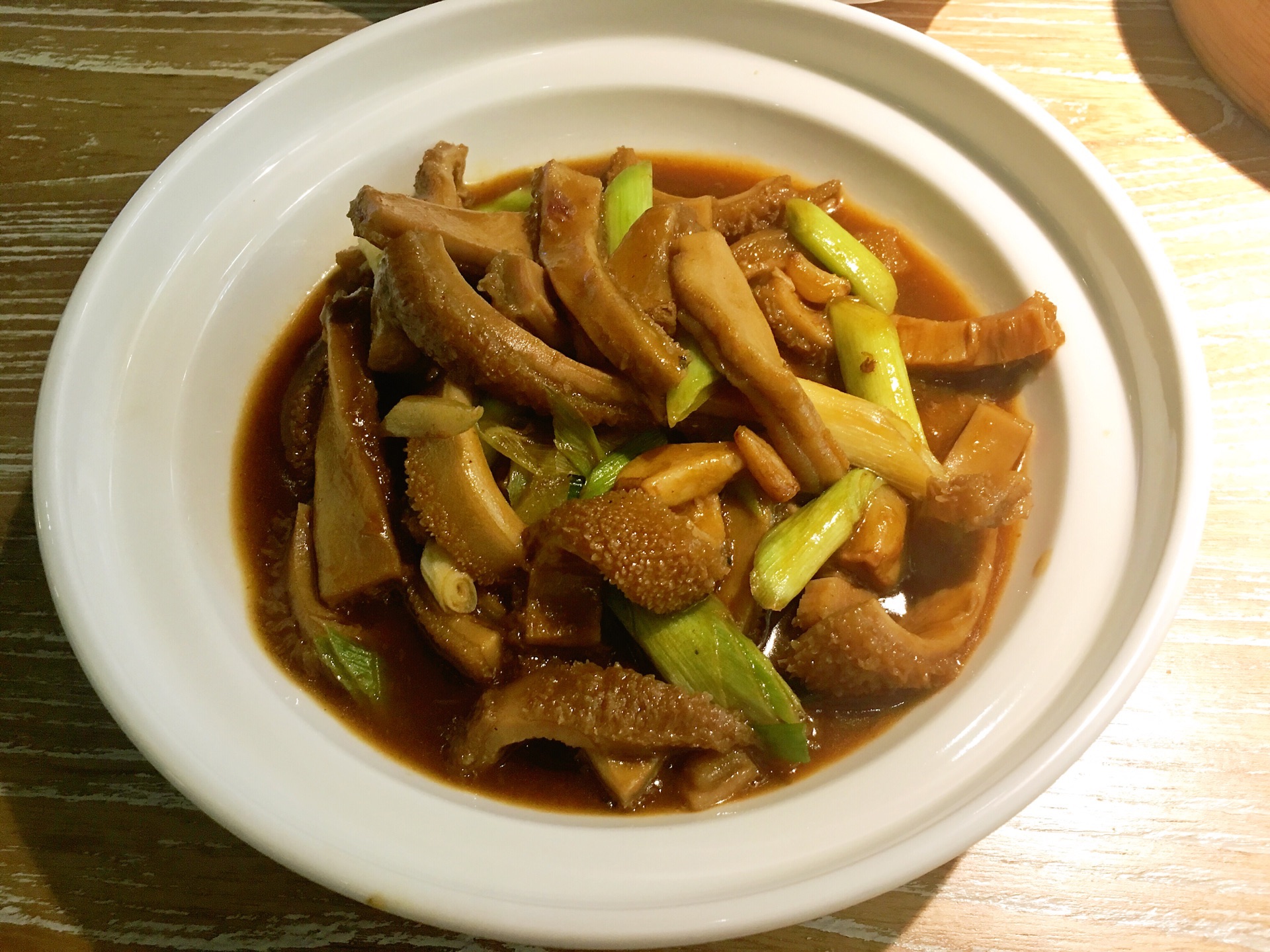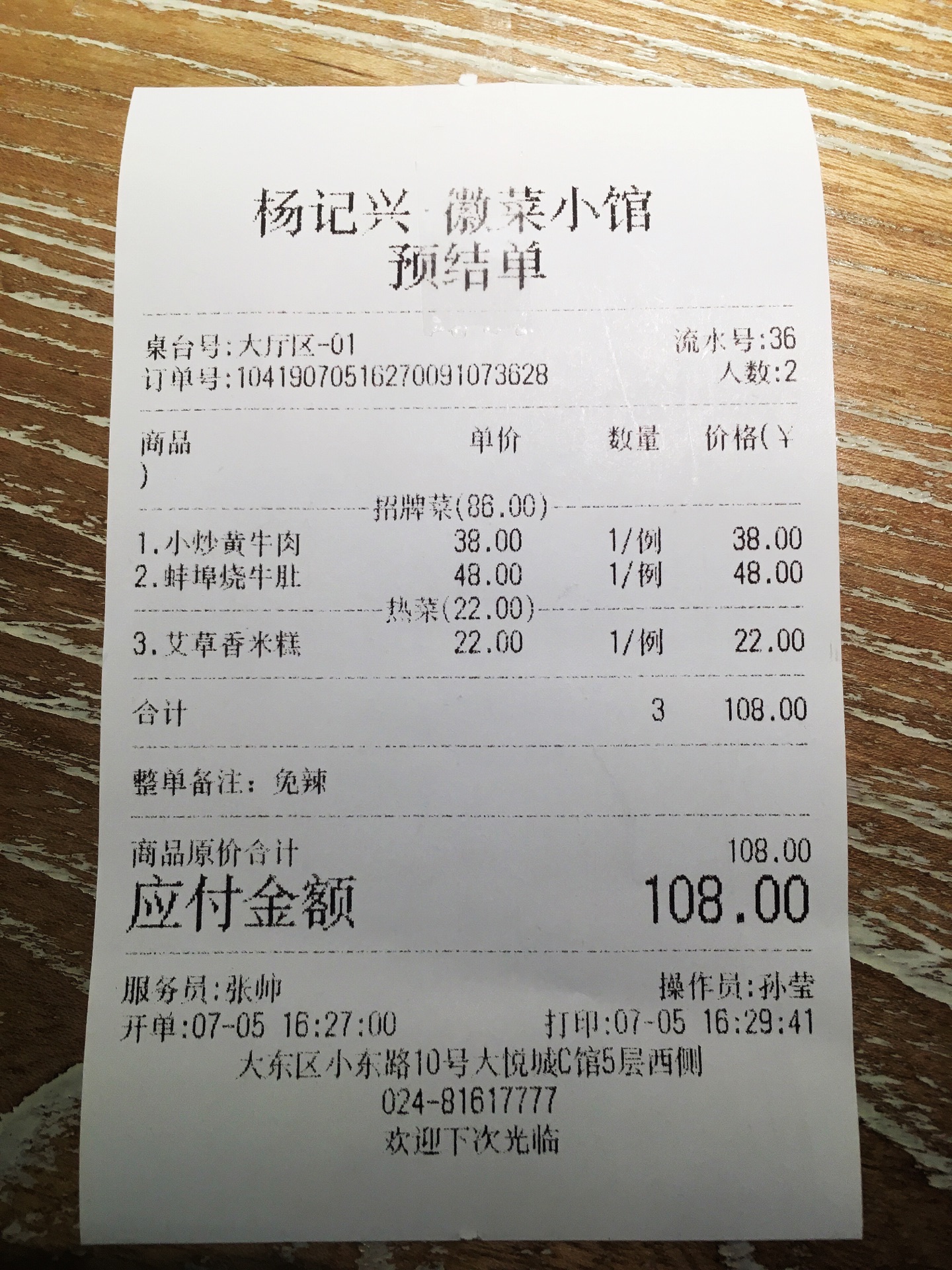 七刷|杨记兴 这一次竟然遭遇了杀熟。 去的时候店内几乎没什么客人,所以可以排除厨师太忙,不存在太忙而照顾不周的情况。 『环境』发现装修多了一些绘画的艺术氛围,尤其是圆形小菜台后面的水墨画,枝头垂柳处站着的小鸟,也许是黄鹂,很是好看。每个餐桌上摆着一个小花瓶,上面插着些许鲜花,是粉色和白色的小雏菊。 依然是买了外婆常吃的几份菜,菜品上桌后,快速地拍了照片,就打包回家了。 到家后才发现竟然被杀熟了。 『蚌埠烧牛肚』牛肚烧的很有嚼劲儿,搭配着些许葱段,味道还是很不错。 『小炒黄牛肉』正如照片中所示,所有的小黄牛就是图中这么多。以前还是西芹,今天就是硬硬的芹菜!等于我花38元买的不是什么黄牛肉,而就是四分之三的硬芹菜。我不知道今天厨师是怎么想的?!何不干脆给我一盘炒芹菜?! 『艾草香米糕』这款甜点一直都是我们的最爱,每次来的必点菜品。