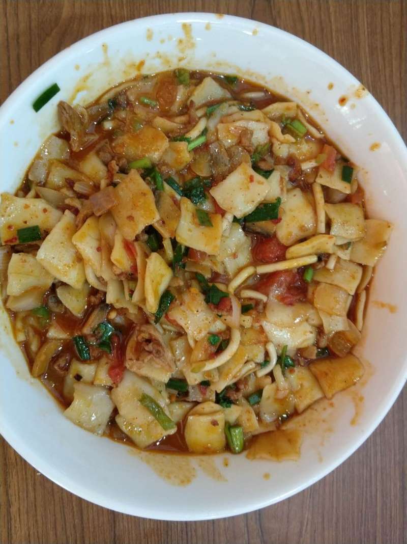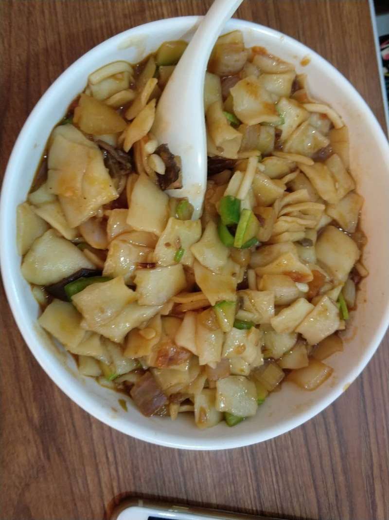 牛肉炒面片,味道棒极了!完全手工制作,面片儿嚼着很劲道,加牛肉、蔬菜(葫芦、洋葱、青椒、番茄成丁),可以和新疆的炒面比美!甚至更美味…。老公吃的是新品羊肉炒面片,对他胃口的很,说“可以比肩”新疆炒面…店里供应的饮品味道也独特,是枣和玫瑰花等冲制成的饮料哦……