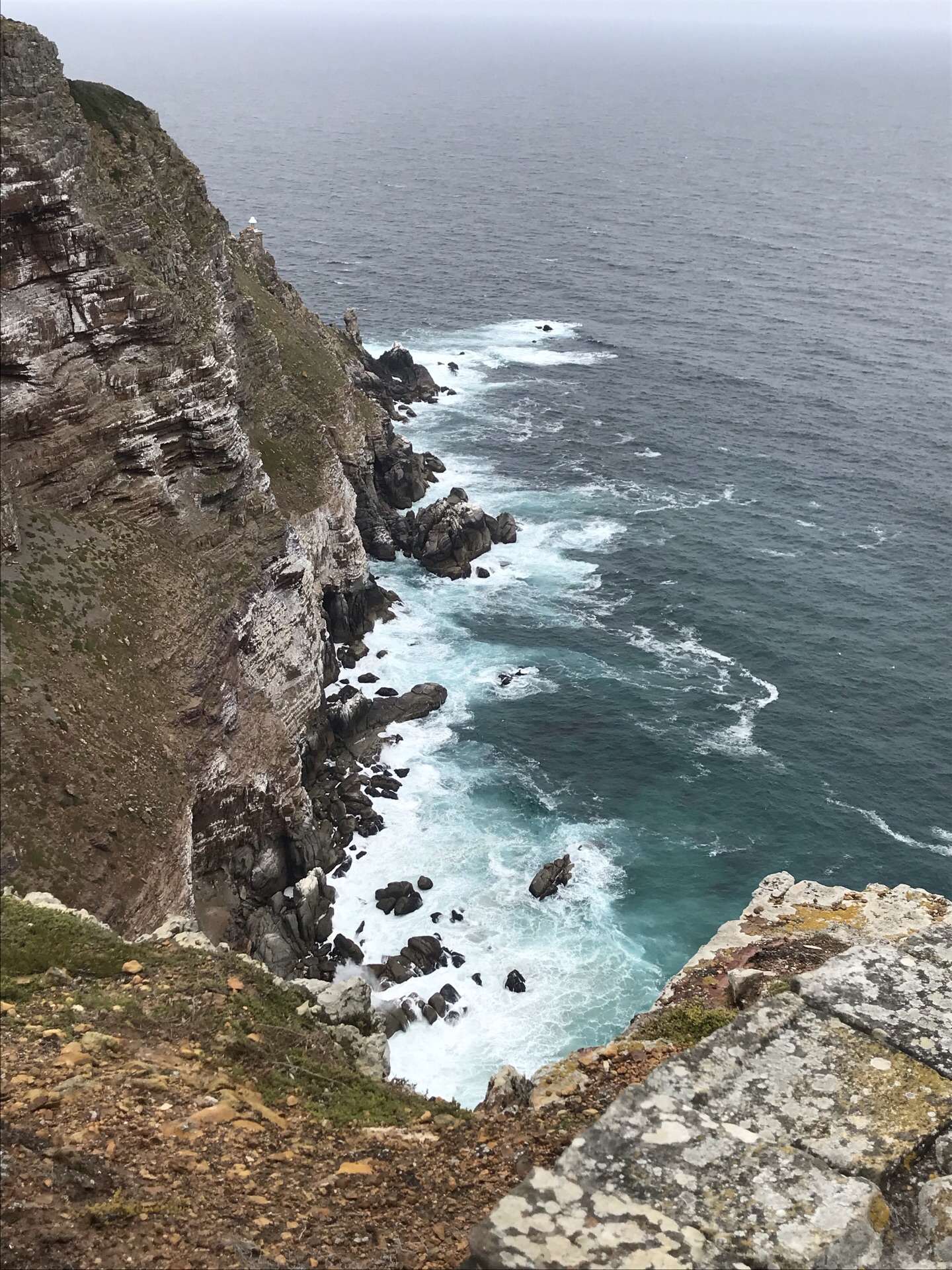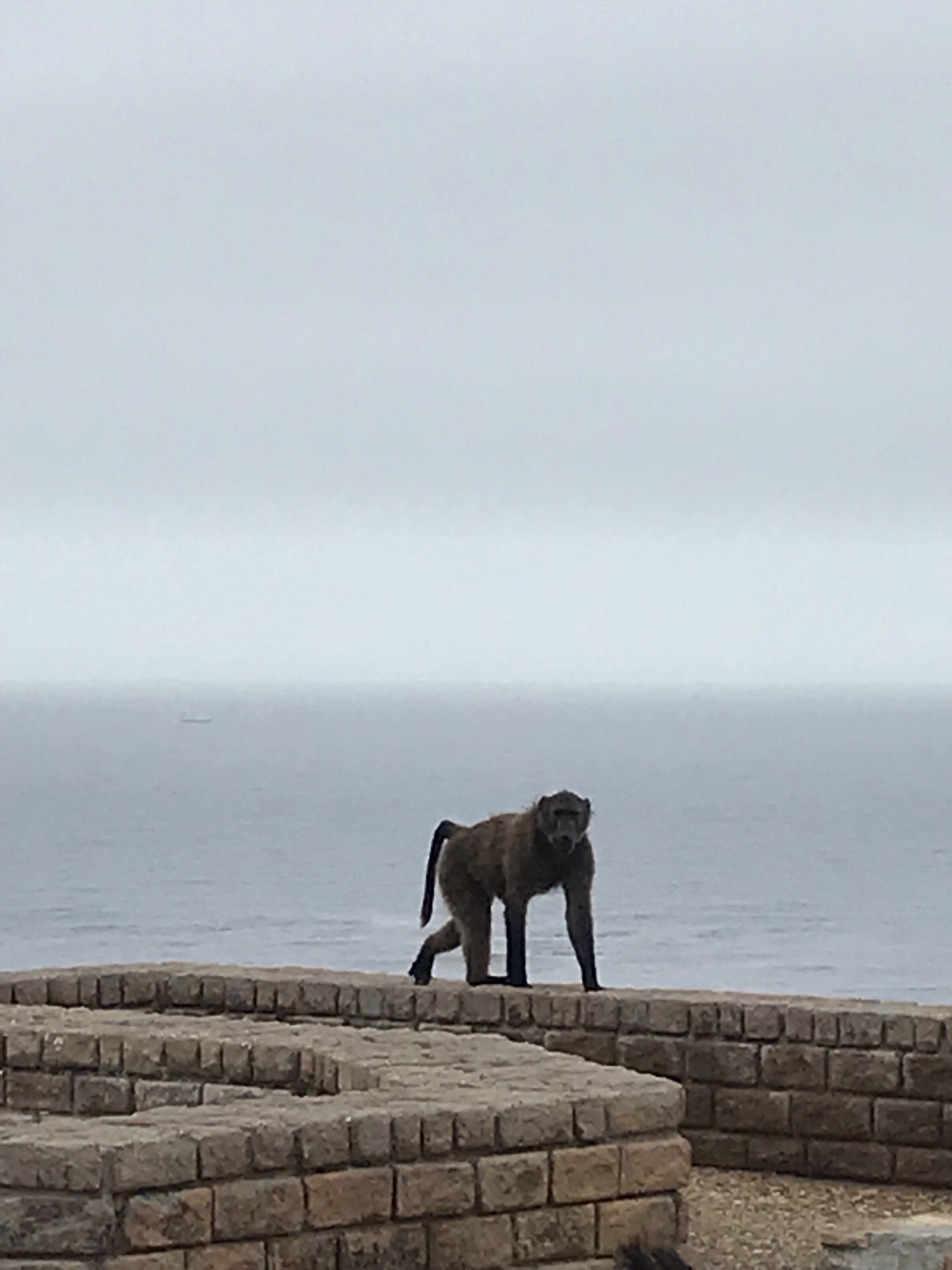 来南非确实感觉人和自然和谐共处了,到哪里都有野生动物相伴,这个叫开普角,是脚踏两洋的灯塔,大西洋和印度洋。 这边大西洋海水比较冷,印度洋海水比较热,所以两股交汇形成很大的风,但是两洋交界肉眼是看不出来的,只能从海水成分分析,大西洋海水矿物质相对比较丰富。 这边避免不了风大,多数人都是坐登山小火车上去,步行下来,步行下来十几二十分钟就可以了。但要小心这里的狒狒,他们抢东西吃和抓人抢包时有发生。吃的喝的不要出现在它们面前就好。