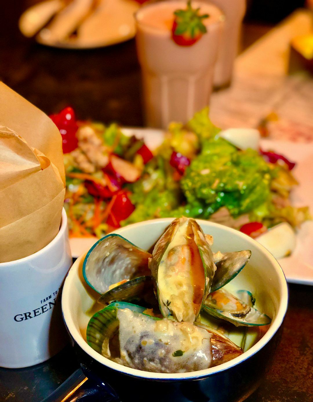 GREEN & SAFE 「章姬草莓塔」 草莓鲜甜,奶油浓郁搭配塔底微微酒香。 「松露牛肝菌蘑菇披萨」 黑松露!半熟溏心鹌鹑蛋!各种菌菇! 薄底披萨,不愧是招牌,全都是超喜欢的搭配,解决一片轻轻松松无负担。 「新鲜黑松露波士顿龙虾炖饭」 龙虾大只新鲜炖饭鲜美,米粒嚼劲十足,是令人满足的饭。 「肉食者派对烤肉拼盘」 食肉动物强推这款,特别适合朋友分享,猪牛羊排配热红酒超赞。 「野生黑松露咸筒」 咸筒四吃,咸口黑松露搭配轻脆蛋筒皮,两口一个超赞。 「色拉三吃」 有薏仁藜麦草莓玉米烤蔬菜和尼斯色拉,作为一份西餐沙拉份量喜人。 「奶油白酒蒜炒青口贝」 奶油蒜酱汁包裹的青口,蘸烤法棍超香 「牛油果香蕉果昔」「草莓果昔」 纯天然的新鲜甜美,喜欢。