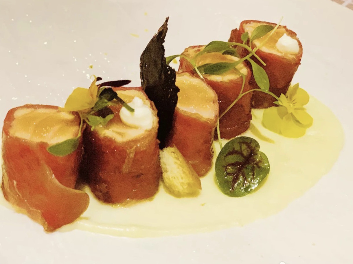 完全不同的口感层次感非常丰富 美美仙仙的鹅肝慕司芒果冻 来自西西里岛创意的混合香草盐焗比目鱼 ...