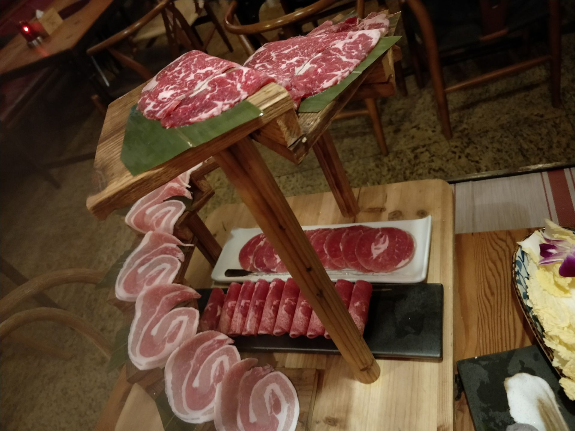 网上查到的资料显示是家西餐厅,到店发现实际既是西餐厅又是火锅店,两者用一堵薄墙分隔。 点了一份肉拼、一份虾滑和鸭肠等。肉拼由四种肉组成,摆盘很漂亮,涮得时间稍有不同,味道还不错。虾滑很有弹性,能吃出虾肉。 整个用餐期间,服务员都很热情,尤其是那位小姐姐,谈吐很风趣。