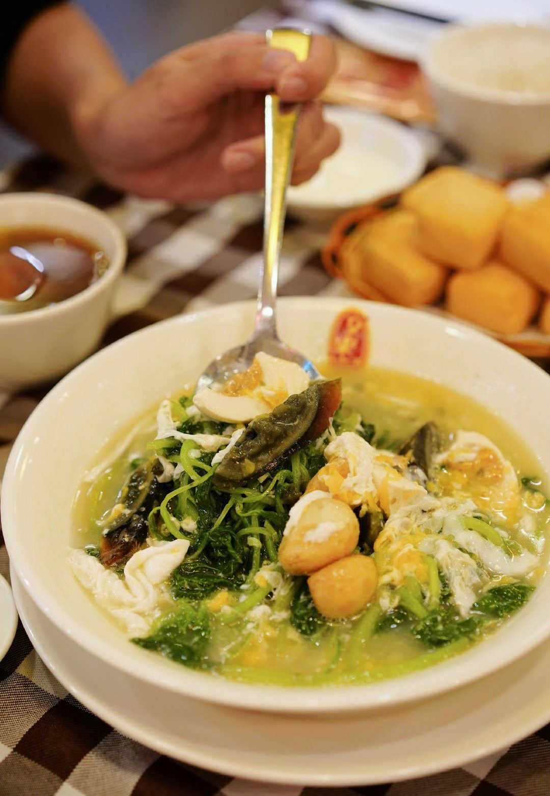 白切鸡绝对每桌必点。 鸡肉很细嫩,连鸡胸的部分都嫩出汁水。鸡皮又滑又薄透,超喜欢。上桌的时候淋上酱油,味道清爽但鲜味十足 ,可以根据口味再搭配黑酱油或辣酱。 鸡油烹煮的米饭蓬松油润,咸鲜味渗入了每一颗米粒,香气扑鼻,一碗都吃不过瘾啊。 脆皮豆腐 仅次于鸡饭的必点!皮太薄太薄了,除了入口那一瞬间的清脆和咸香,几乎都感觉不到。里面的豆腐白白嫩嫩的,黄豆香气巨浓郁,大概是初恋的味道。 纸包鸡 包住再烤出来的鸡肉除了嫩,更是完全锁住了汁水,微甜的叉烧酱加上料酒调味,是不同于白切鸡那种鲜浓的好吃。 虾多士 也是招牌菜,调味好的虾泥涂在吐司上,下锅油炸。吃过很多虾多士,他家的用料可以说数一数二!虾肉弹嫩鲜美,吐司松软香甜,搭配美乃滋,趁热超好吃。 金银蛋苋菜 可能是吃过做法最实在的。皮蛋,咸蛋,滑蛋,加起来都快比苋菜多了,里面糯乎乎的蒜头也超爱!配料这么狠, 汤底还能不鲜么。