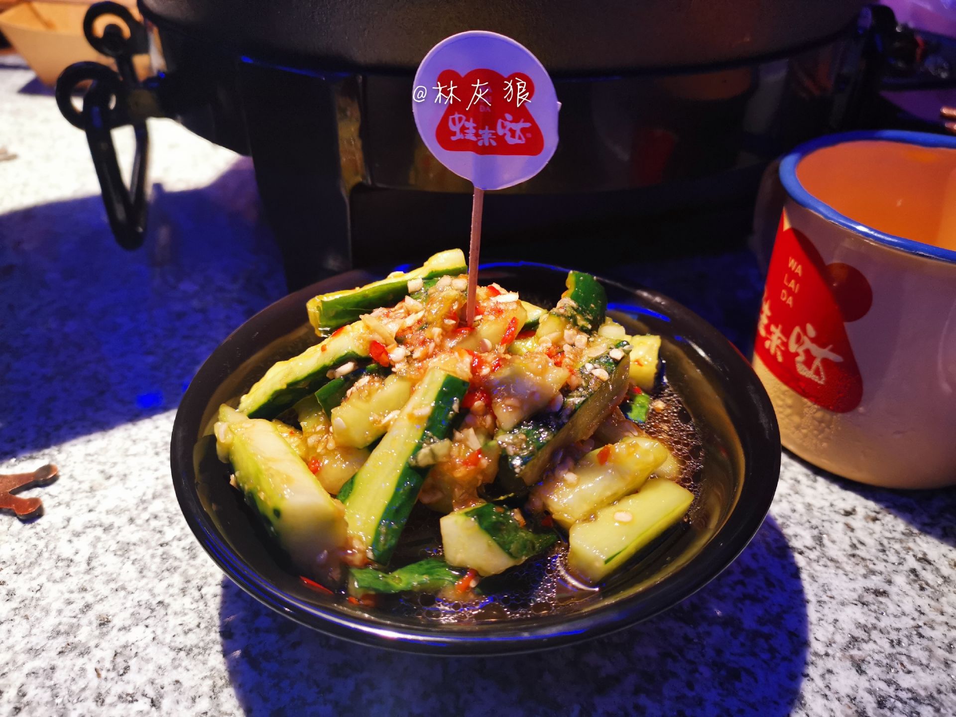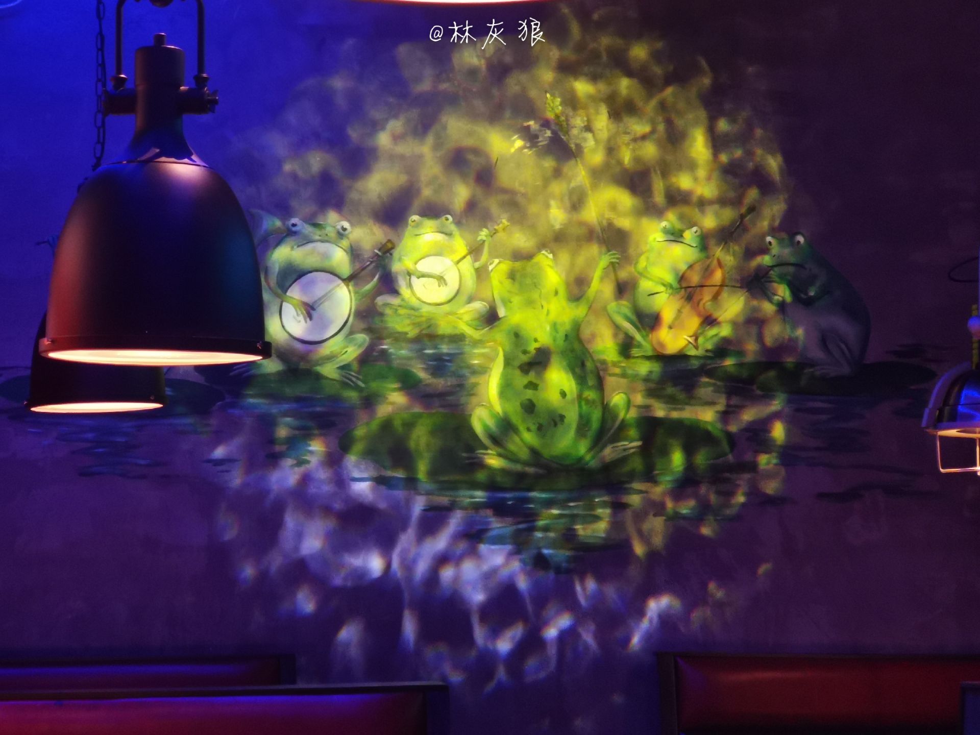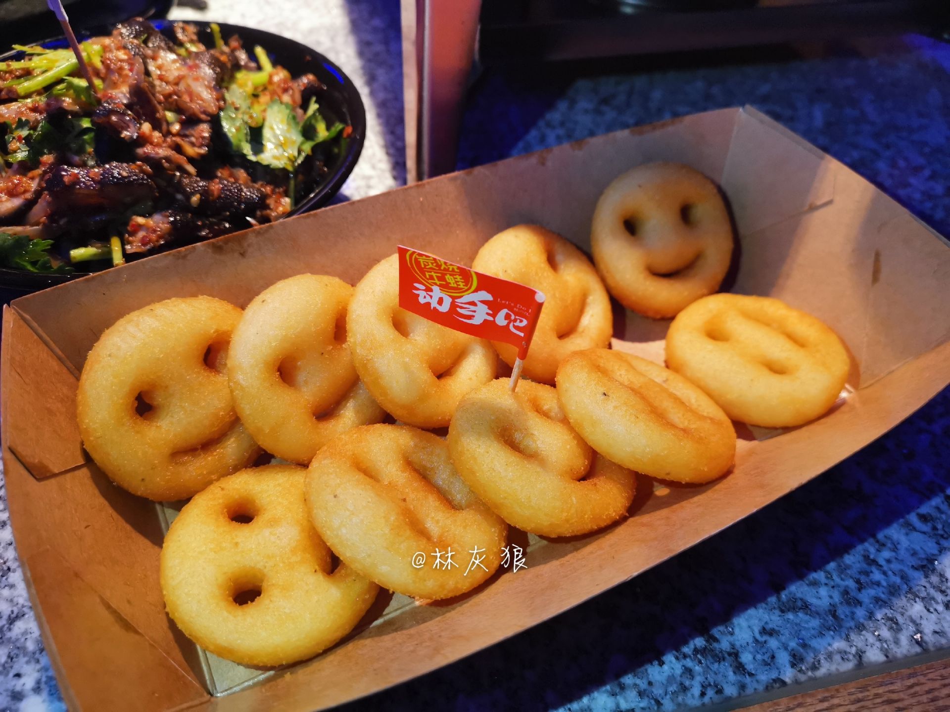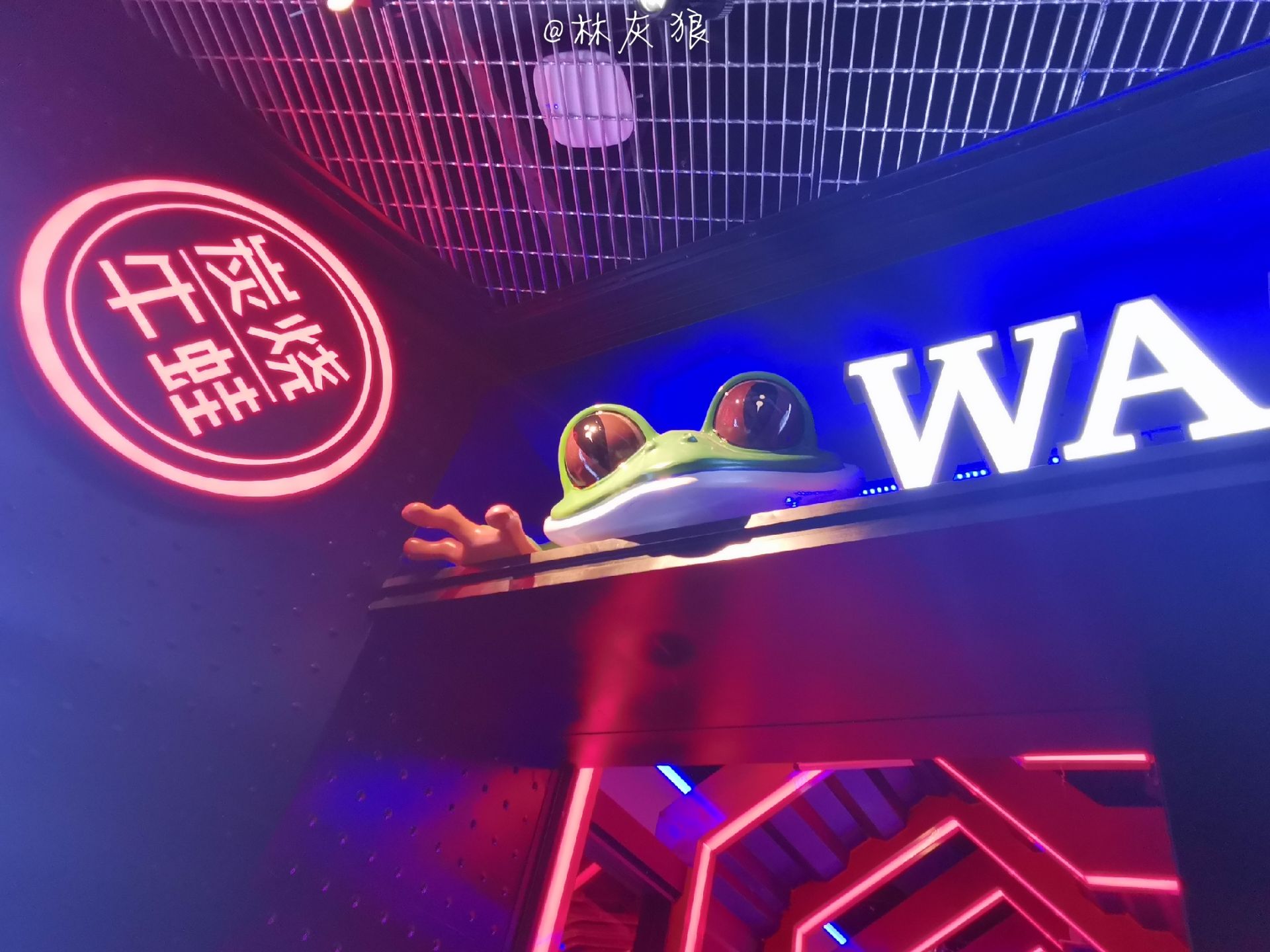 蛙来哒,好吃得让人“哇哇”大叫的炭烧牛蛙。 中华城店的装修风格,偏向于美式的酒吧风。变幻的霓虹灯流光溢彩,蛙蛙主题的独特装修,时尚酷炫中又有一丝暖萌。 鸡汁菌菇味牛蛙泡锅 不辣的鸡汁菌菇味泡锅,汤汁浓郁。牛蛙浸泡在咕噜噜的冒着气泡的汤汁里,特别的诱人。每一只牛蛙的肉质都很细致,吃起来又滑又嫩。汤汁里面加的辅菜都浸足了汁水,菌菇、豆皮、白菜都特别的鲜香入味。 开心薯饼 笑脸形状的马铃薯饼,外皮很酥脆,内里又很绵密。 青柠乳酸菌 乳酸菌加上柠檬的清香,入口细滑,也特别助消化。