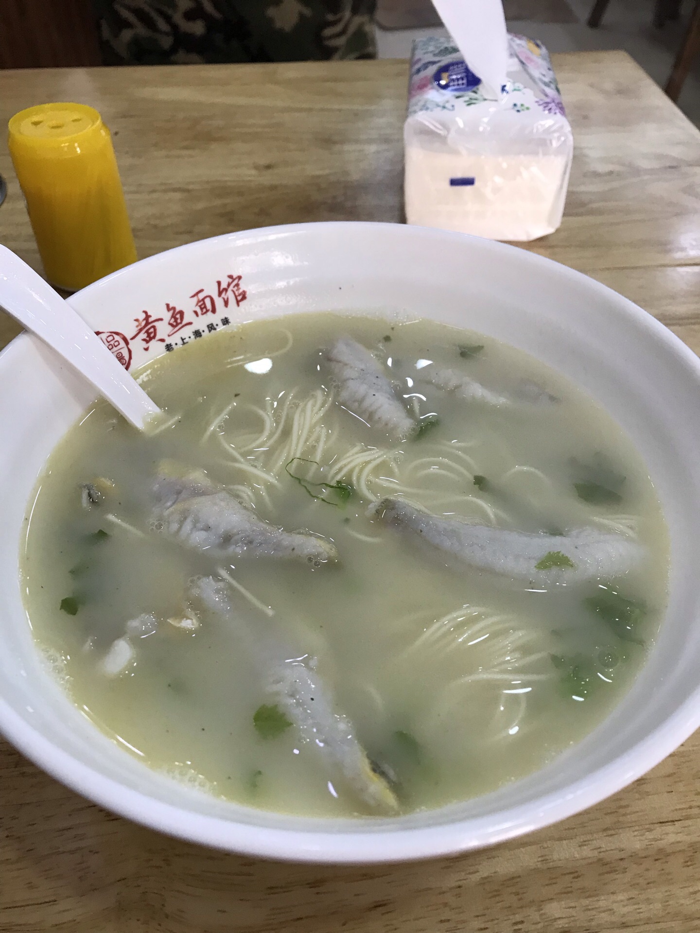 蓝村路上名气很响的面馆,黄鱼面,黄鱼春卷,都名声在外。最近去,发现价钱略有上涨。黄鱼面,原汁原味的汤底,黄鱼都是剔骨处理好的,这碗面,让人回味无穷。炸猪排就比较一般,大骨头和筋占比很多,真正入口的部分差不多只有一半了。