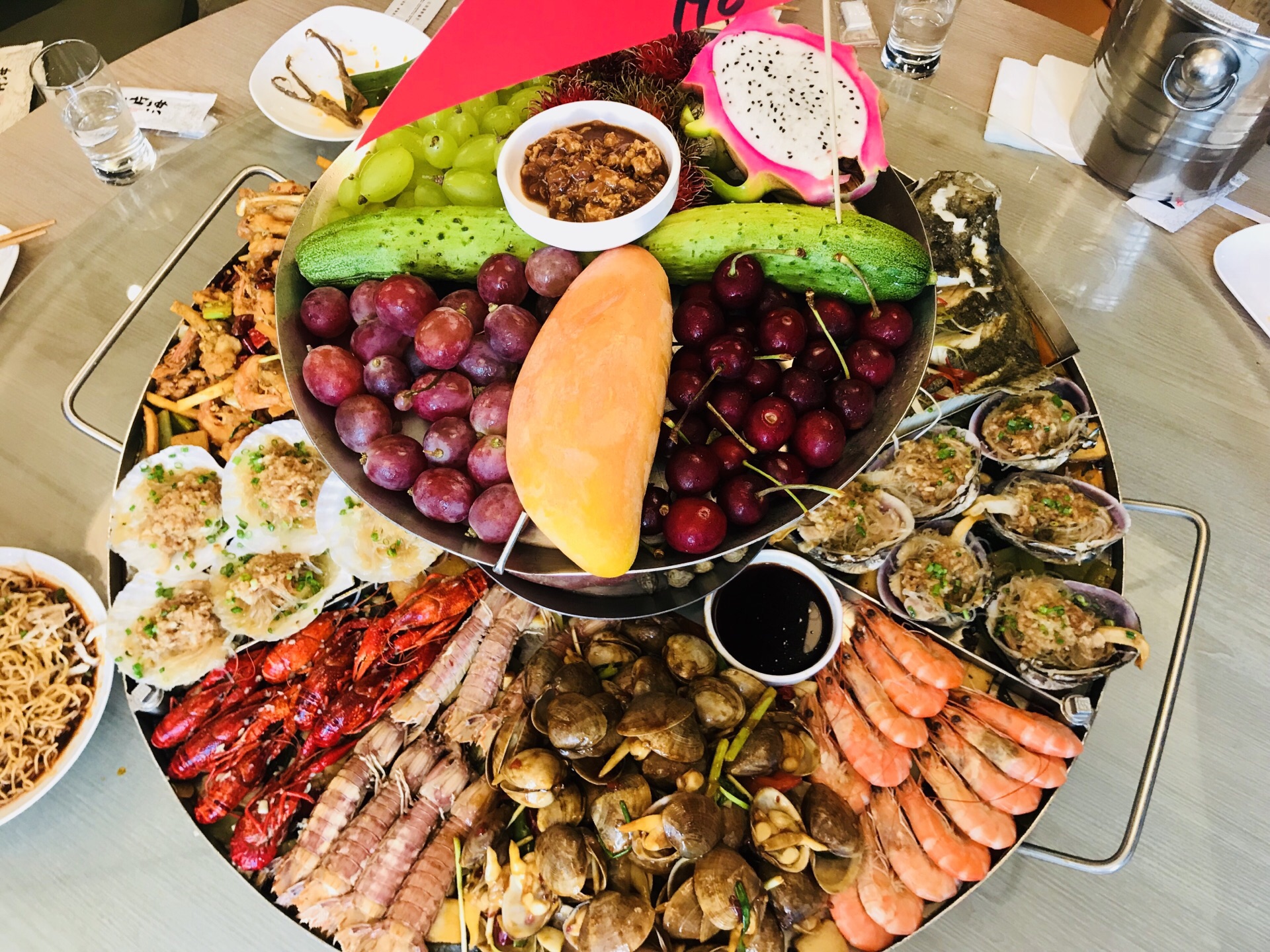 一共三层,感觉每一种食材都是店家精心挑选,合理搭配出来的。花生居然意外好吃,卤的很入味。最后都吃饱了,愣是又把花生吃光了,一粒不剩,红薯甜甜的也不错。尤其是是最上层的水果,虽然海鲜没那么油腻,但吃多了难免想吃点清爽的水果,车厘子,芒果都很不错。鲅鱼饺子还可以,蘸酱油沾醋都行,鸭舌一般。“叫个鸡”居然要100多块钱,里面根本就没几块儿鸡肉,放了一堆花椒和黄瓜,还很难吃,唯一败笔啊……但海鲜大咖确实不错。划重点!服务员会帮忙把海鲜剥皮,所以虾蟹都帮忙!特别贴心