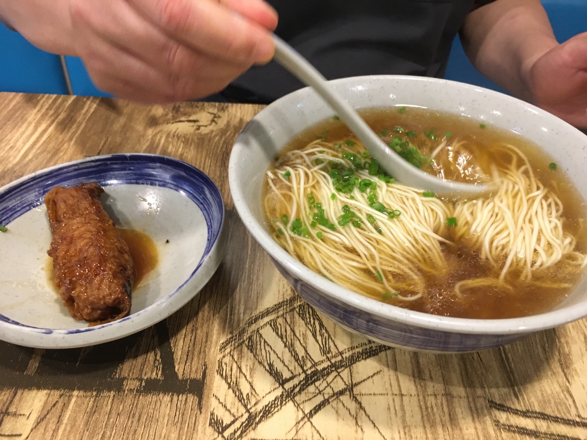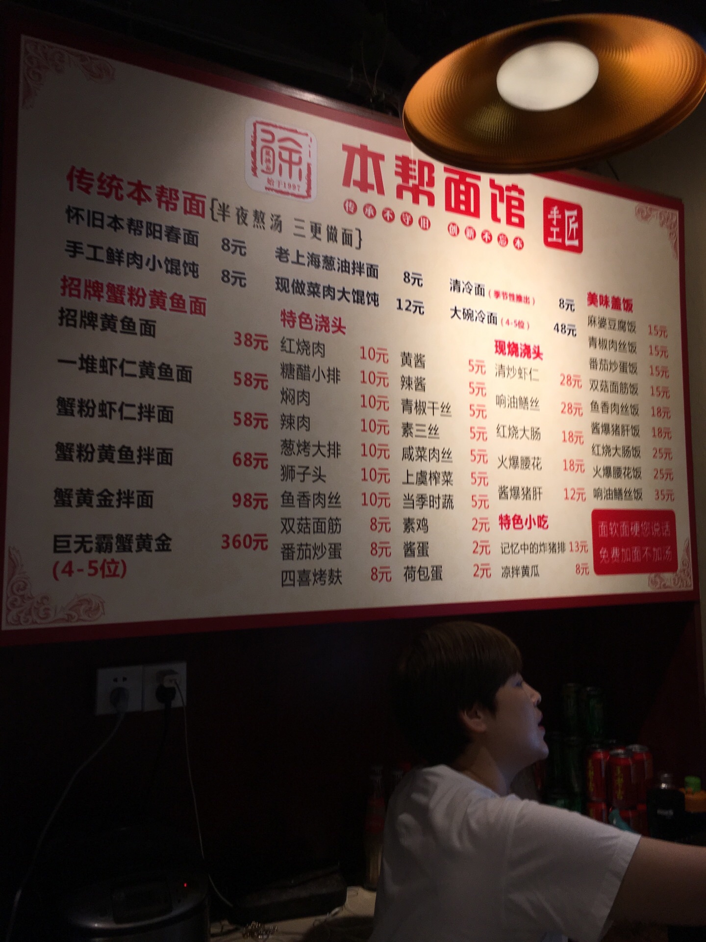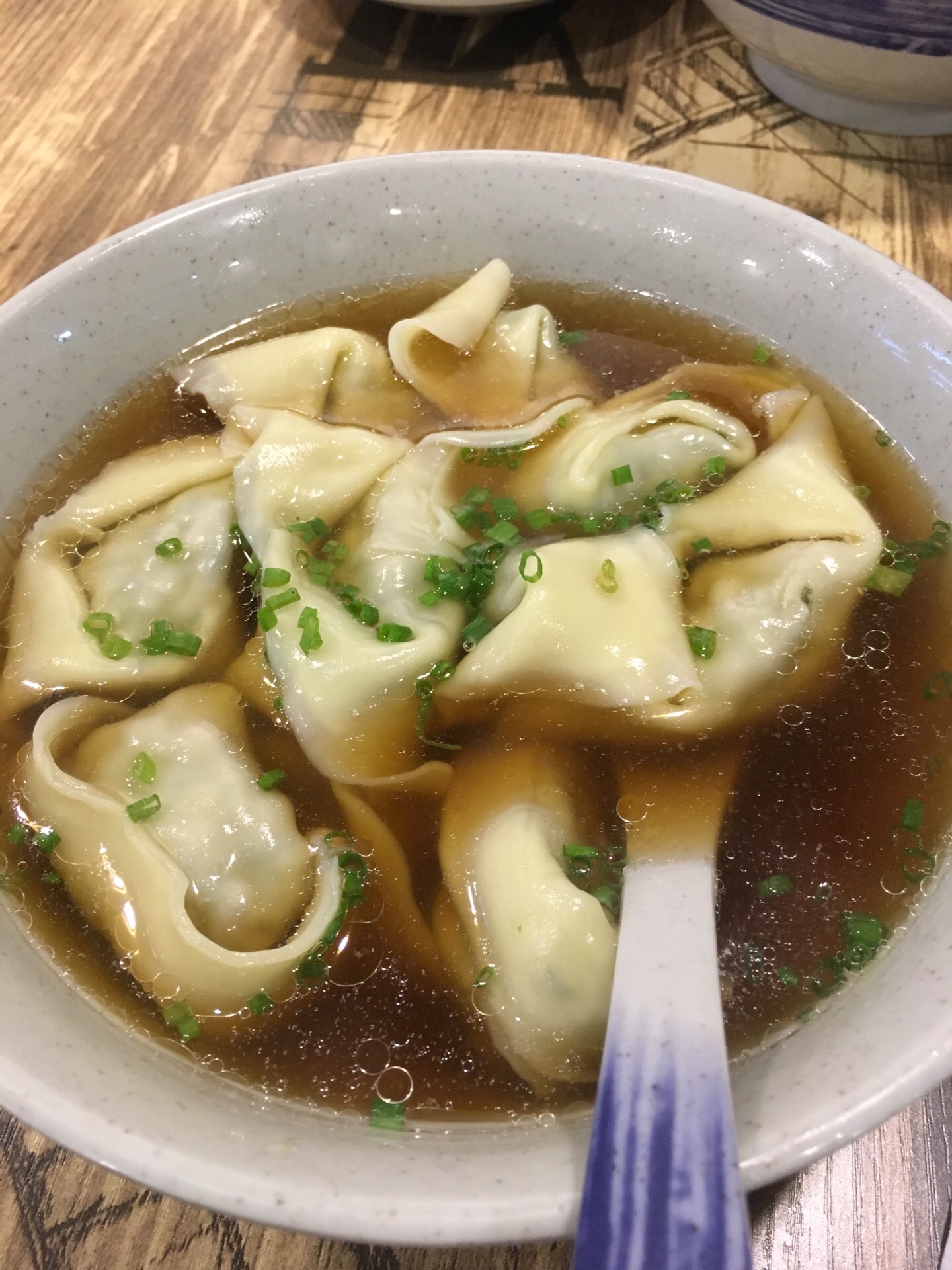 寻着网红金桥阳春面第二名来的,晚饭时候客人不算多,小店蛮干净的,老板娘是阿拉上海人,管理的不错,桌子上放着整瓶原装的香醋和黄牌辣酱油,不会像有些店里给客人用的是勾兑的调料。主角阳春面当仁不让地上了当地的金榜,汤清(宽汤)、面健(细面有劲)、油香(猪油飘香)、葱绿,色、香、味都有了,赞,如果汤色再稍微浓一点会更好,浇头要了第一次尝试的黄酱,原来是腐皮包肉,和名字完全不搭界的,好吃。大馄饨也不错,皮稍微硬了一点点,荠菜鲜肉挺香的,汤里也有猪油。