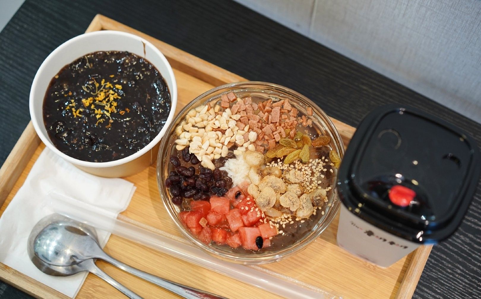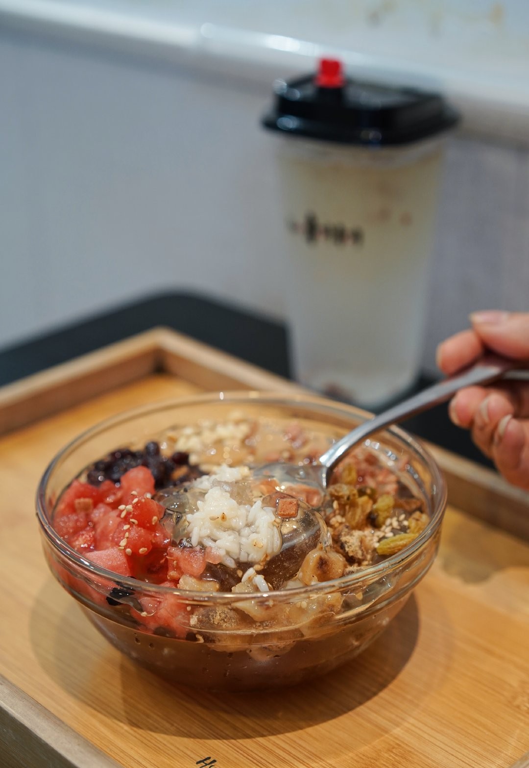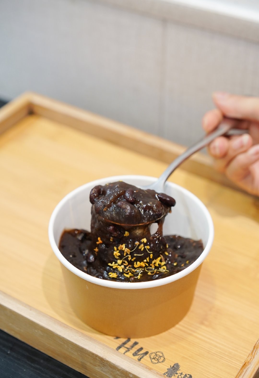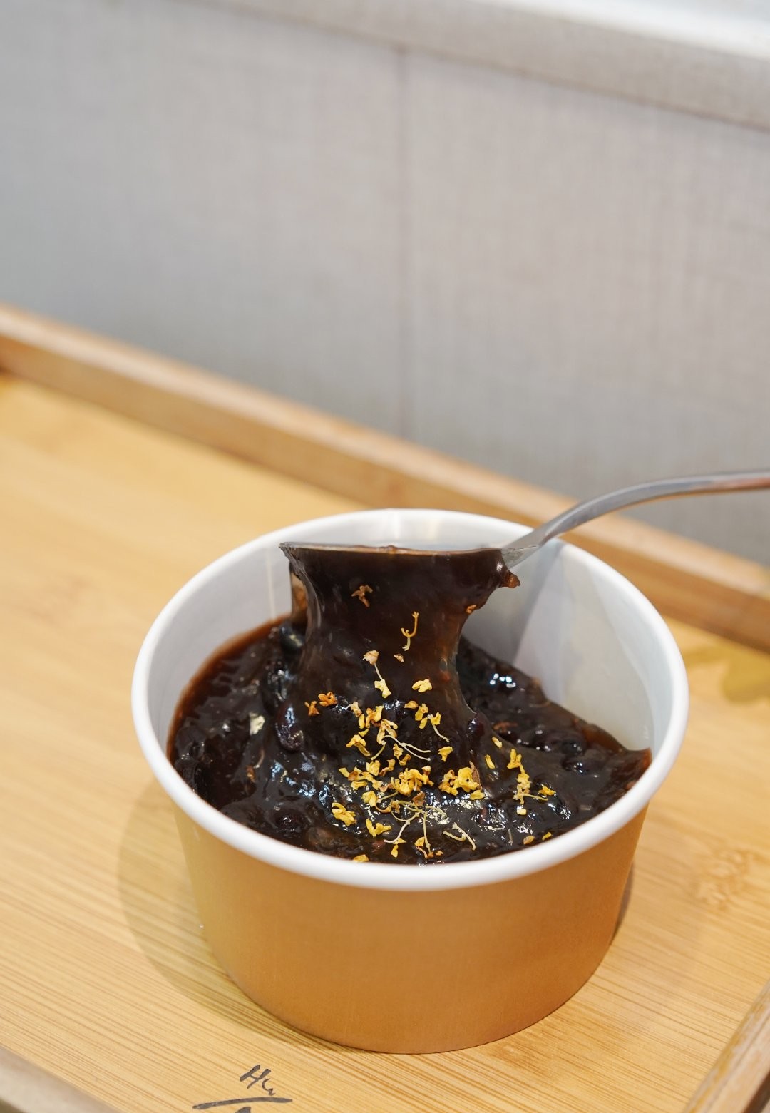 黑豇豆混地瓜粉,却很像红豆沙混合藕粉的口感,但藕粉是糯而嫩的,豇豆莳却很有韧性,拉都拉不断,一勺子可以把整碗舀起来。 口感温温热热的,能吃到煮糯的黑豇豆,还能闻到桂花的香气。 大满贯冰粉 也是他家点击率很高的一款甜品。冰粉的口感真的嫩啊 夏天吃超爽的! 酸酸甜甜的葡萄干和山楂,粉甜的红豆,清爽的西瓜,花生碎和白芝麻增添香气。最喜欢里面的小麻糍,糯唧唧的。 一般不喜欢料很多的甜品,感觉会影响了冰粉本身的味道,但他家的份量控制的很好,竟然不会觉得累赘。 蜜水凉菜膏 也是个神奇的东西,像爱玉仙草之类的口感,但有点脆嫩,还会有薄荷的凉意。 主打台州小吃甜品,价格不贵,蛮多都很有特色。