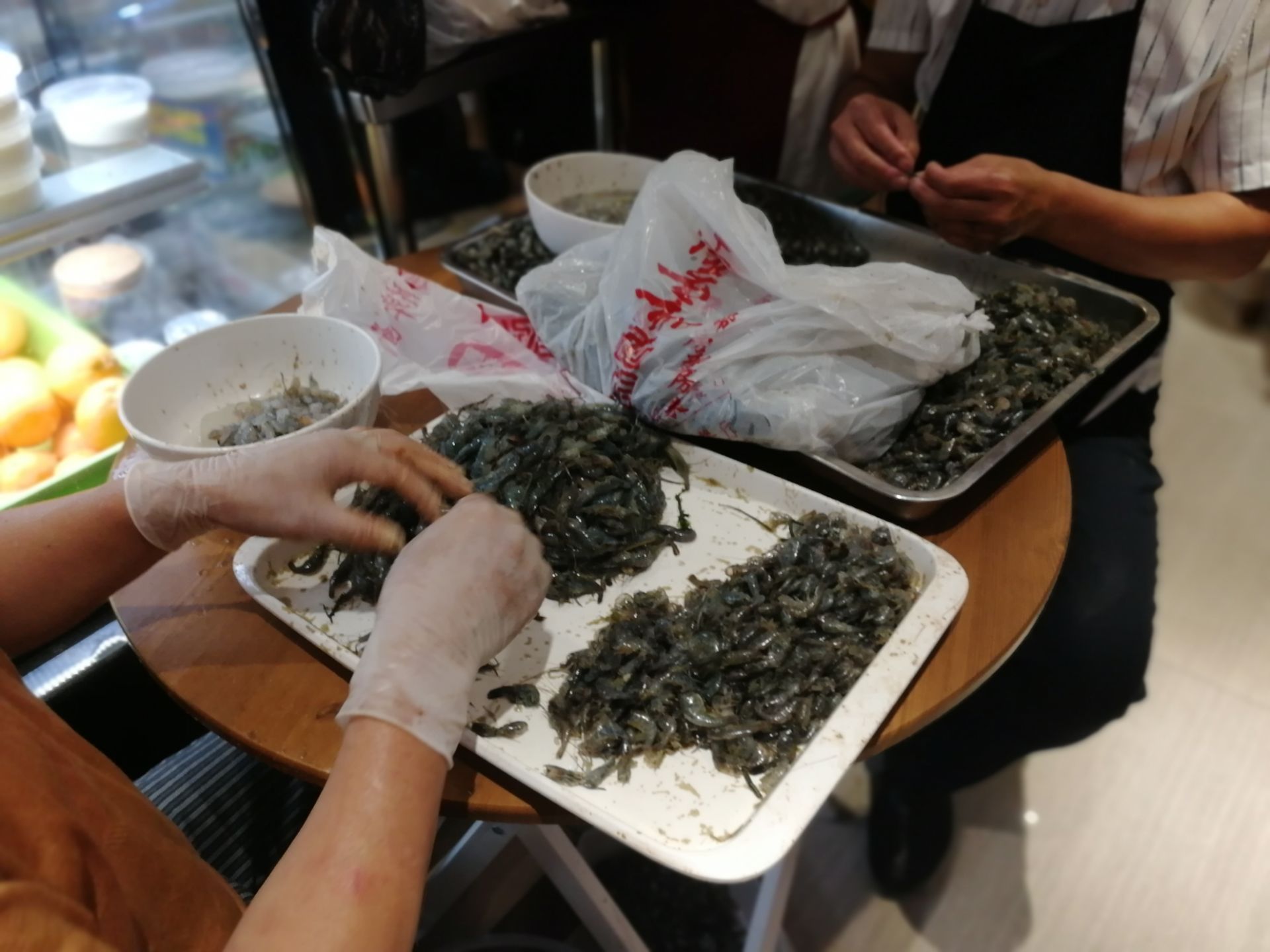 这是我第一次吃三虾面的小店,说来也巧,是路过这家店看到很多人排队才突然想改天来尝尝三虾面,于是第二天晚上就来了。门口的小桌子有人现剥虾仁,三虾面上来的时候浇头已经在面上了。拍了没几张照,面已经有点僵硬比较难拌开。虾仁很新鲜,非常嫩,比苏州吃的要嫩,但是面就没法和苏州的比了,偏干,偏淡,汤汁少,要吃到下面才适中。整体还是不错,可以一吃。