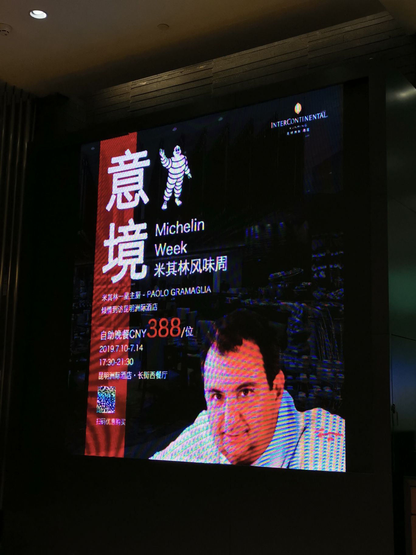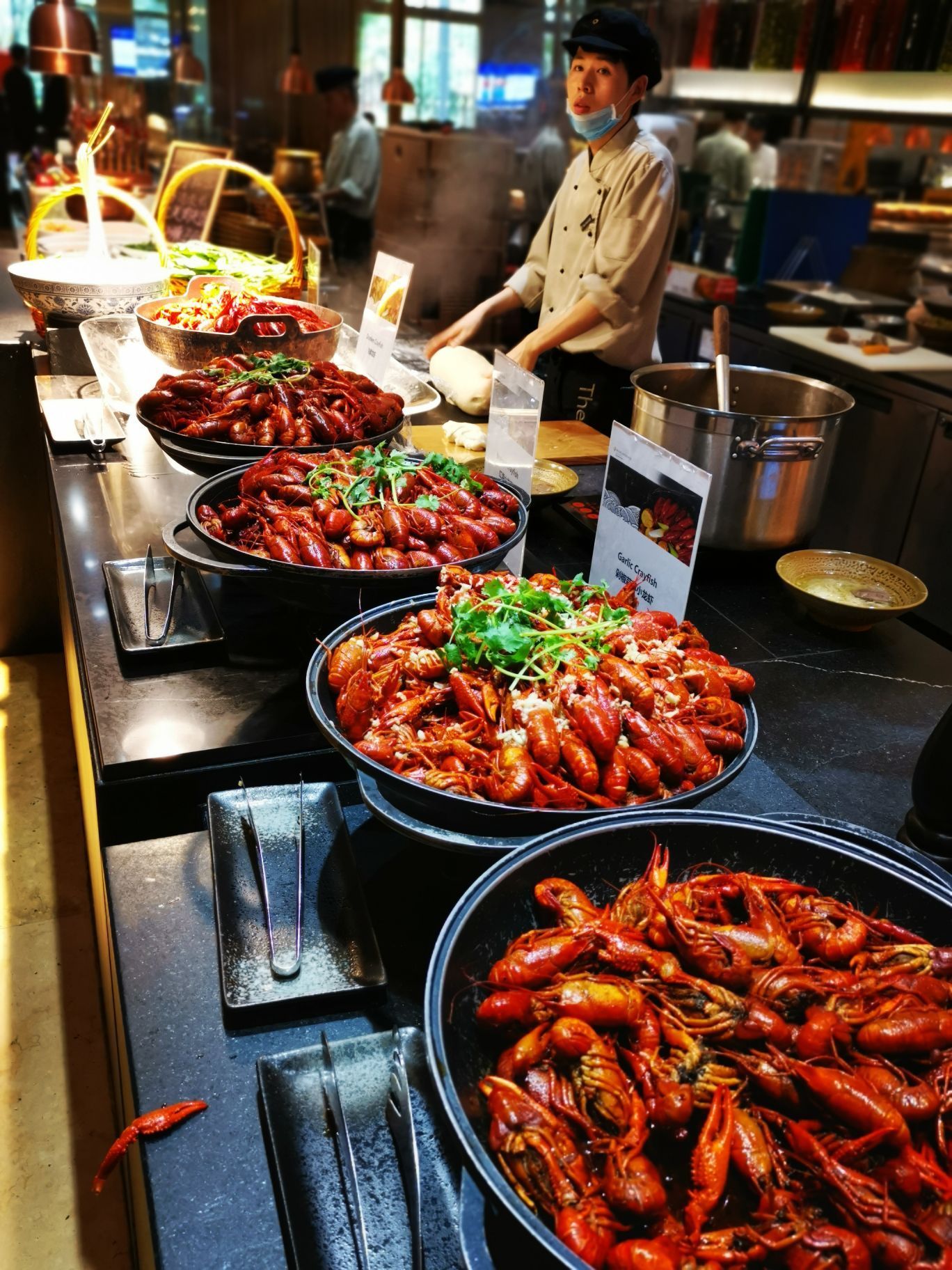 洲际的自助餐已经吃过好几回,每次有特别的美食节主题都会来。这次邀请了意大利米一星主厨,虽然只是一星,对于昆明这种米其林荒漠城市也是难得。 活动第一天就去了,幸好提前订座,6点就基本满座。菜品除了保持平时的数量,增加了大厨的好几种作品,颜值和味道都还不错,而且胖胖的大厨一直面带微笑,从不拒绝拍照。榴莲蛋挞味道很赞,可惜吃饱了才发现……恰逢龙虾节,各种口味的小龙虾任吃,价格比平时略贵,但还是值得。 这次唯一的缺点果汁只有两种,毕竟300多块的自助,不能太寒酸吧!