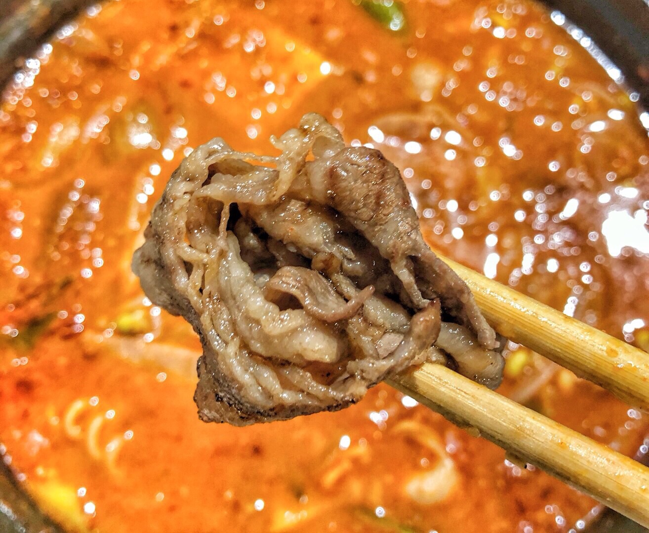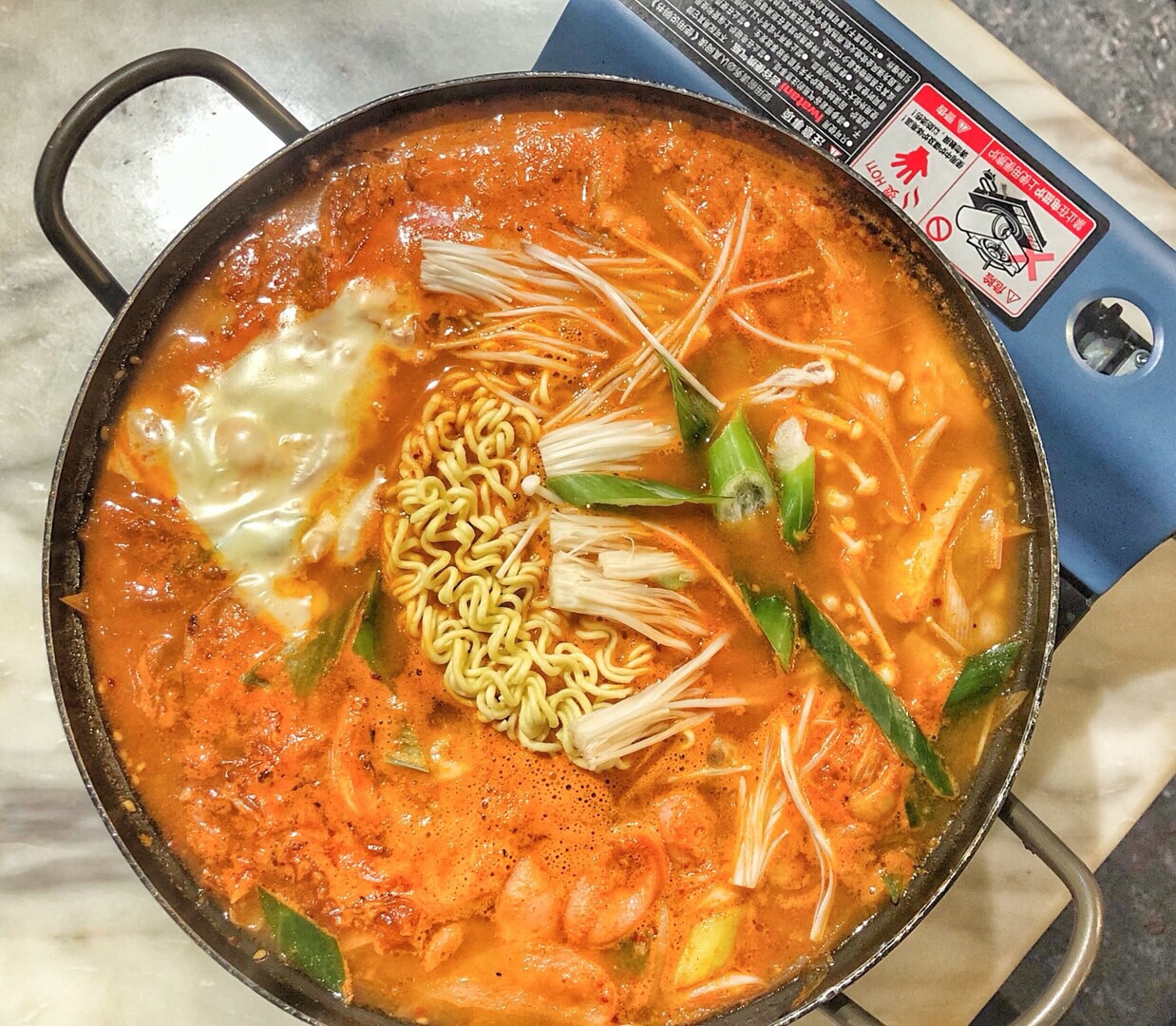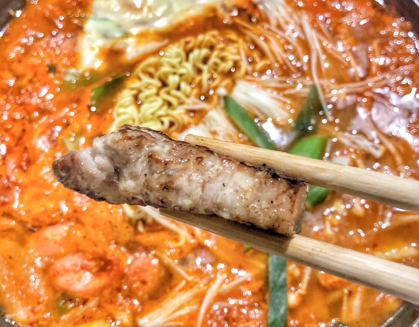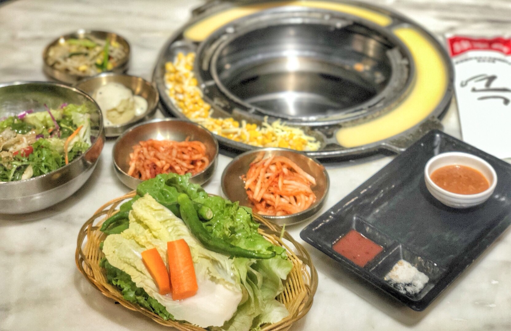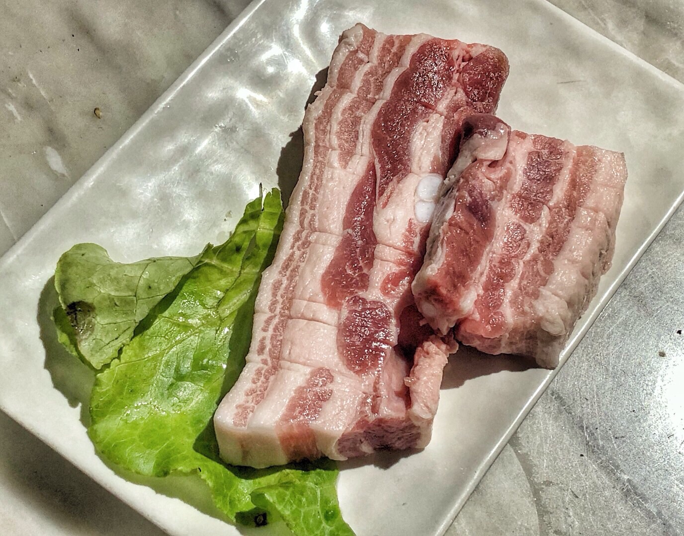 魔都第一家开在虹泉路 现在有4家门店了 饭点座无虚席 进店没有浓重的烤肉味 每桌都有服务铃 叫起来比较方便 餐前小食五碟 分别是蔬菜色拉、土豆泥、凉拌豆芽及酱萝卜 稀饭土豆泥的质感 可里面夹杂的豌豆差评 太硬了 全程自己烤肉 烤盘围边附赠鸡蛋羹和芝士玉米 吃完加料 需另收5元/份 「冷鲜五花肉」肉眼可见的肥>瘦 好在烤熟后表层坚脆 肉质紧 减少油腻感 还可以包生菜解腻 「猪排」调味太甜腻了 有点hold不住 「牛五花肉」肥瘦参半 汁水足 但吃口柴 不是细嫩的口感 「部队锅」泡菜口味的锅物 食材很丰富 有培根、红肠、香肠、鱼饼、鸡蛋、金针菇、大白菜和面条 口味大众 吃着管饱 口味方面不占优势 服务和环境可以再下功夫