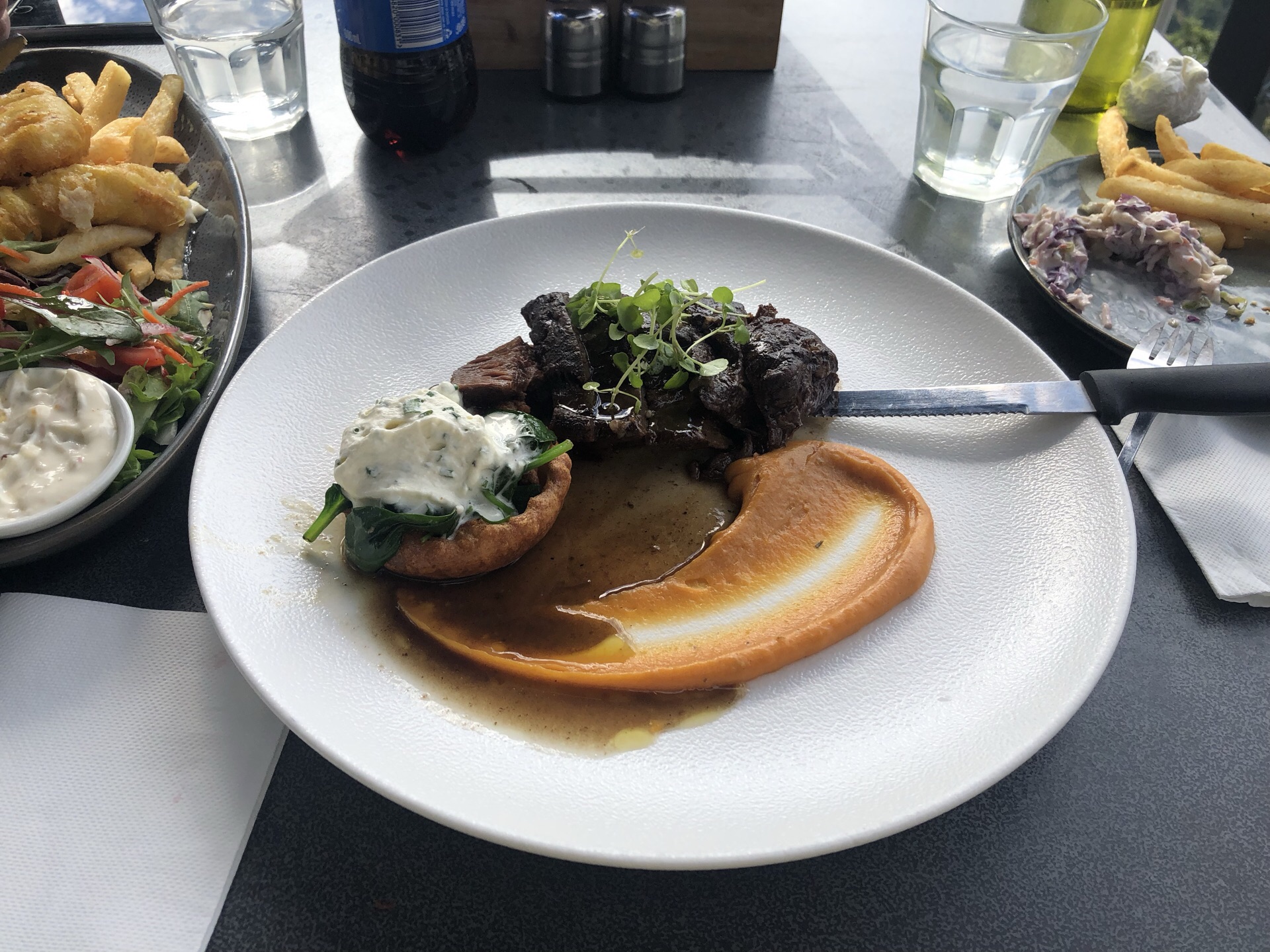 主要是风景超好,不预定的话可能你就坐不到室外直接面朝山景的座位了,饭点等候时间30-45分钟。 小孩餐适合8岁以下儿童,实在太 mini。还点了鱼排和炖猪肉,炖猪肉配合特色土豆泥很好吃。菜单有点难看懂,可以让服务员建议推荐菜。