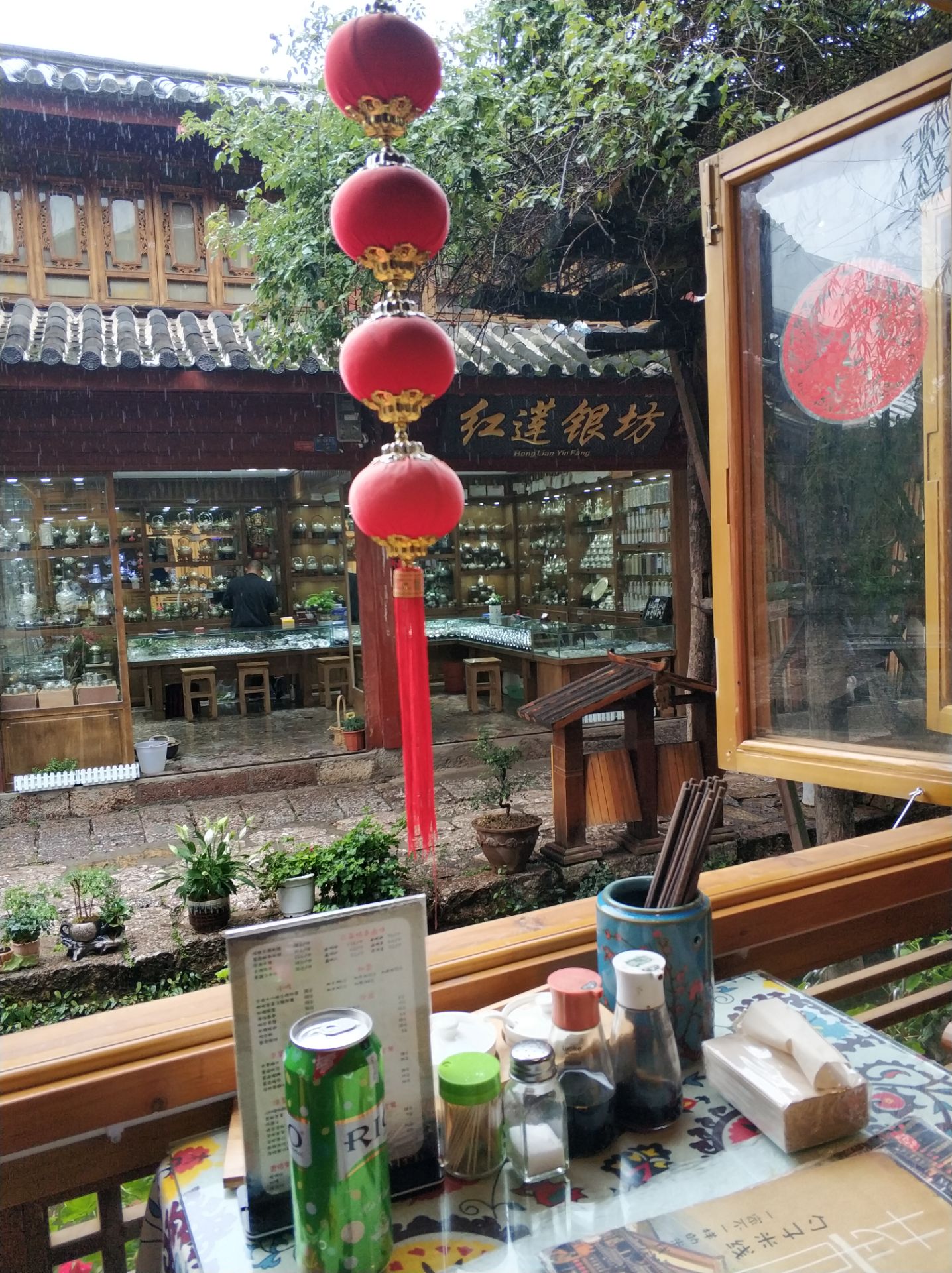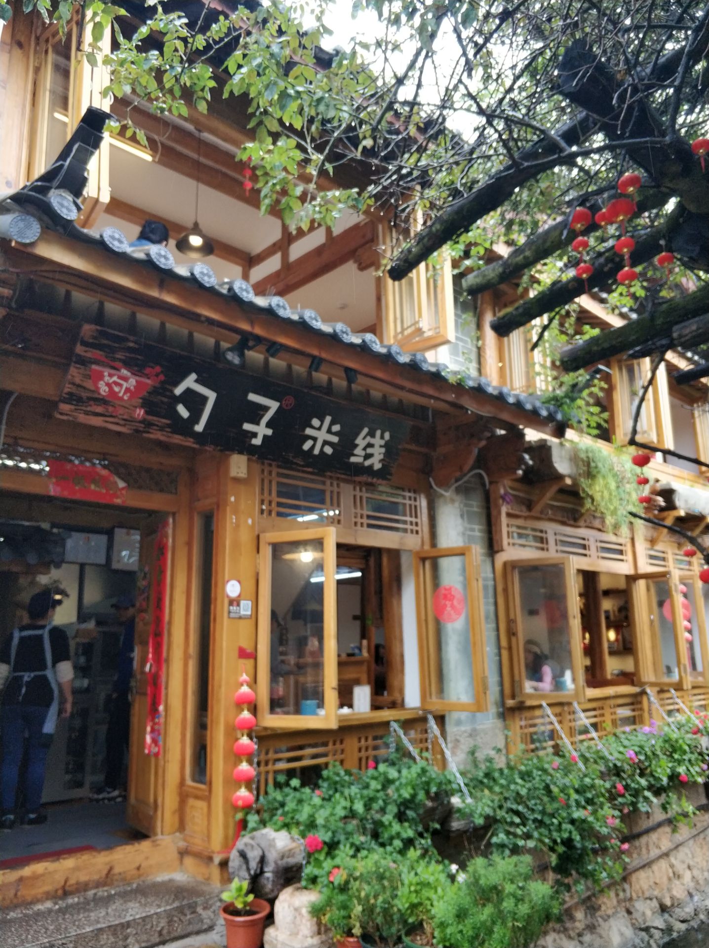 下雨,想找个地方吃点东西顺便看看风景,勺子米线评价很好,特意找过去尝一下。 店铺在主街后面的小街上,按导航差点以为走错了。 店铺环境很好,推窗见景。 鸡汤米线很鲜。炸菌菇很香。牛奶鸡蛋醪糟好喝。价格在景区算合适。