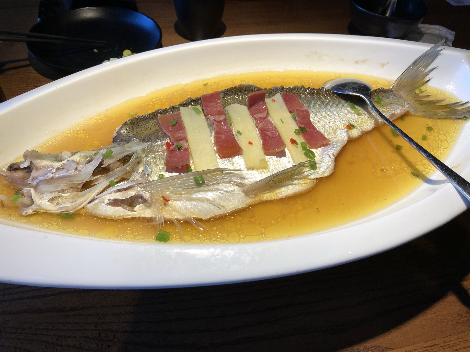 乔村二十八道外面看着不大,里面别有洞天,环境优雅清净,座位也很宽敞舒服。 套餐里的几道菜都很好吃,没有一道是踩雷的,必吃榜实至名归啊。牛油果三文鱼沙律,很新奇有趣,牛油果里面裹着三文鱼,芒果块和沙拉酱。 花雕酒蒸长江白条,端上来时香气四溢,只是白条鱼刺比较多,鱼肉吃起来有股土腥味儿。 佛跳墙,第一次吃到,里面有小鲍鱼,海参,鱼肚,香菇和鹌鹑蛋,金色的汤汁,把米饭倒进去,拌着吃,奢华的美味啊。 黑松露菌菇饺,晶莹剔透的饺子皮,里面包着杏鲍菇,西葫芦和黑松露,馅调的偏咸了些。 墨色流沙包,黑色的外皮,金黄色的馅,看着就很诱人,一份才两个,吃着不过瘾啊。 桂花酸梅汤,冰块放太多了,喝着很清爽。