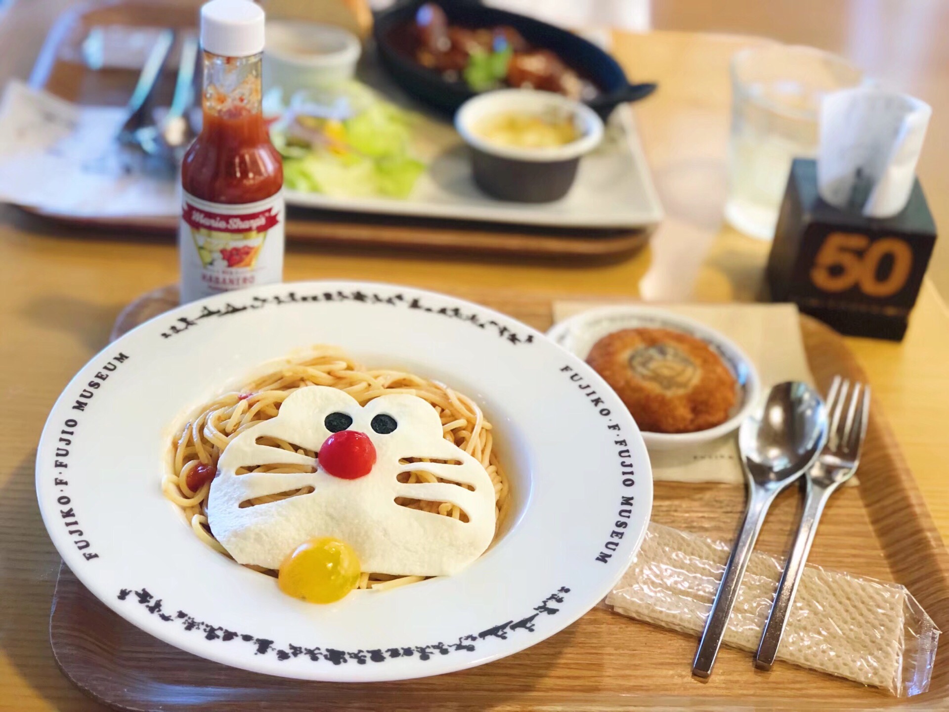 作为哆啦A梦的小迷妹,东京之行特地来藤子不二雄博物馆朝圣。 午餐就在哆啦A梦咖啡馆里ci。人气很旺,取过号后大概半小时左右排到。 这里所有的食物都是围绕哆啦A梦的,至于好不好吃,反而没那么重要咯。 哆啦A梦意面配可乐饼 可爱的哆啦A梦大头造型,意面就是普通的意面,没什么记忆点。搭配的可乐饼不错吃现炸的,酥香可口。 红酒烩牛肉配记忆面包 这道也很平常,搭配的记忆面包是亮点。 哆啦A梦西柚果汁 蓝色的哆啦A梦小嘴巴造型很可爱,拍照片的好背景。 哆啦A梦拉花拿铁 拉花是巧克力粉撒上去的,咖啡略清淡。