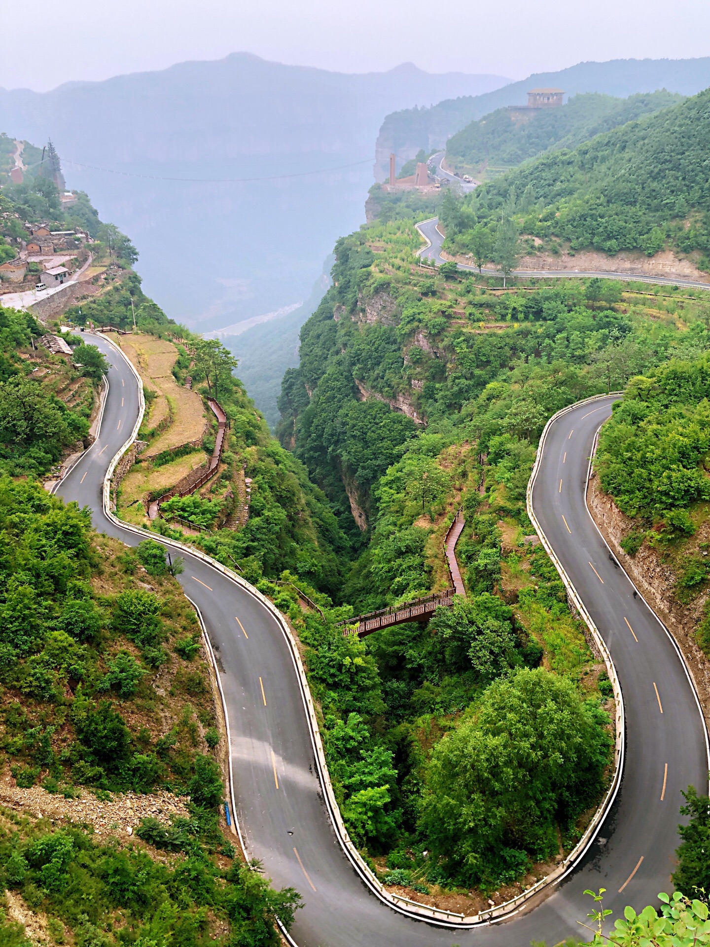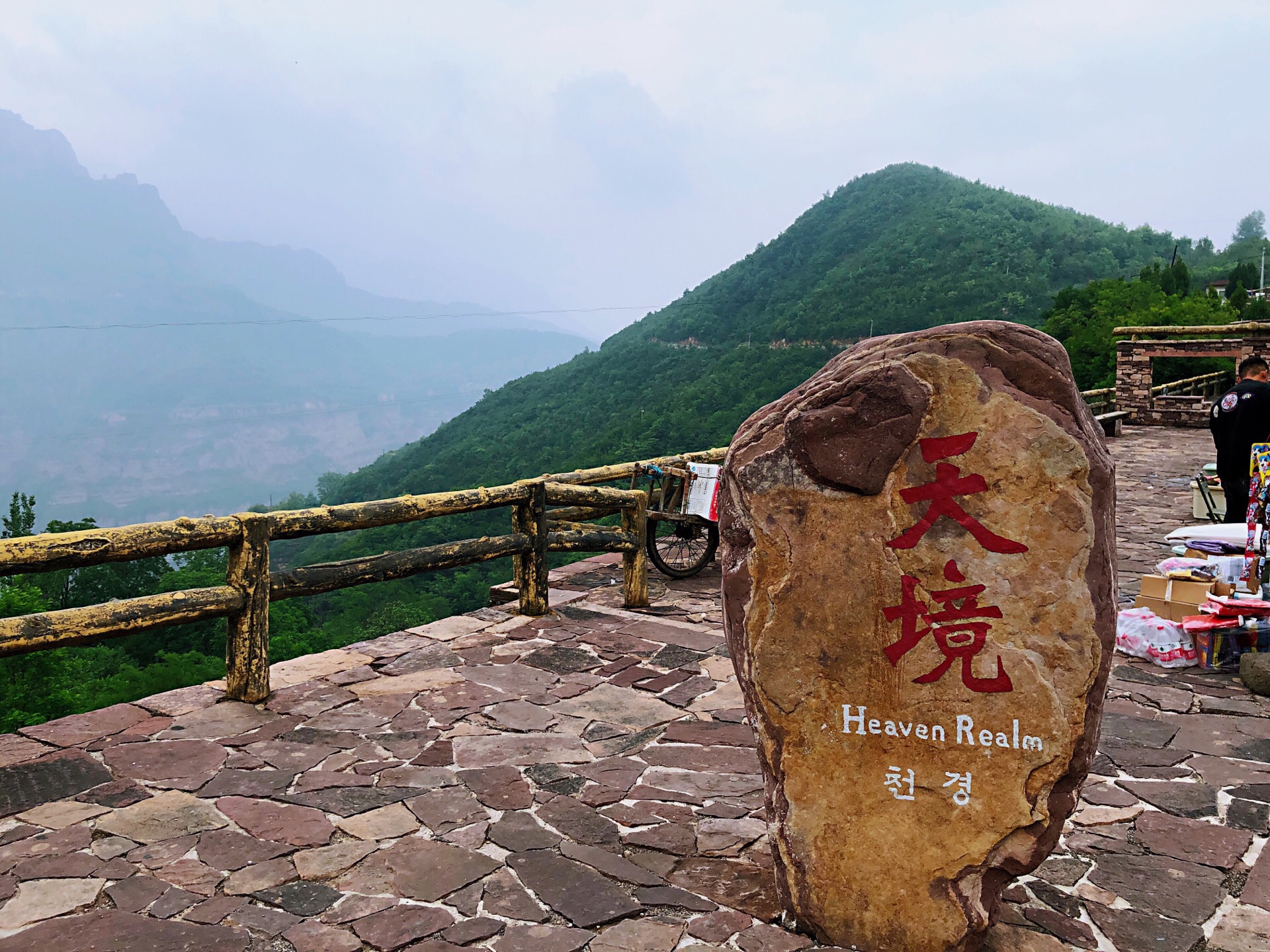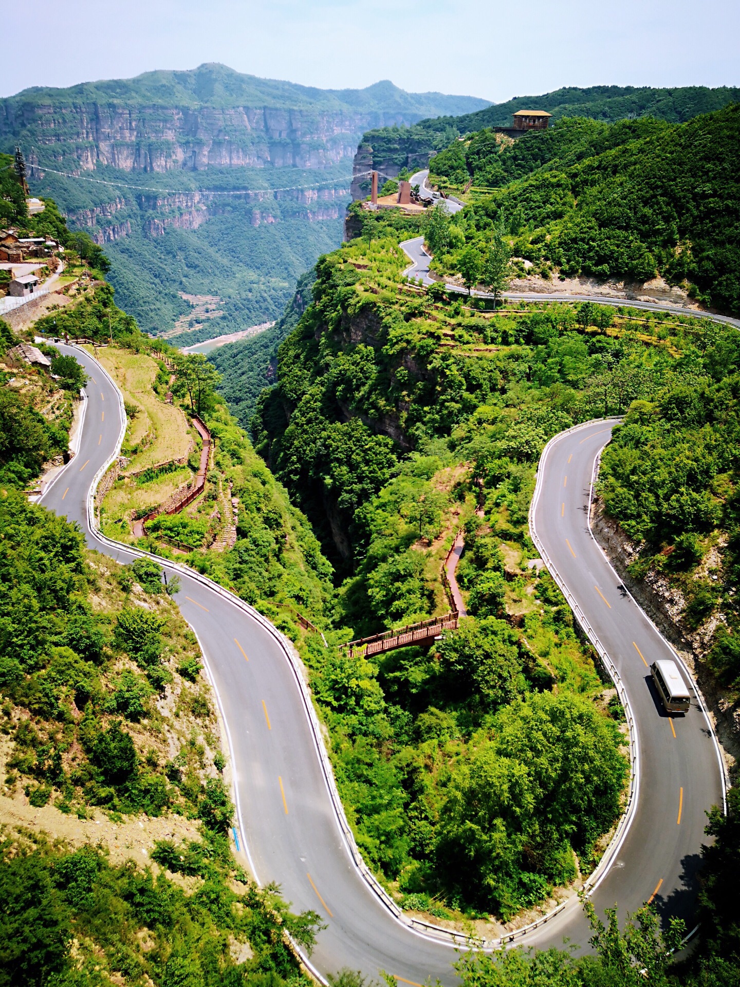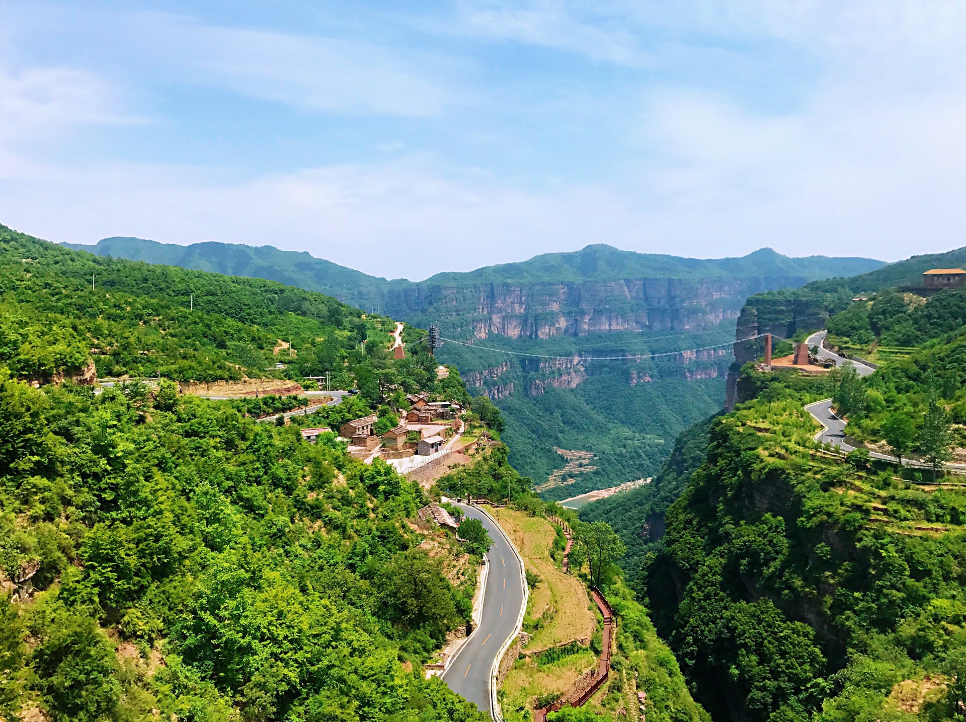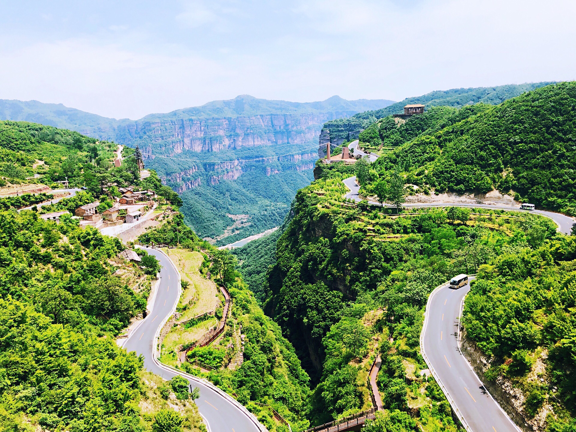 我们乘坐观光车行走在太行天路上时,犹如置身于百里画廊中,满眼望去,处处是气势磅礴的美丽山水画卷,相对高差达1000米的深邃峡谷、刀削斧劈般直立的岩壁……由于时间紧张只游览了太行天路,参观了沿线的观景台。到达的第一个观景台叫“天境”观景台,这应该是太行天路的最高点。临栏远眺,峡谷沟壑交错,俊秀深邃,真是一个集无限风光于一身的山水胜地。这些美景不知激起了多少艺术家的创作激情! 俯瞰太行山壮美风光,更感神清气爽,感觉心胸象大海一样的宽敞,心中只有美景而杂念全消。