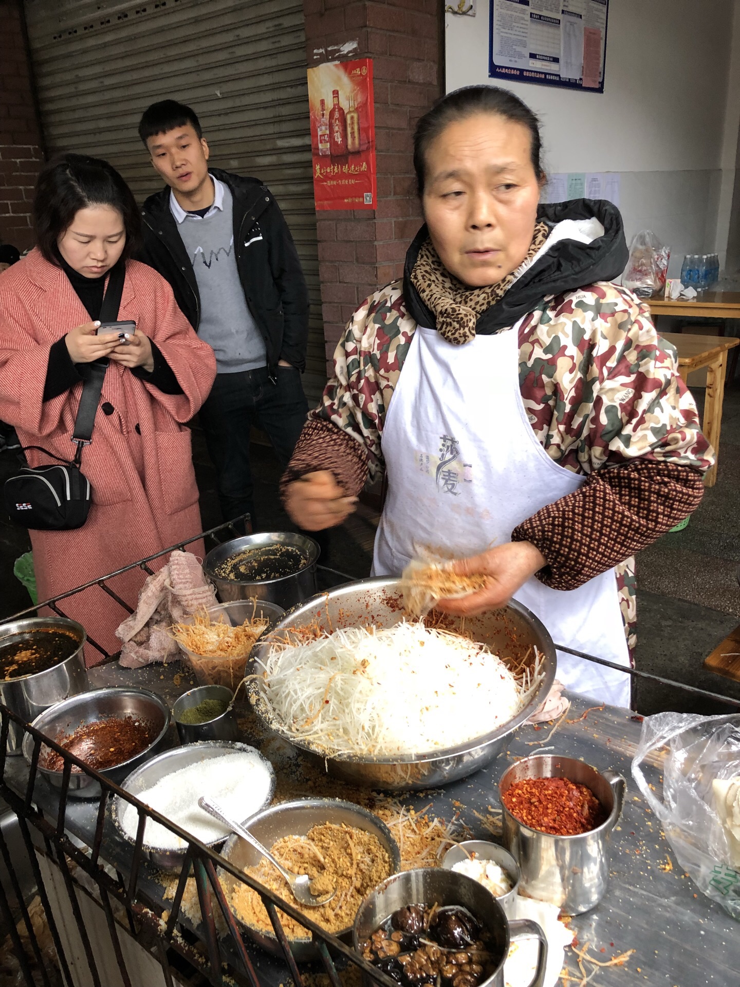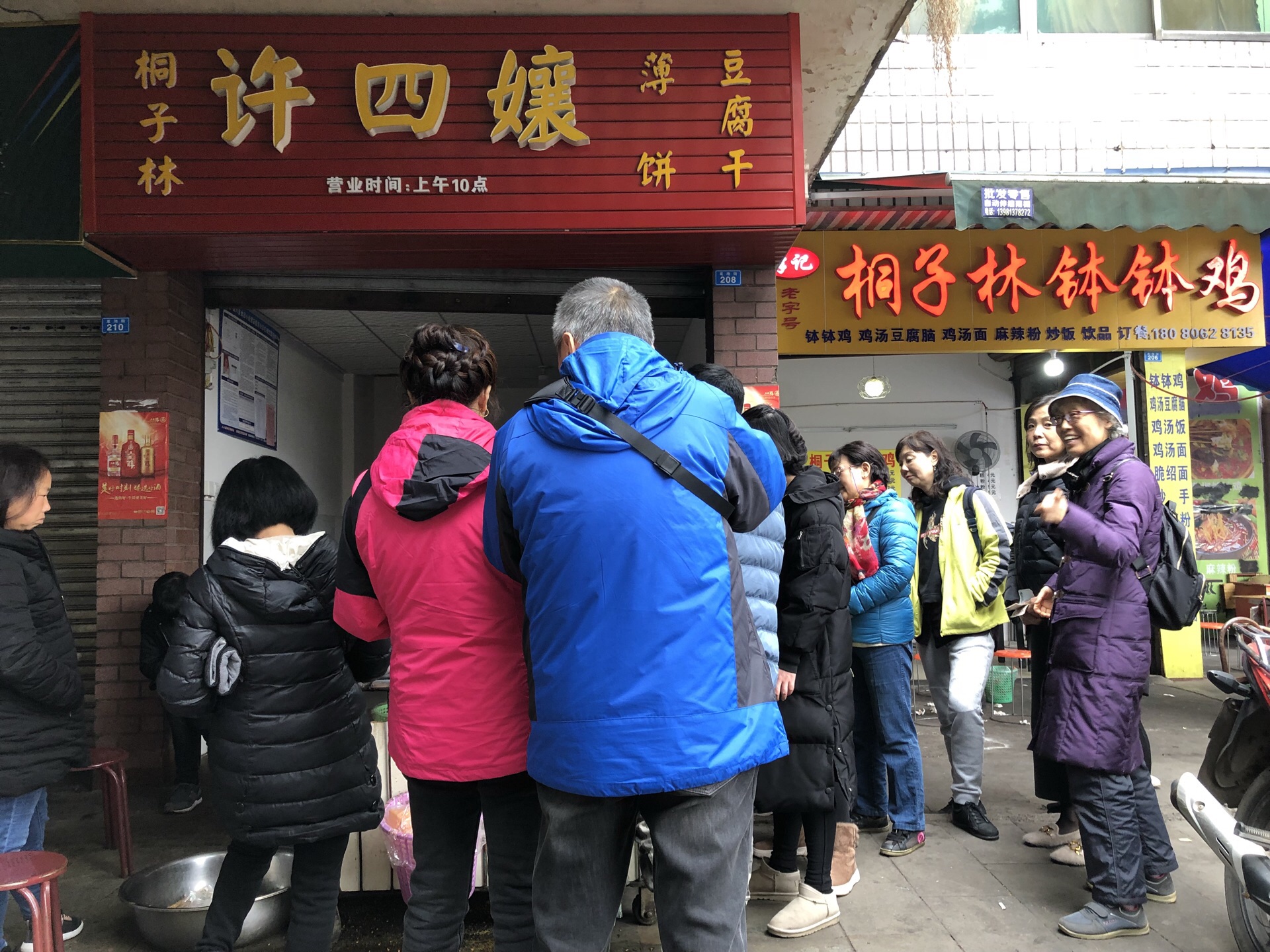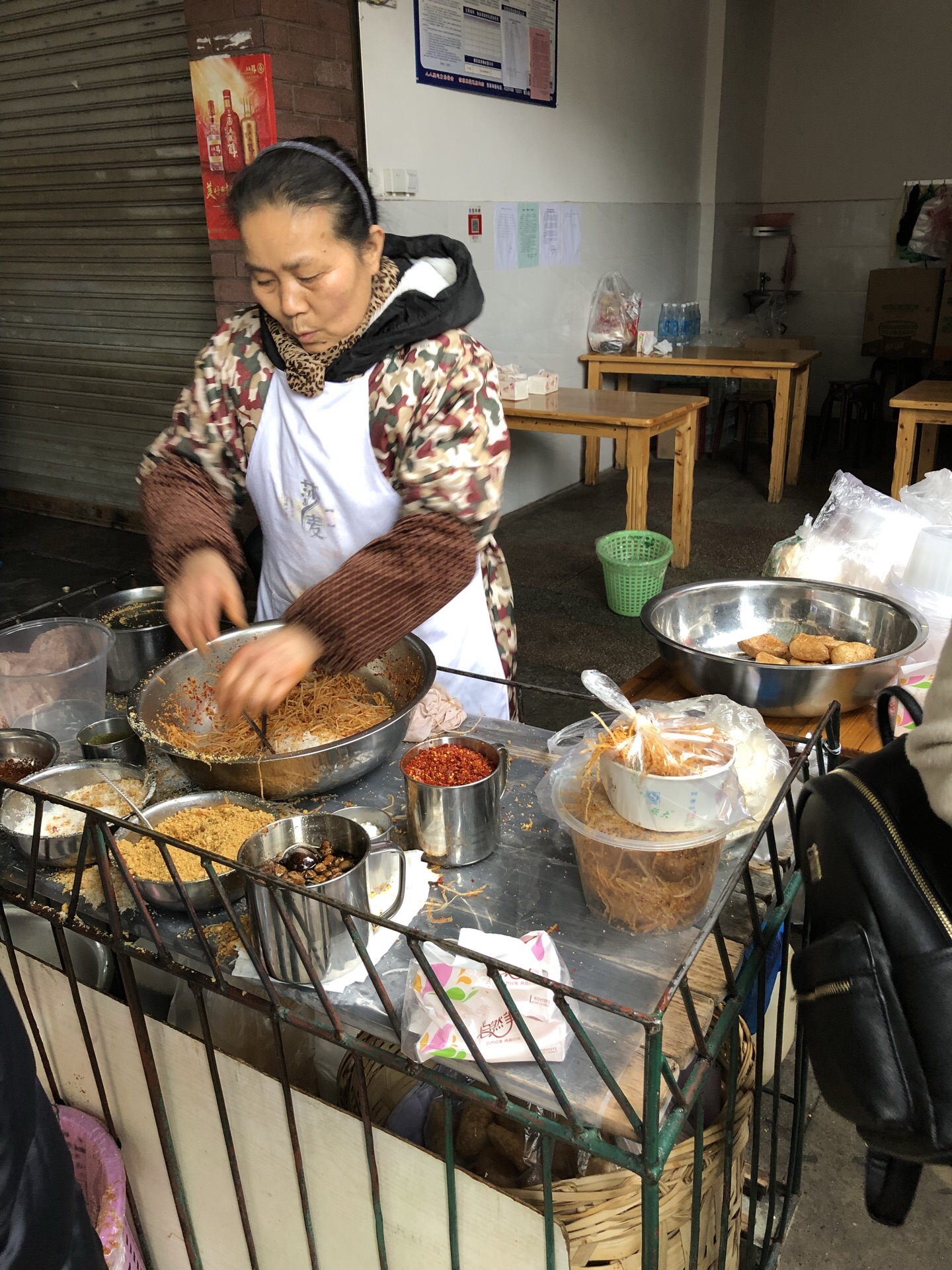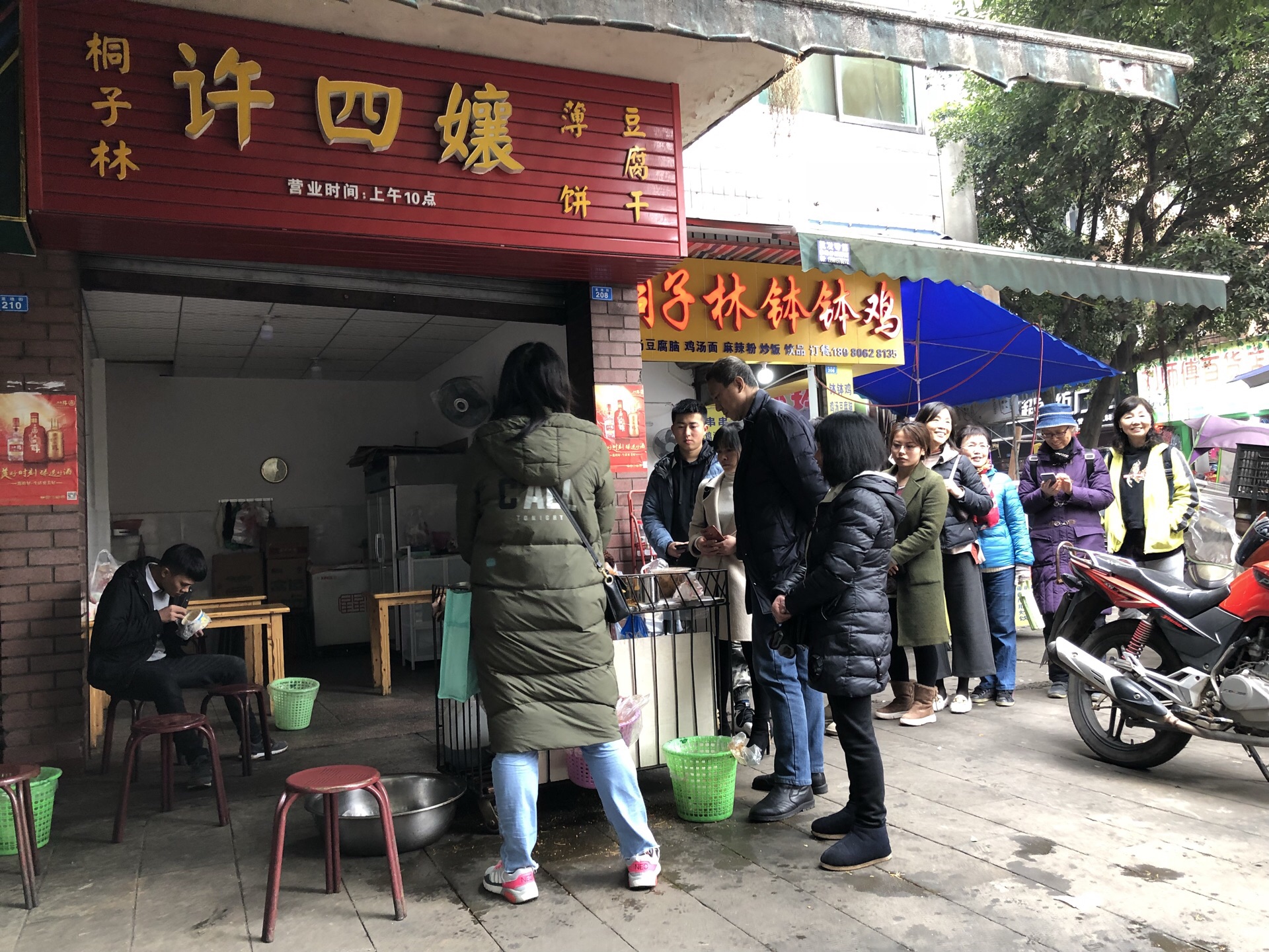 去犍为旅游,搜了排名居前的美食,桐子林许四孃薄饼豆腐干也是当地著名小吃啊。上次去犍为,早上离开时还没开门,这次一定要吃到。到了犍为先去这家,好在排的队还不算长。许四孃一人独撑店前的摊位,动作非常麻利,同时耐心回答我们的问题,前面排的当地食客也热心给我们介绍。若非亲眼所见,难以相信一个小小的豆腐干(三角形油炸豆腐)、一张薄饼(类似我们的春卷)能卷进那么多的馅料和调料,然后在醋里浸一下,酸甜辣香的成品就可以吃啦。我吃了一个豆腐干一个薄饼,味道真的很不错,关键是很有特色。酸甜辣加上白糖的沙沙感,真是有点奇妙的爽口诶。个人觉得豆腐干更好吃,脆脆的。薄饼浸了醋,吃到下段很酸了。总之都好吃,可以要求少放辣椒,不过我都吃的正宗的。