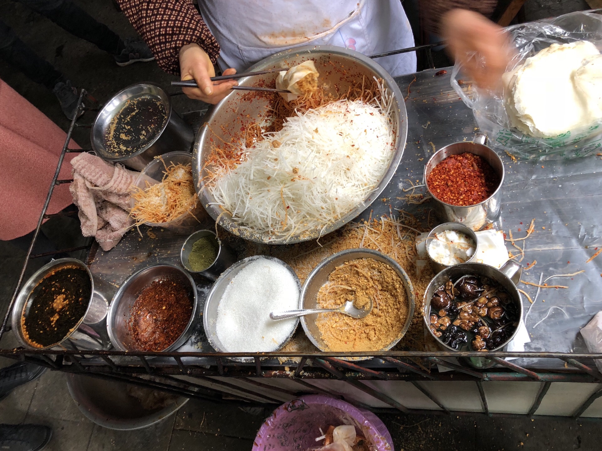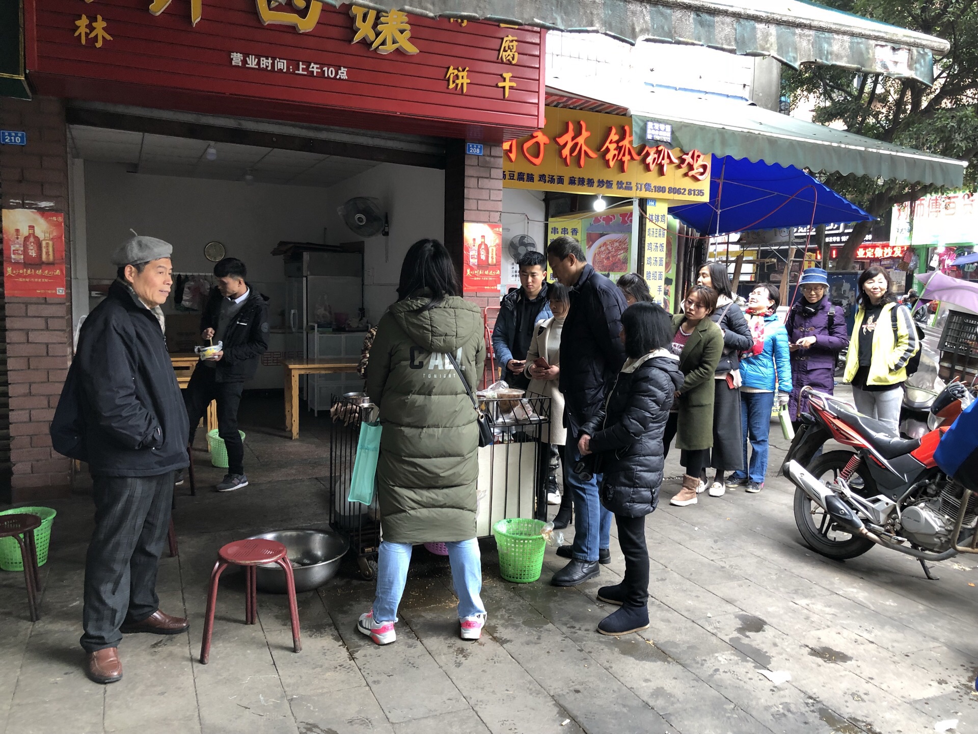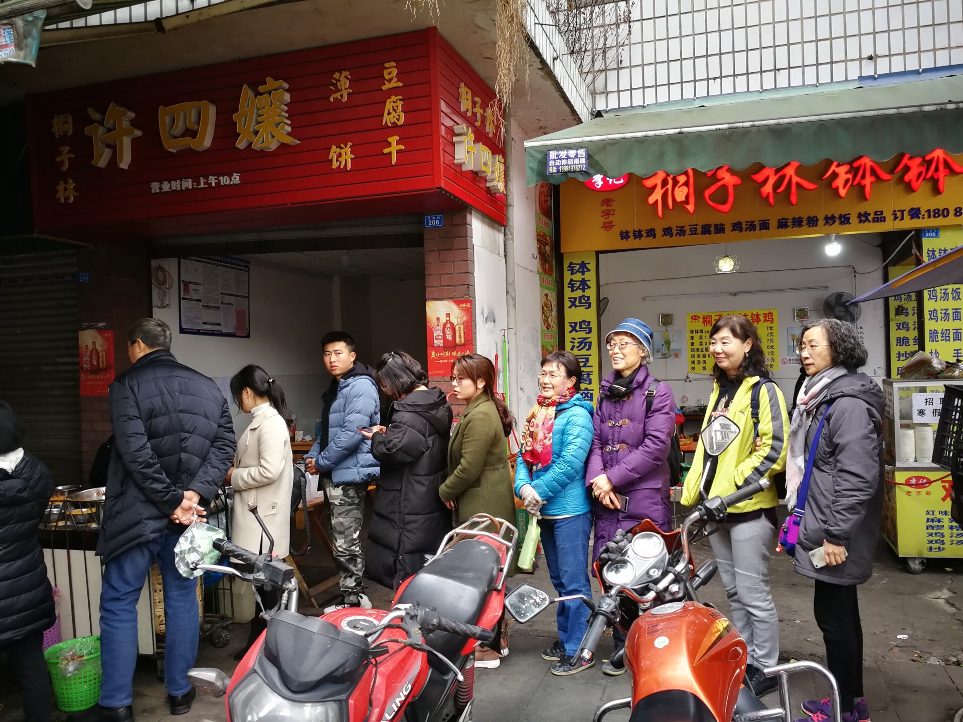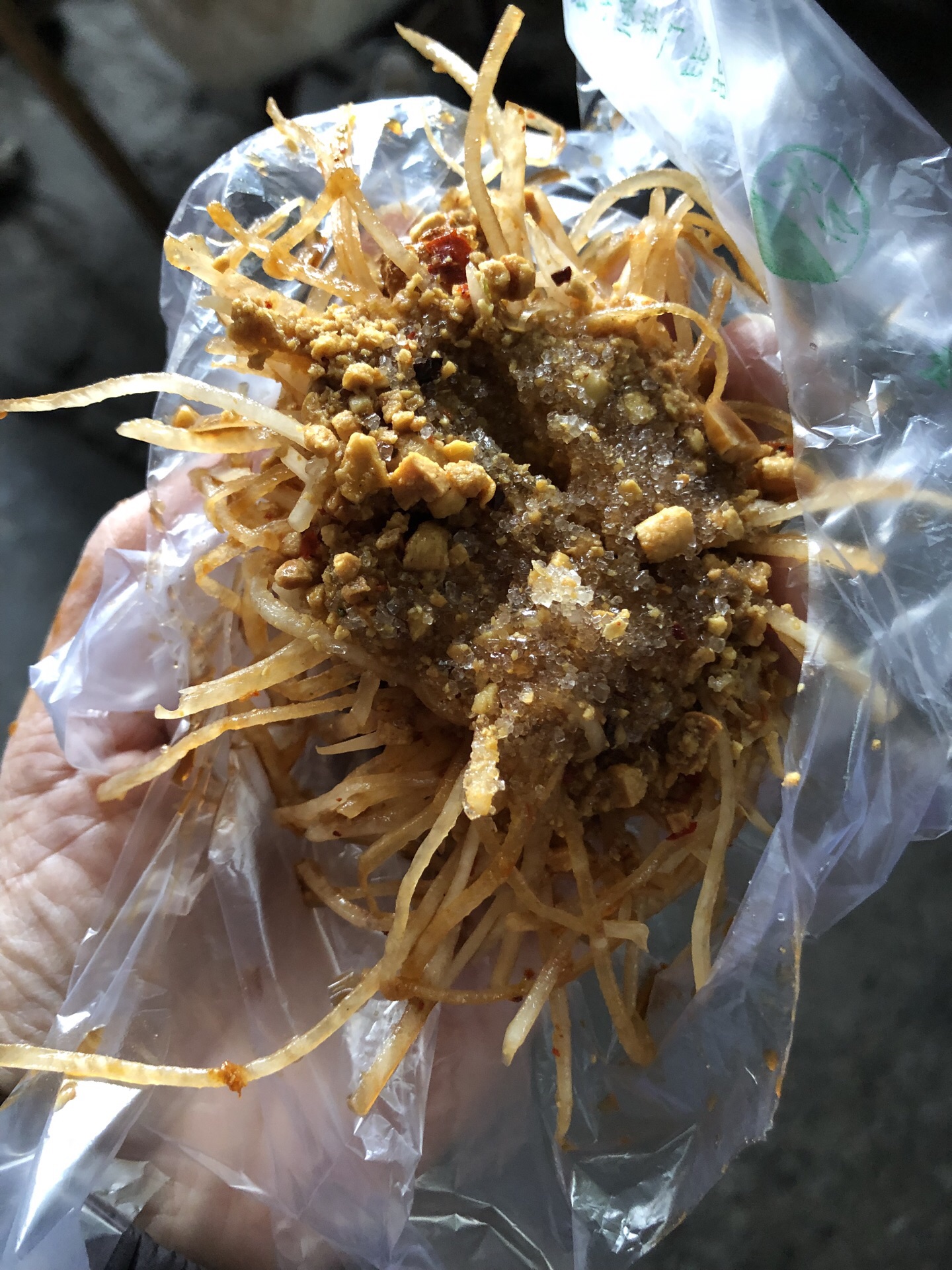 去犍为旅游,搜了排名居前的美食,桐子林许四孃薄饼豆腐干也是当地著名小吃啊。上次去犍为,早上离开时还没开门,这次一定要吃到。到了犍为先去这家,好在排的队还不算长。许四孃一人独撑店前的摊位,动作非常麻利,同时耐心回答我们的问题,前面排的当地食客也热心给我们介绍。若非亲眼所见,难以相信一个小小的豆腐干(三角形油炸豆腐)、一张薄饼(类似我们的春卷)能卷进那么多的馅料和调料,然后在醋里浸一下,酸甜辣香的成品就可以吃啦。我吃了一个豆腐干一个薄饼,味道真的很不错,关键是很有特色。酸甜辣加上白糖的沙沙感,真是有点奇妙的爽口诶。个人觉得豆腐干更好吃,脆脆的。薄饼浸了醋,吃到下段很酸了。总之都好吃,可以要求少放辣椒,不过我都吃的正宗的。